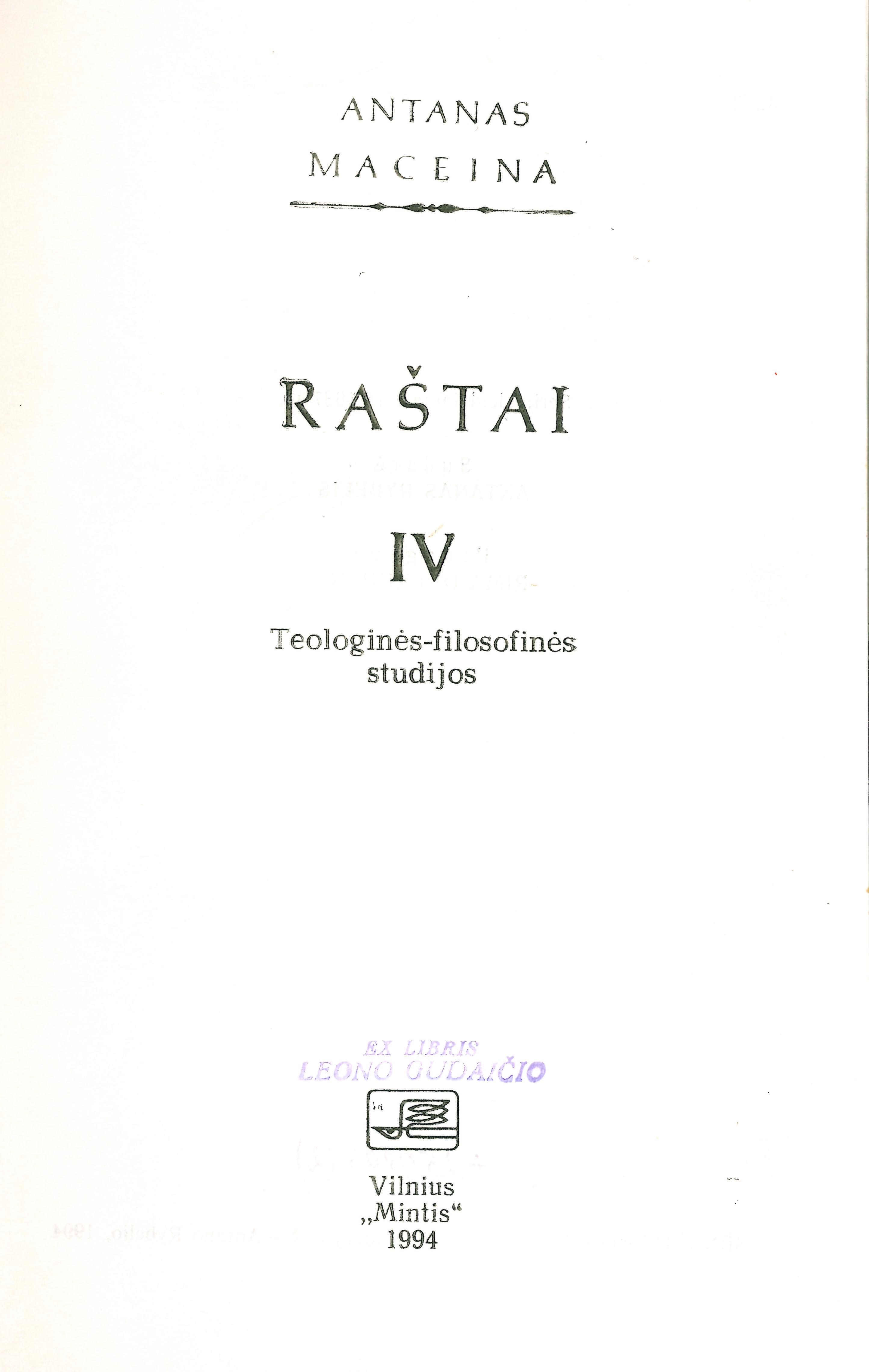 | Antraštė | Raštai. T. 4: Teologinės-filosofinės studijos / Antanas Maceina; sudarė Antanas Rybelis. – Vilnius: Mintis, 1994. – 675 p. [lt] |