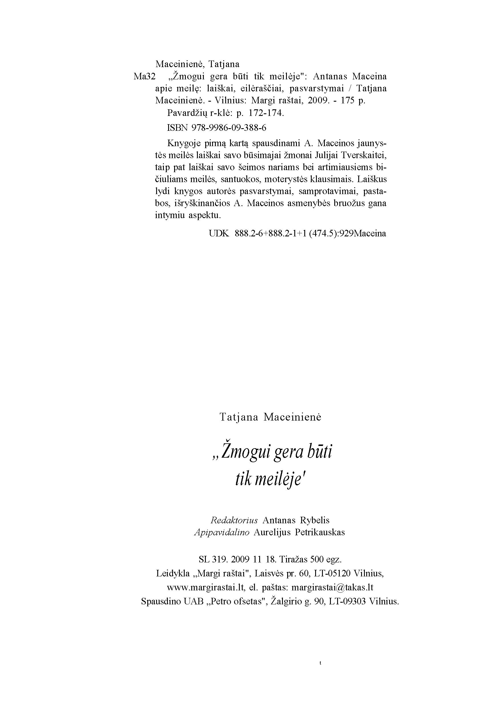 | "Žmogui gera būti tik meilėje": Antanas Maceina apie Meilę: laiškai, eilėraščiai, pasvarstymai... / [sudarytoja] Tatjana Maceinienė. – Vilnius: Margi raštai, 2009. – 173, [2] p. [lt] | |