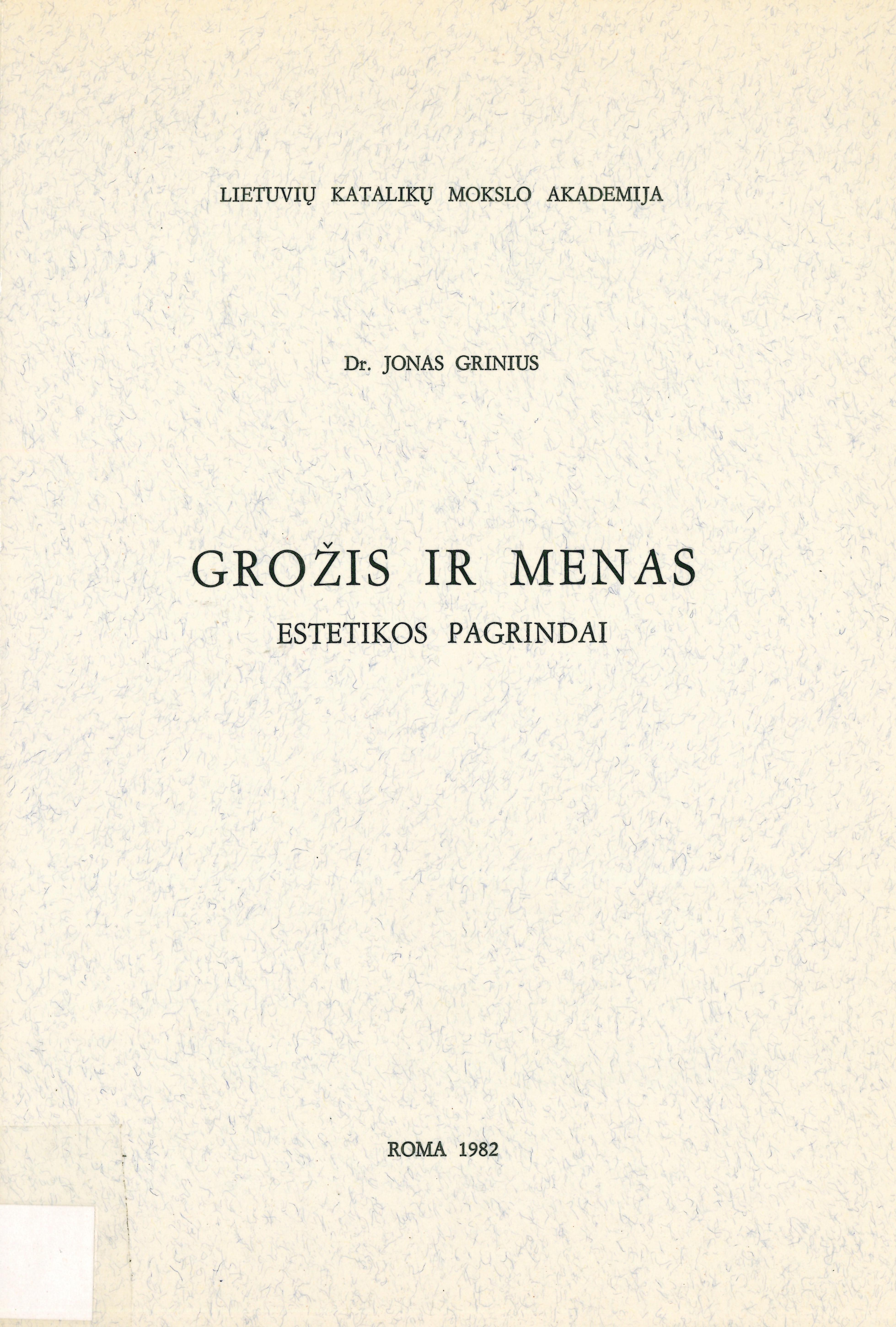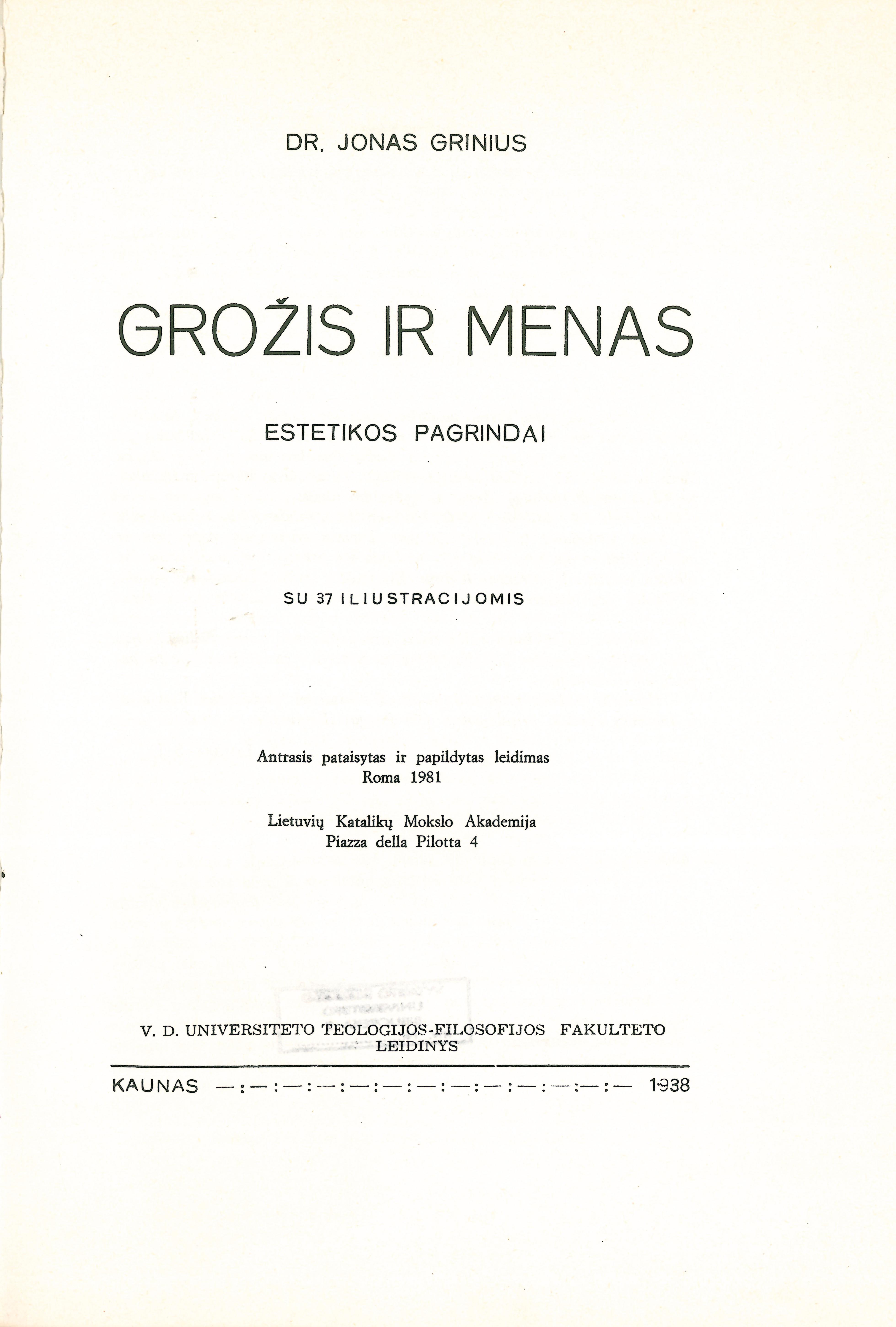 Antraštė Grožis ir menas: estetikos pagrindai / Jonas Grinius. – 2–asis pataisytas ir papildytas leidimas. – Roma: Lietuvių katalikų mokslo akademija, 1981. – 399, [40] p. [lt]