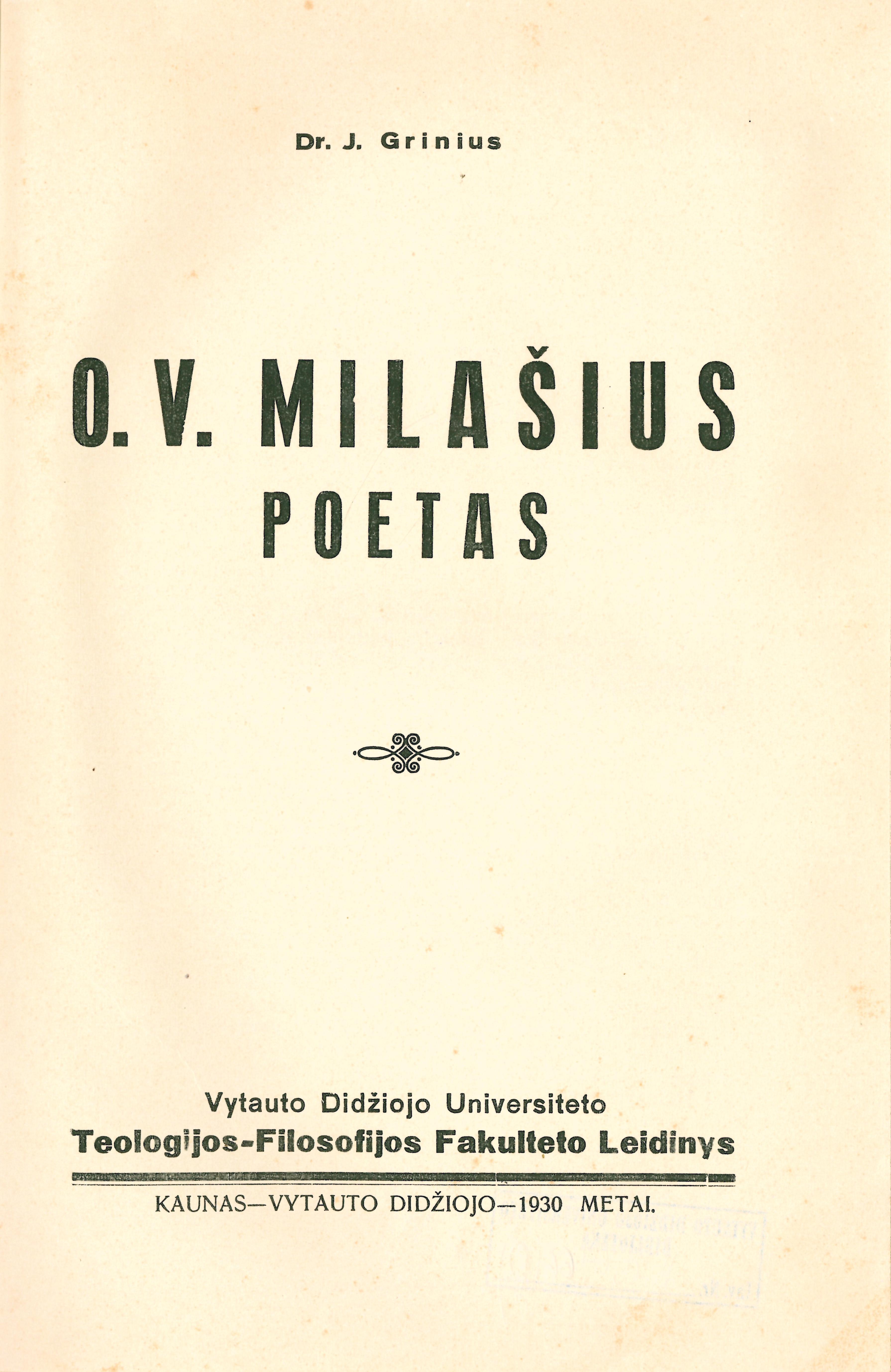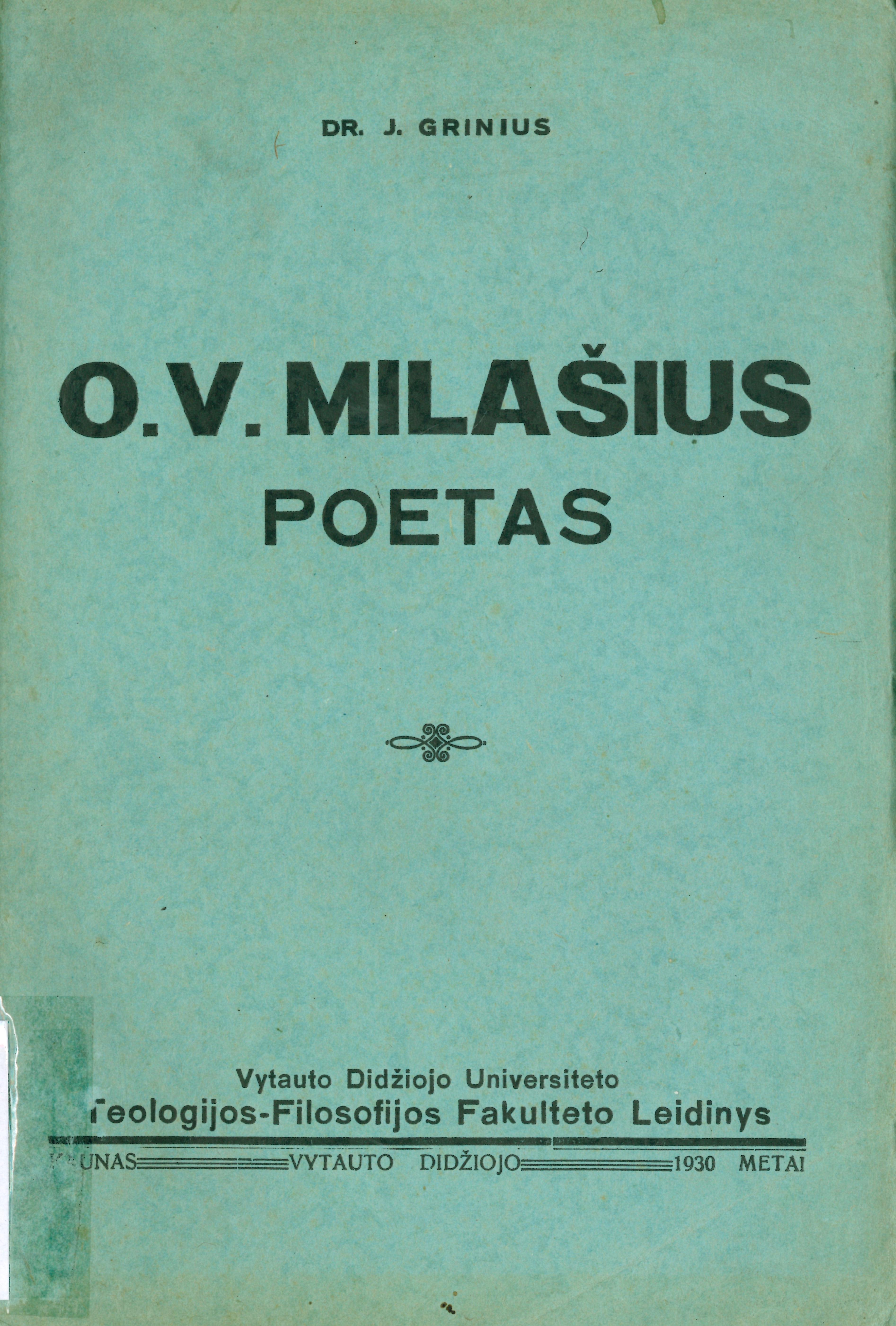 O. V. Milašius-poetas : disertacija daktaro laipsniui gauti Lietuvos universiteto Teologijos-Filosofijos fakultete / J. Grinius. – Kaunas : Vytauto Didžiojo universiteto Teologijos-filosofijos fakultetas, 1930. – XV, 196 p. : iliustr., portr., faks.