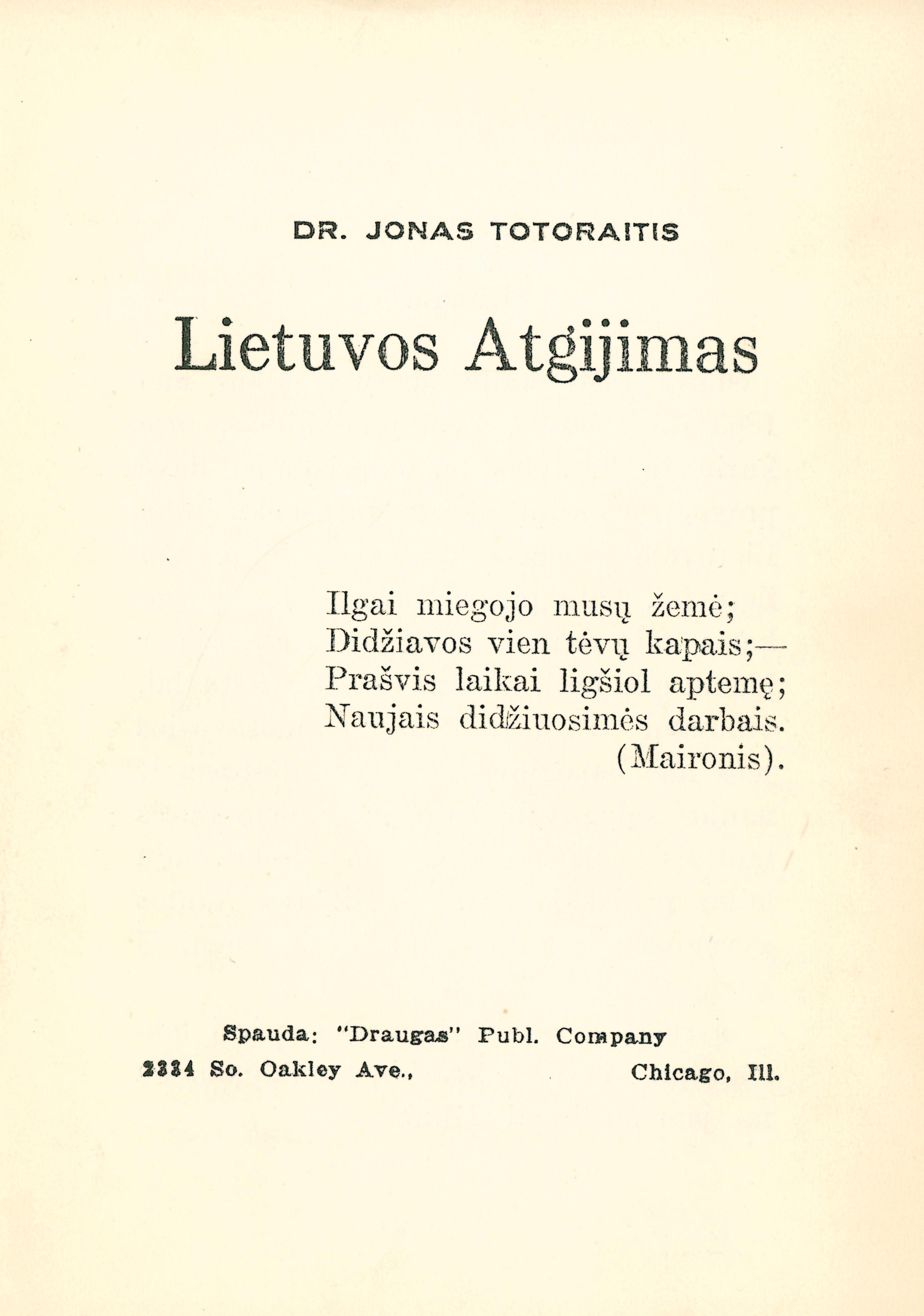 Published Chicago : Draugas, 1910