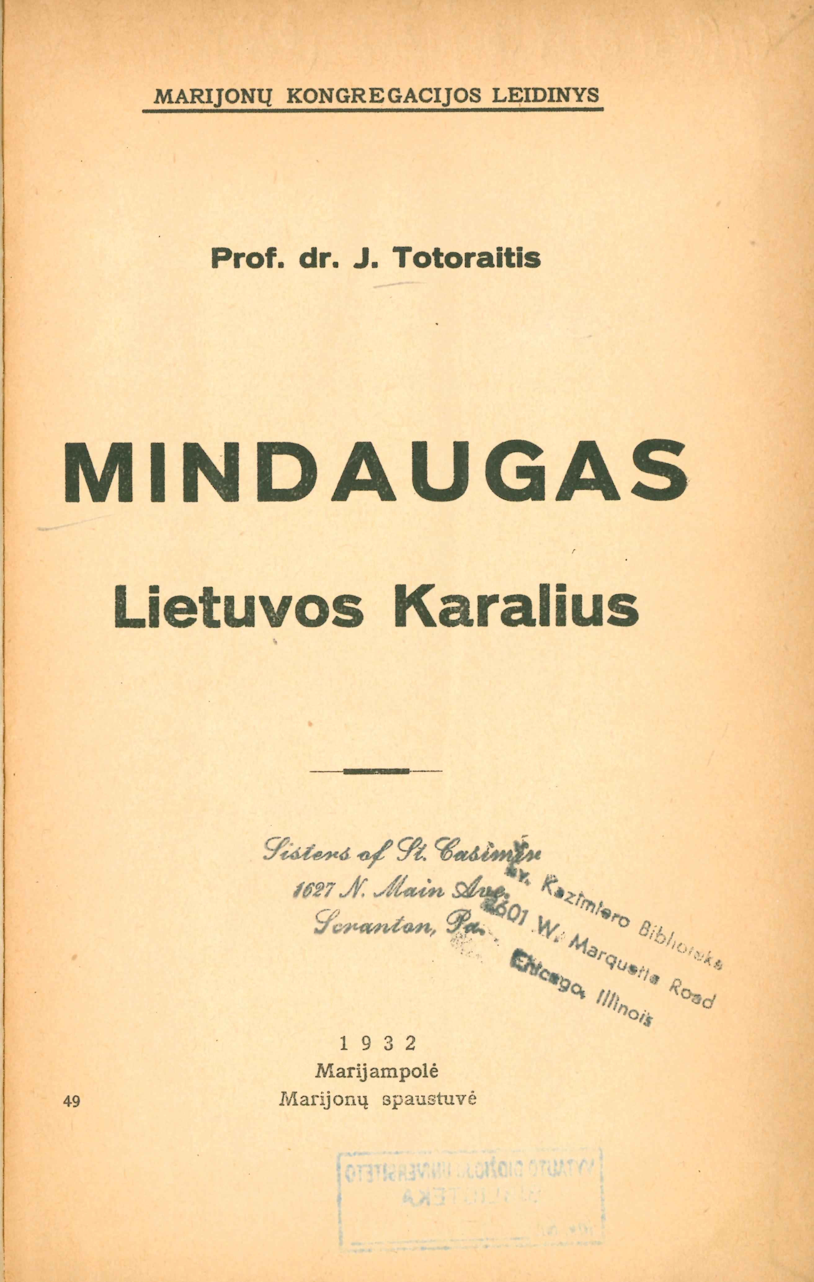 | Published | Marijampolė : Marijonų kongregacijos leidinys, 1932 |