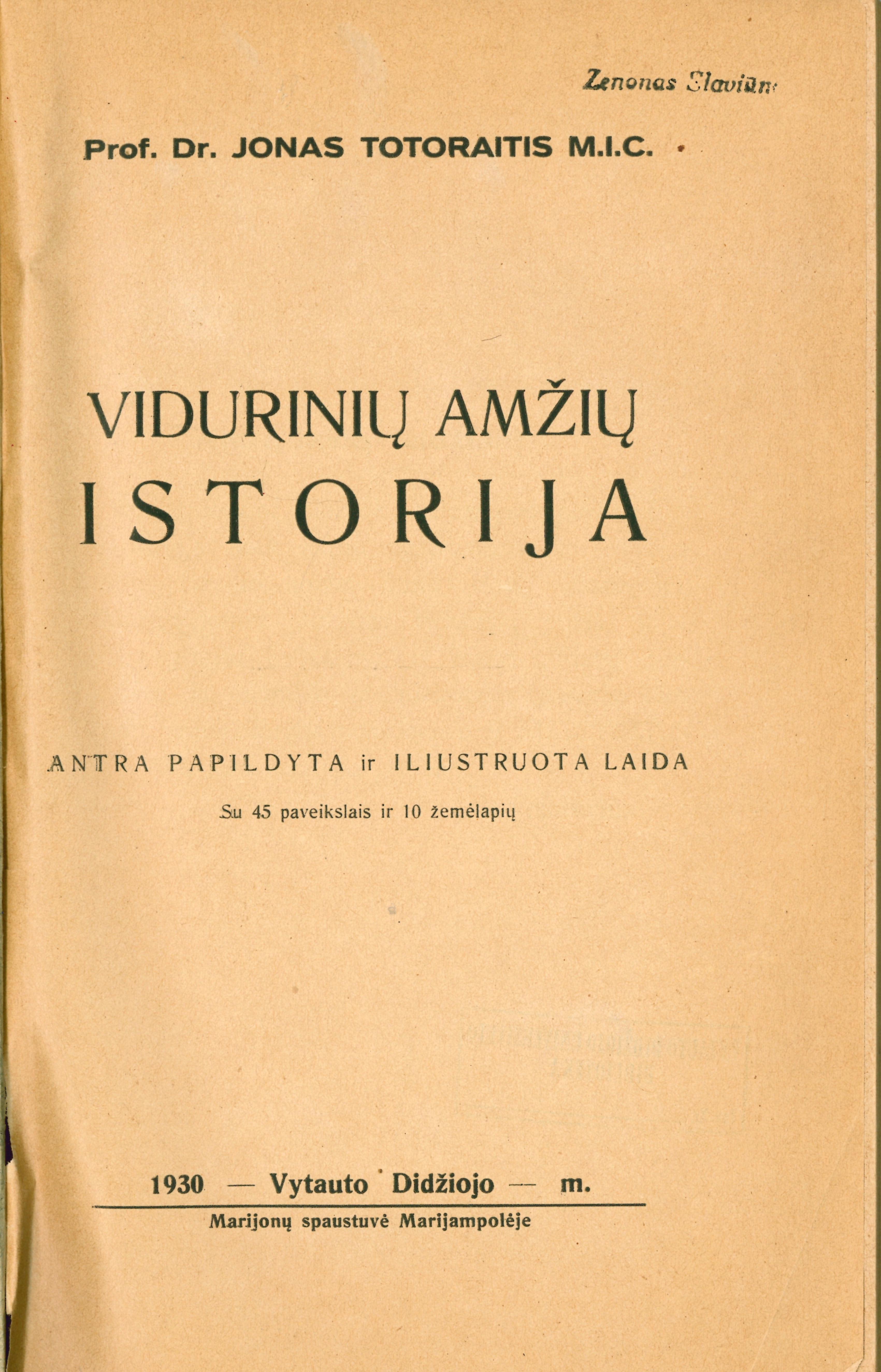| Antraštė | Vidurinių amžių istorija / Jonas Totoraitis. – 2-a papildyta ir iliustruota laida. – Marijampolė: [s.n.], 1930. – 280 p. [lt] |