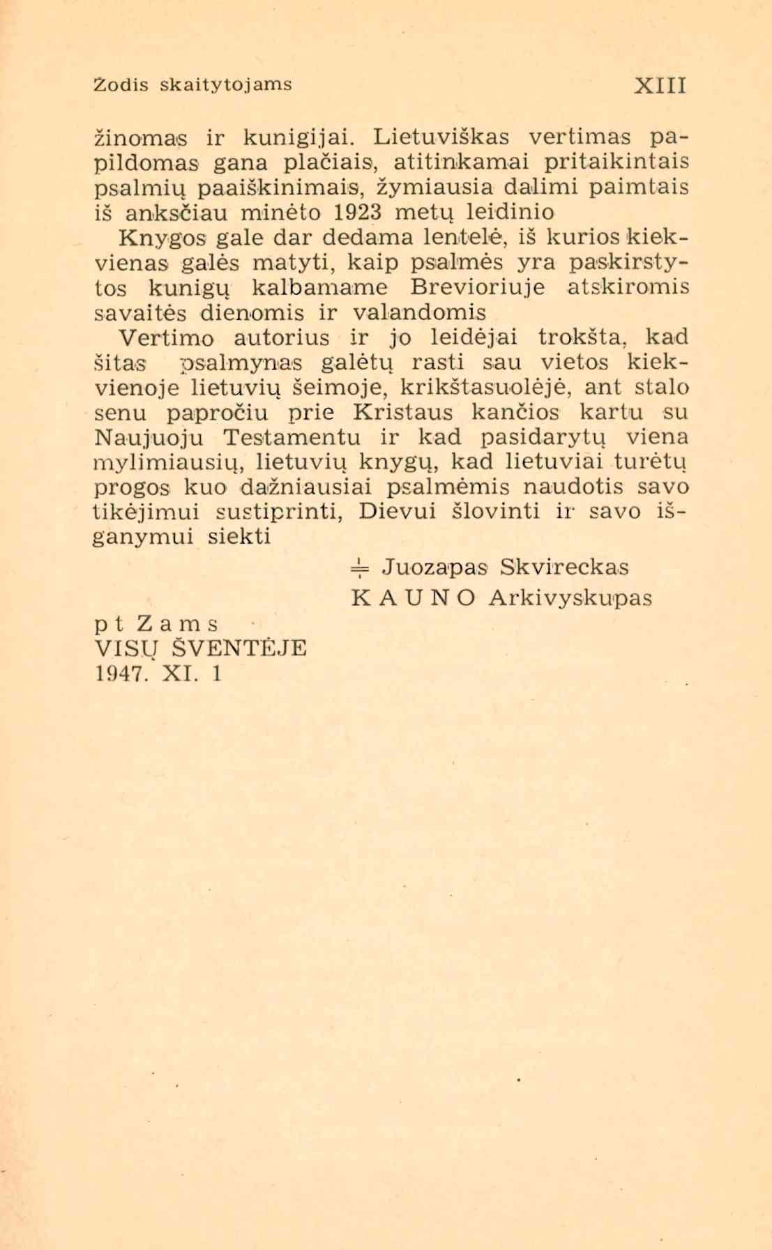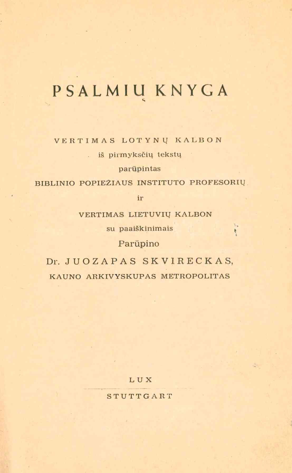 | Antraštė | Psalmių knyga. Vertimas lietuvių kalbon [su Vulgatos tekstu] / parūpino [išvertė ir komentarus parašė] Juozapas Skvireckas. - Stuttgart: Lux, 1949. – XIX, 521 p. [lt] |