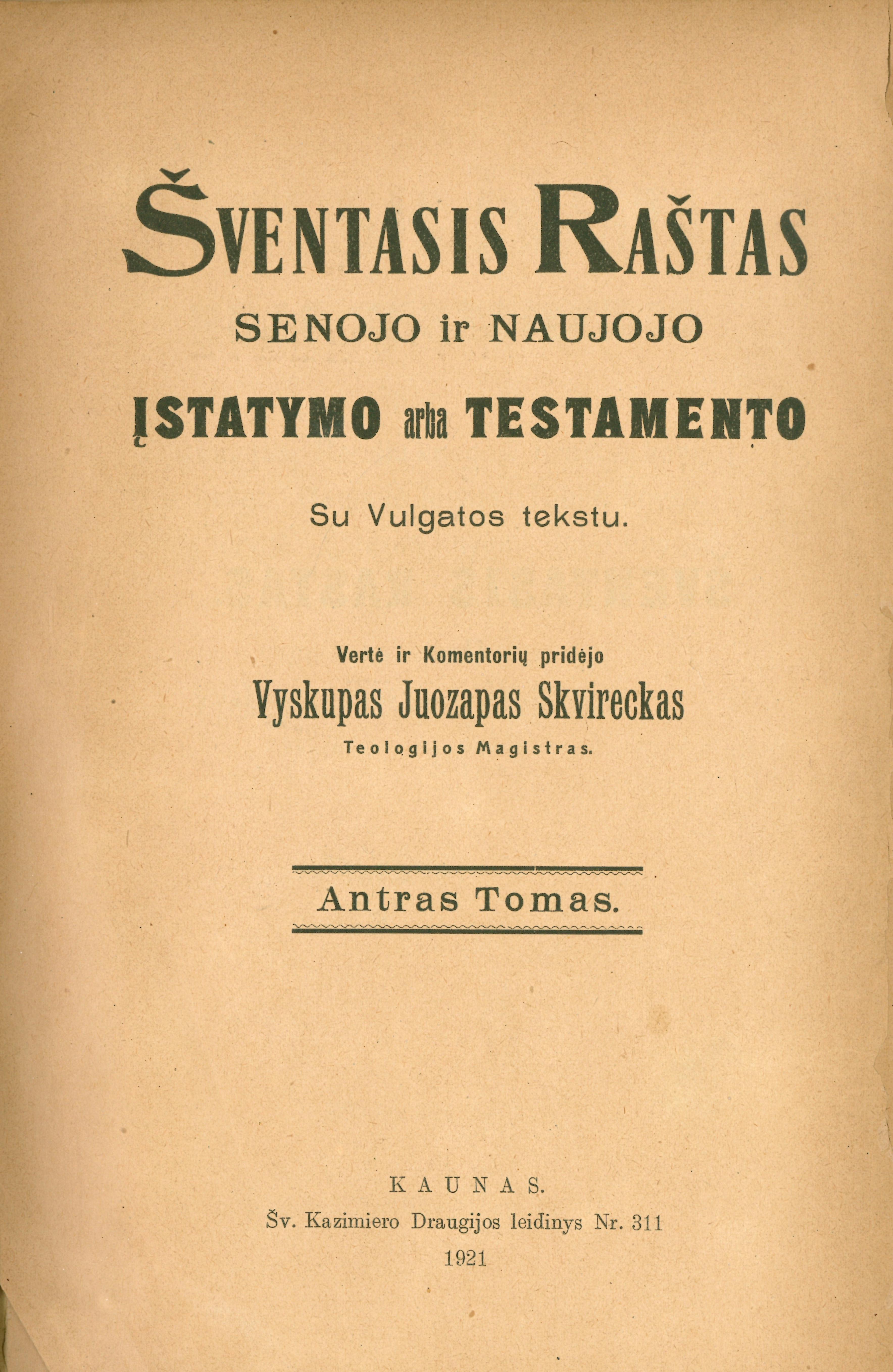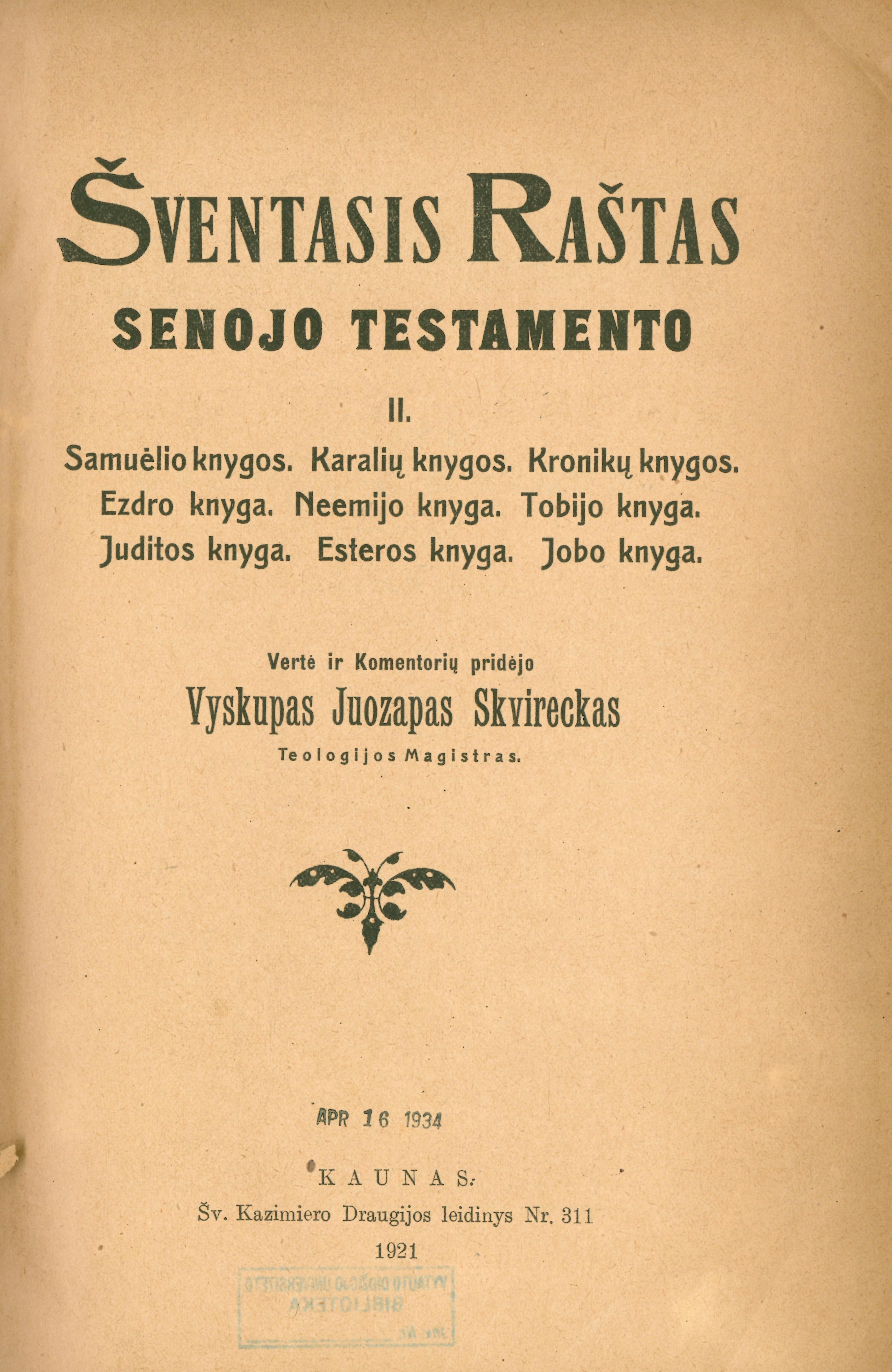 | Antraštė | Šventasis Raštas Senojo ir Naujojo Įstatymo arba Testamento su Vulgatos tekstu. T. 2: Šventasis Raštas Senojo Testamento. T. 2: Samuėlio knygos. Karalių knygos. Kronikų knygos. Ezdro knyga. Noemijo knyga. Tobijo knyga. Juditos knyga. Esteros knyga. Jobo knyga / vertė ir komentorių pridėjo Juozapas Skvireckas. – Kaunas: Šv. Kazimiero draugija, 1921. – 966 p. (Šv. Kazimiero draugijos leidinys, nr. 311) [lt] |