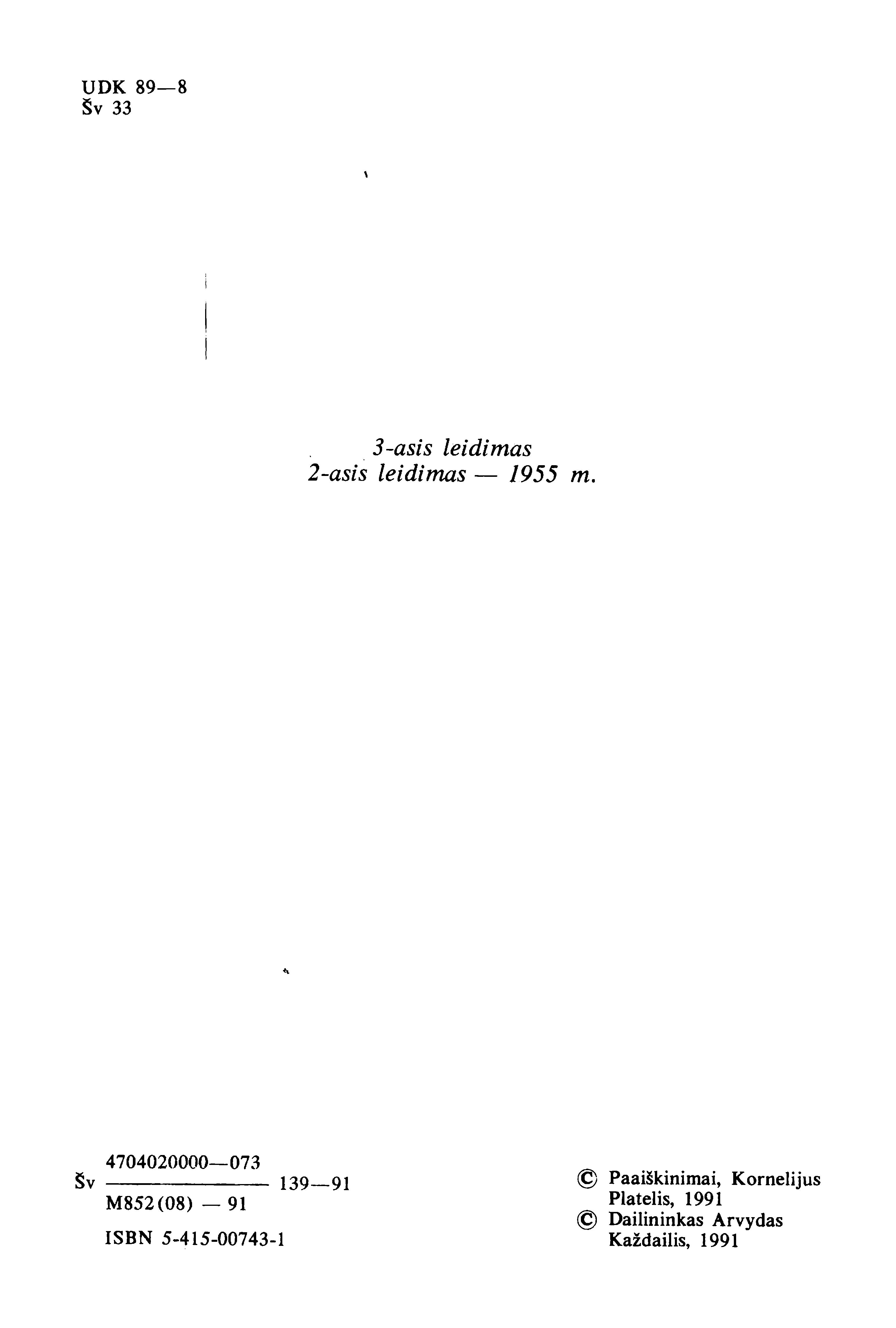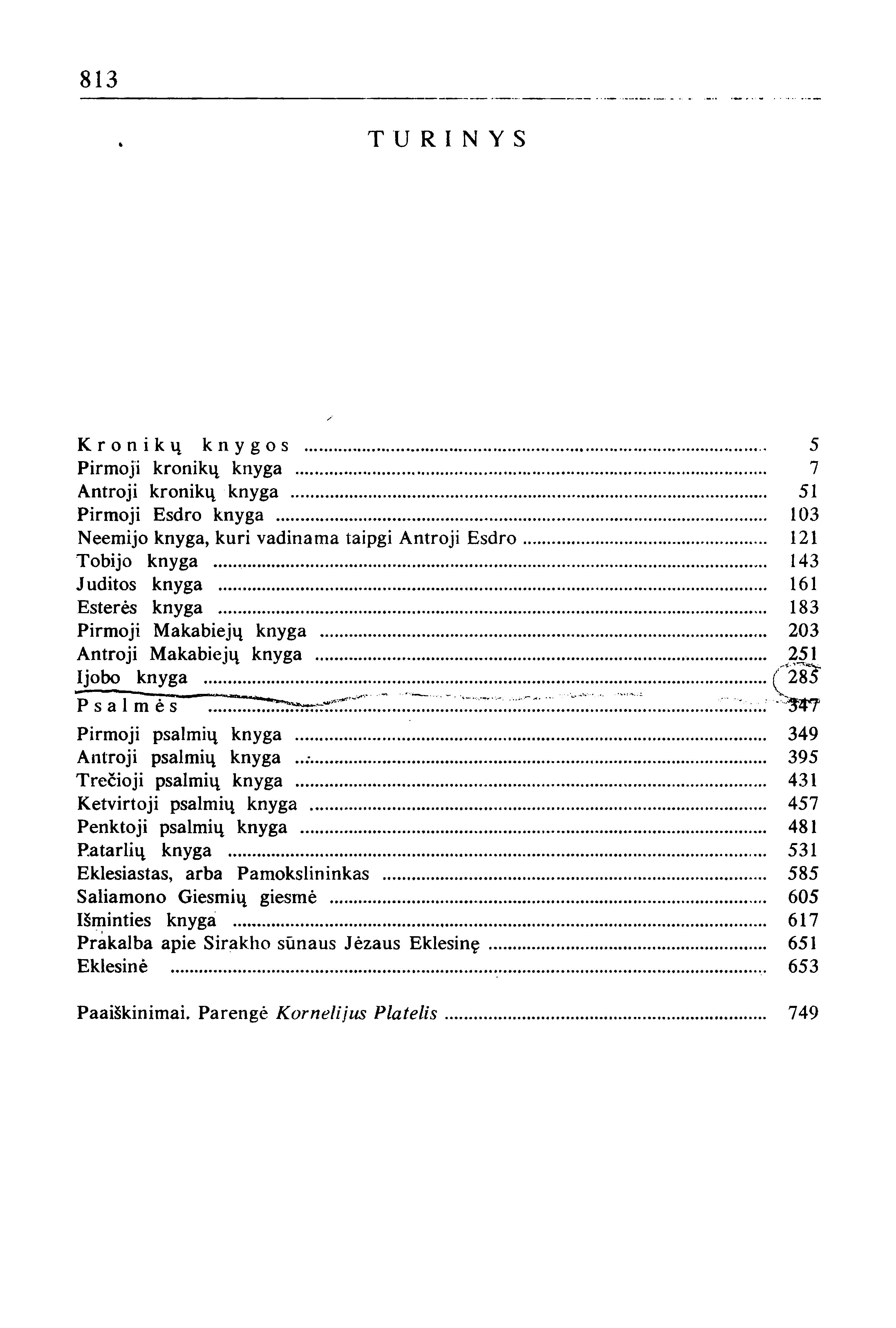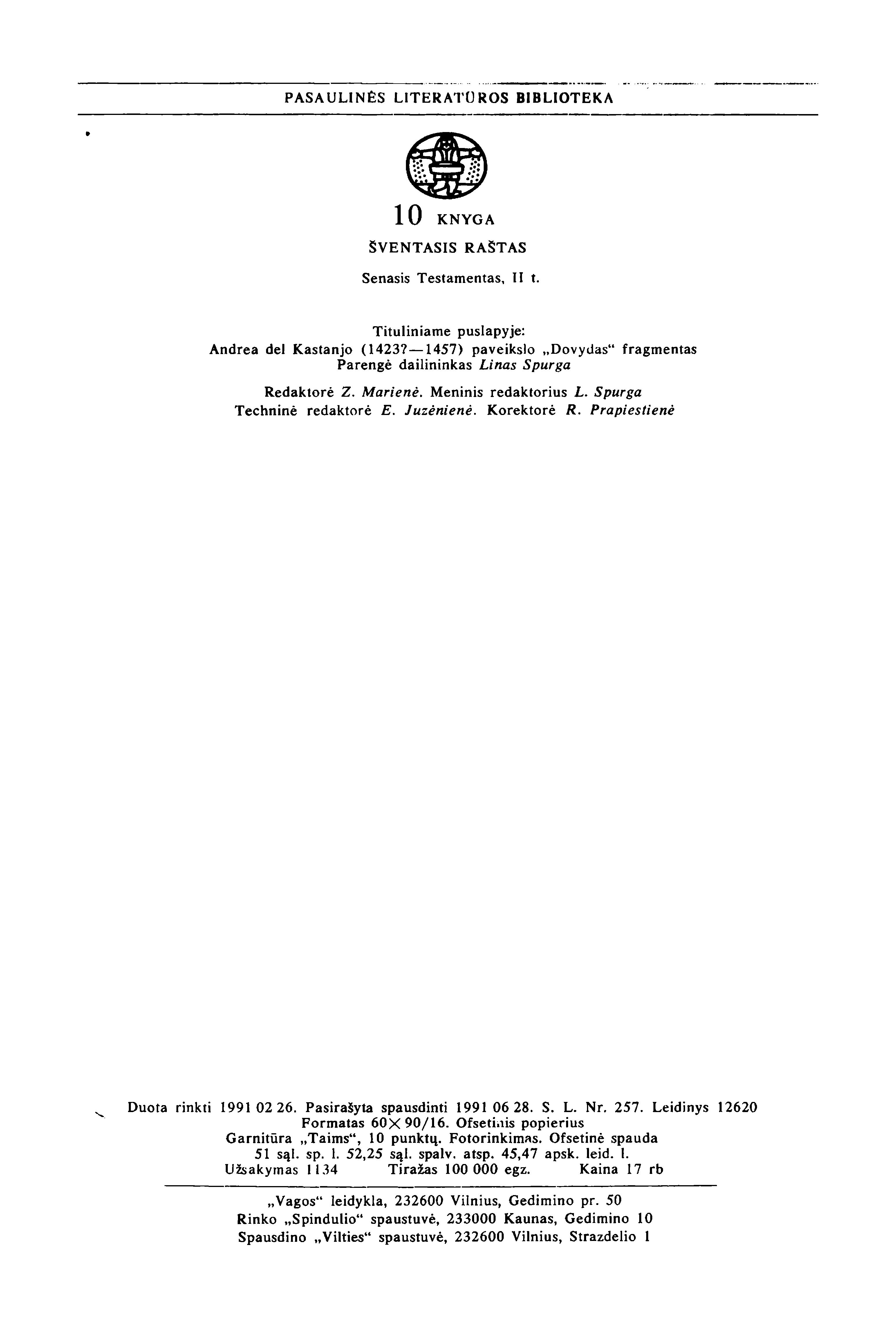 | Antraštė | Šventasis Raštas. Senasis Testamentas / iš lotynų k. vertė Juozapas Jonas Skvireckas, [redagavo ir komentavo Kornelijus Platelis]. T. 2. – 3-ias leidimas. – Vilnius: Vaga, 1991. – 813 p. (Pasaulinės literatūros biblioteka. Literatūra iki XIX a., kn. 10) [lt] |