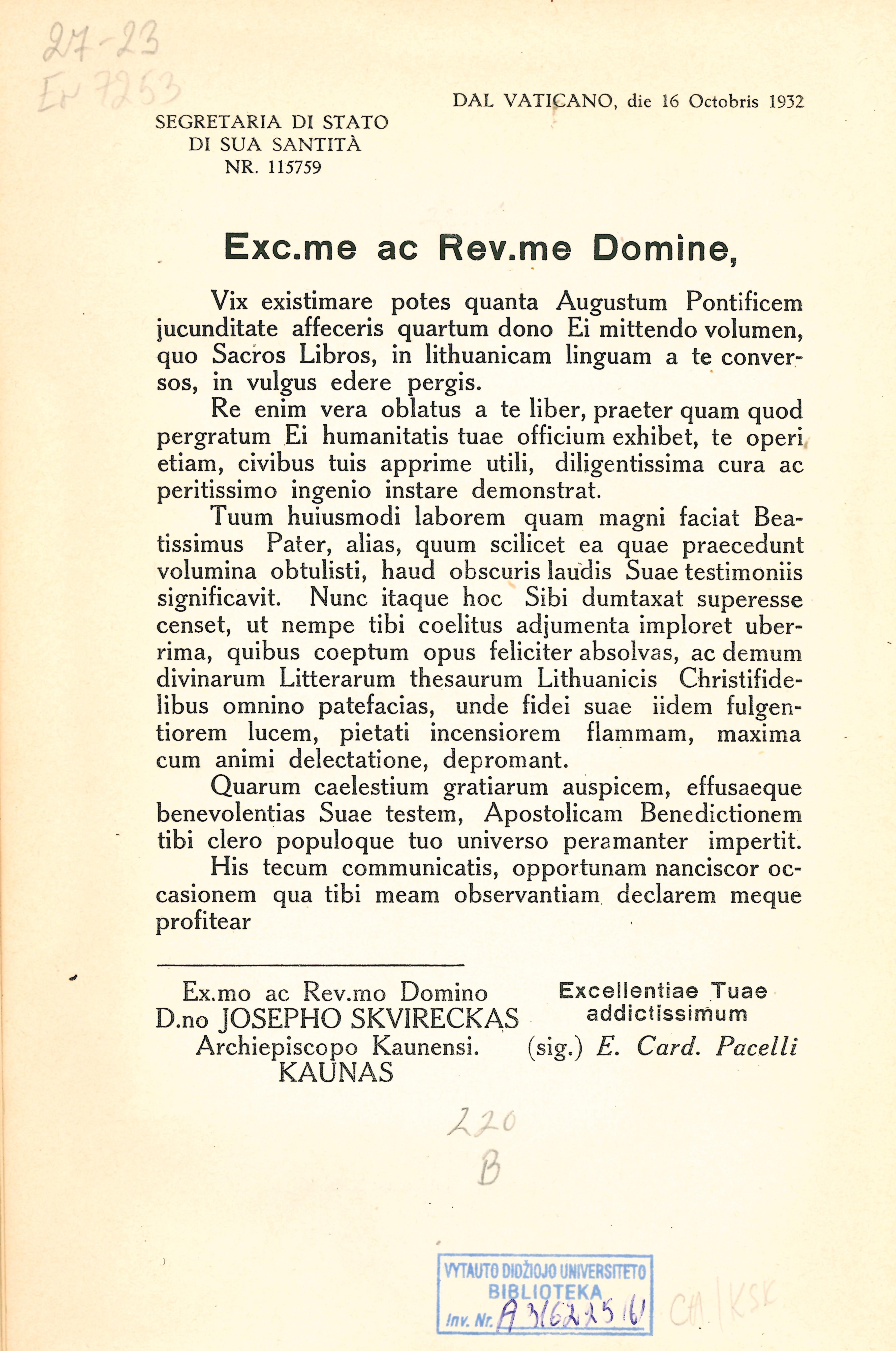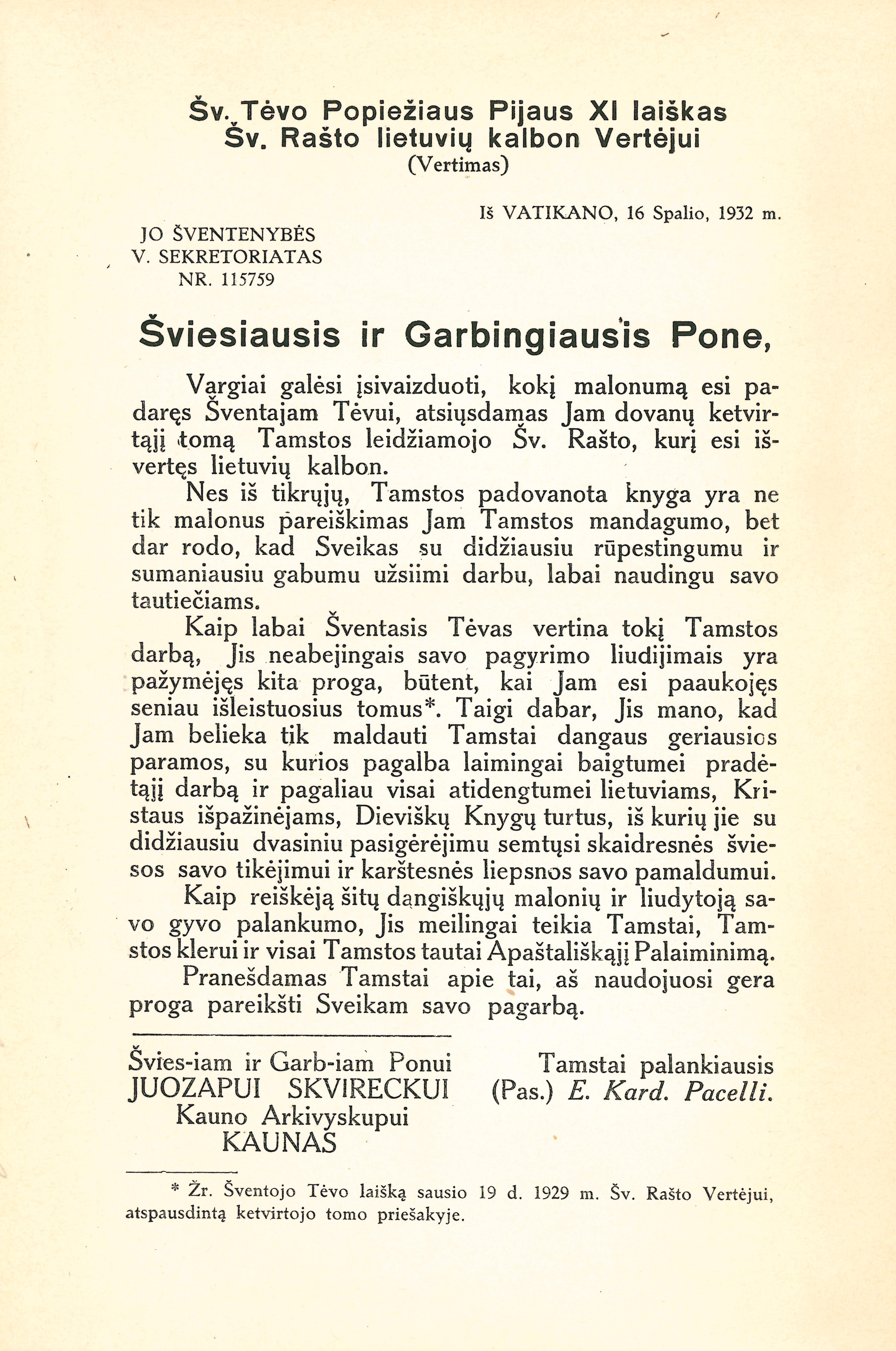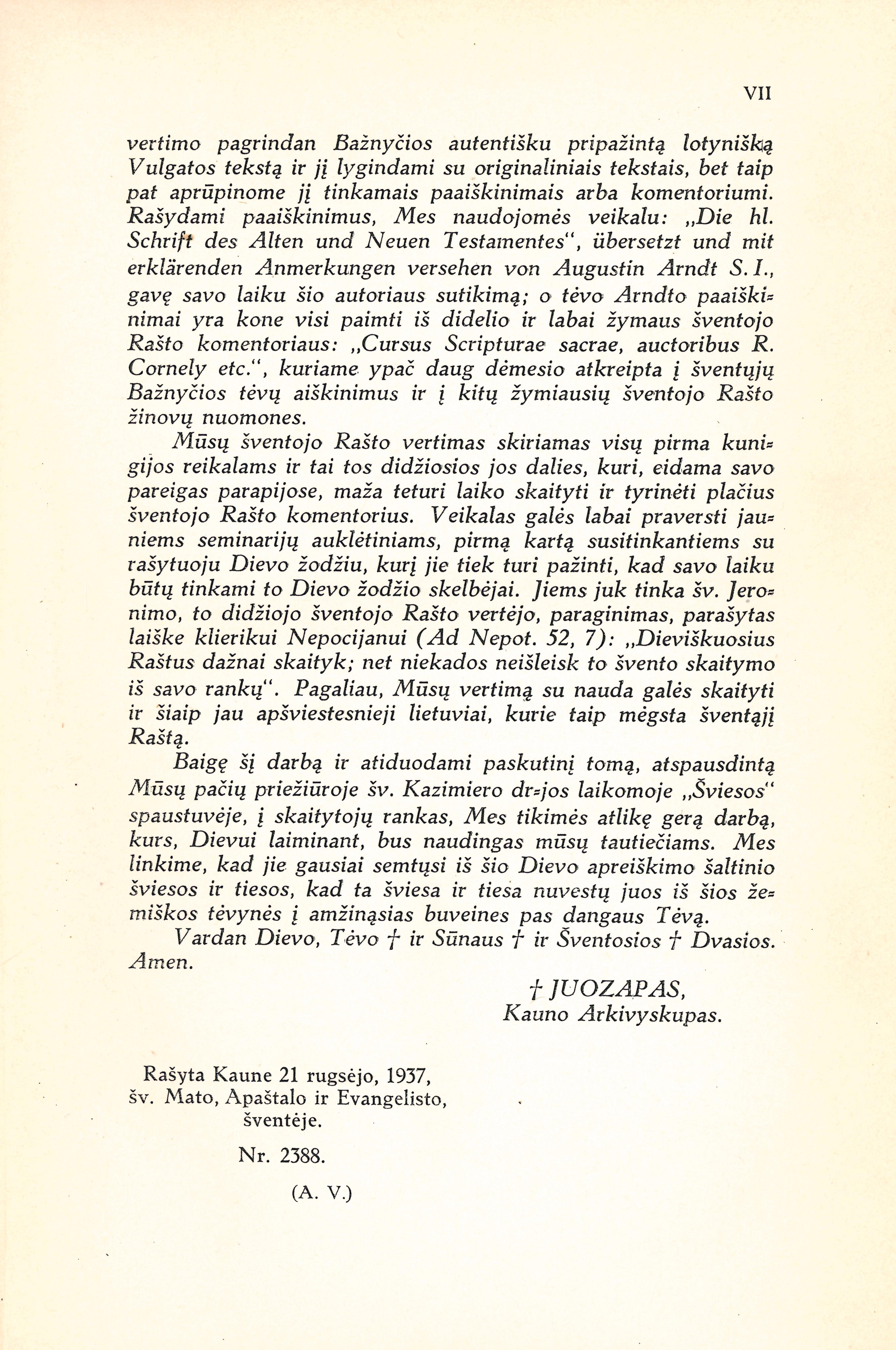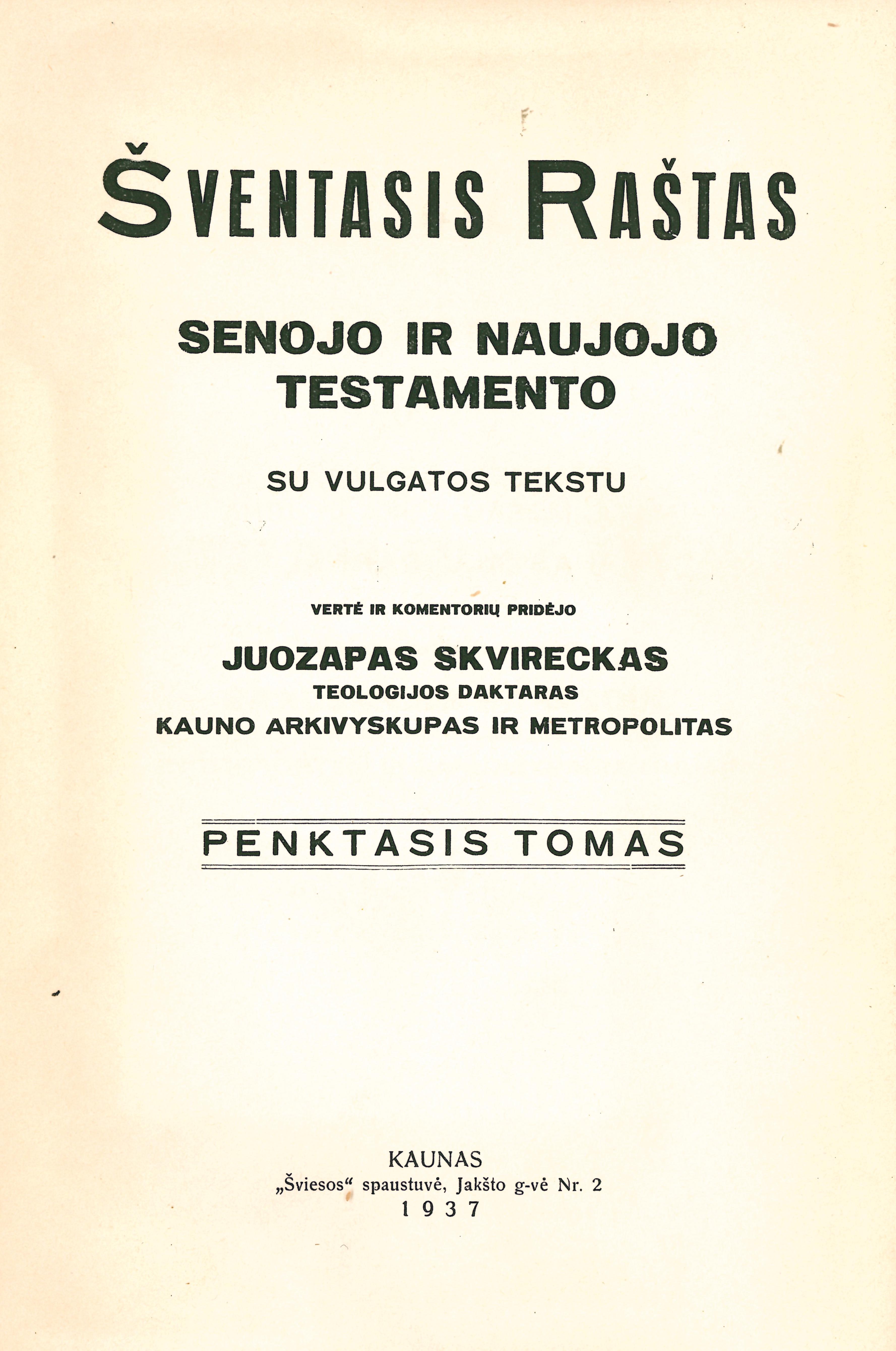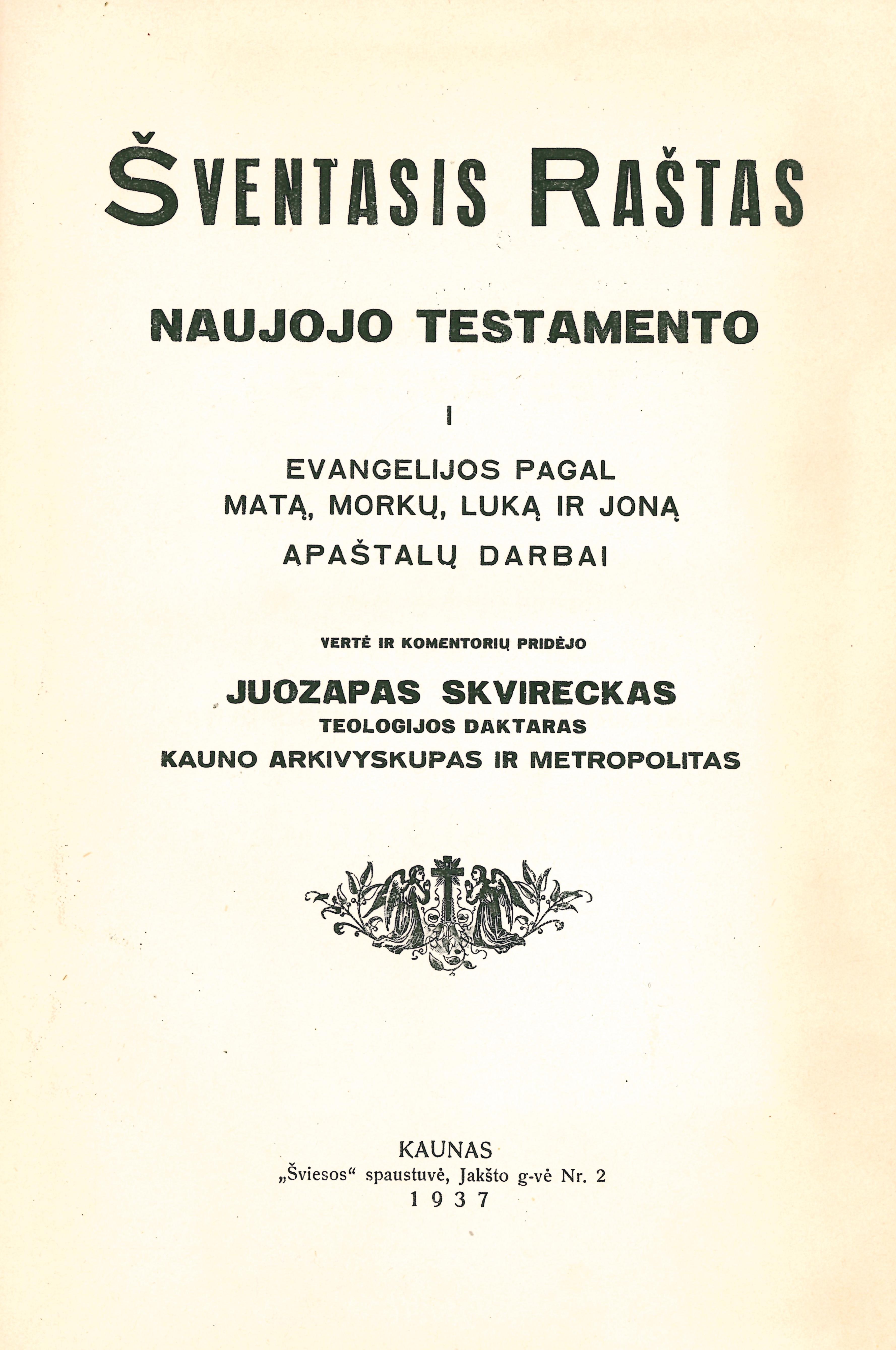 | Antraštė | Šventasis Raštas Senojo ir Naujojo Įstatymo arba Testamento su Vulgatos tekstu. T. 5: Šventasis Raštas Naujojo Testamento. T. 1: Evangelijos pagal Matą, Morkų, Luką ir Joną. Apaštalų darbai / vertė ir komentorių pridėjo Juozapas Skvireckas. – Kaunas: [Šv. Kazimiero draugija], 1937. – VII, 731 p. [lt] |