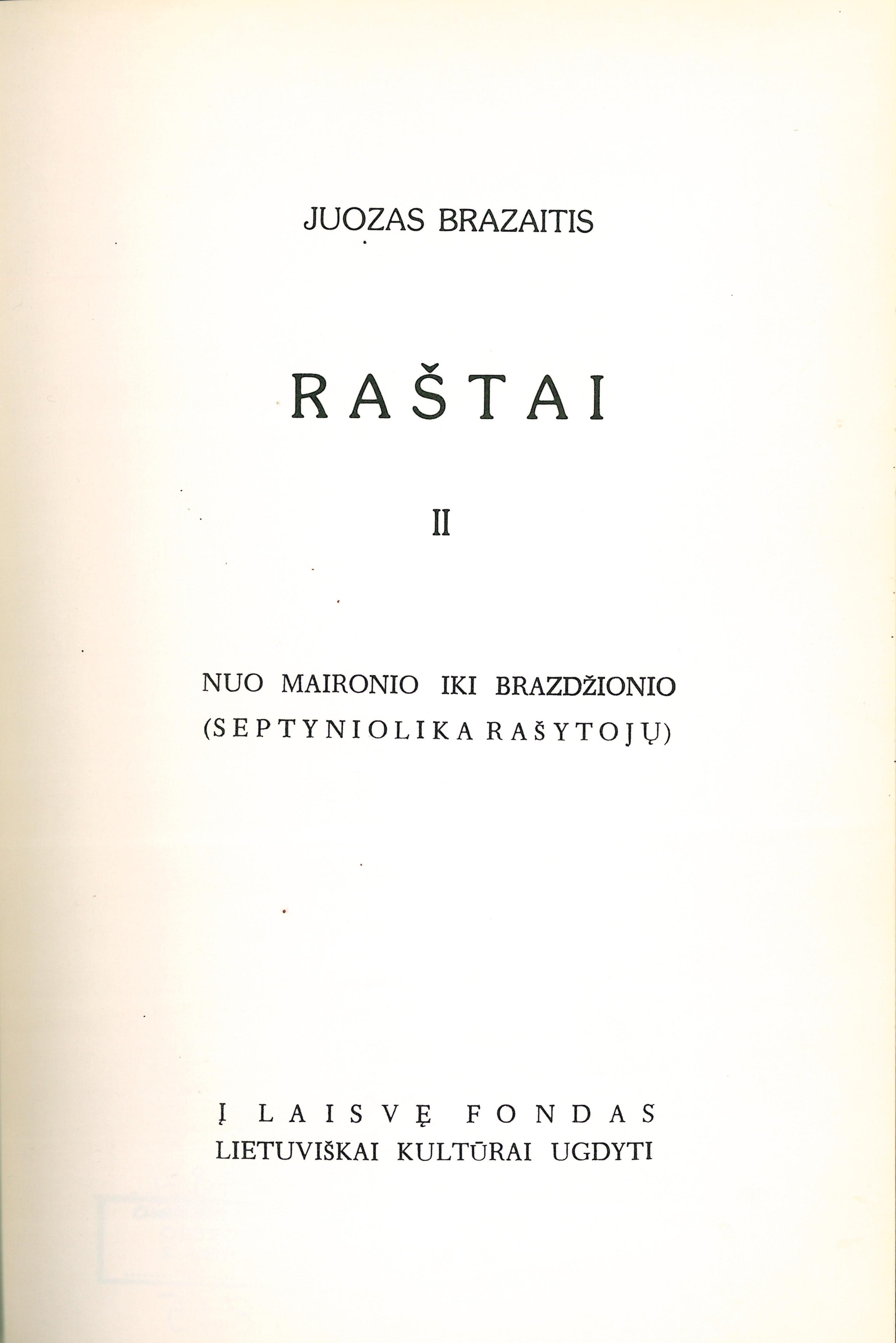 | Antraštė | Raštai. T. 2: Nuo Maironio iki Brazdžionio (septyniolika rašytojų) / Juozas Brazaitis. – Chicago: Į laisvę fondas lietuviškai kultūrai ugdyti, 1981. – 568 p. [lt] |
