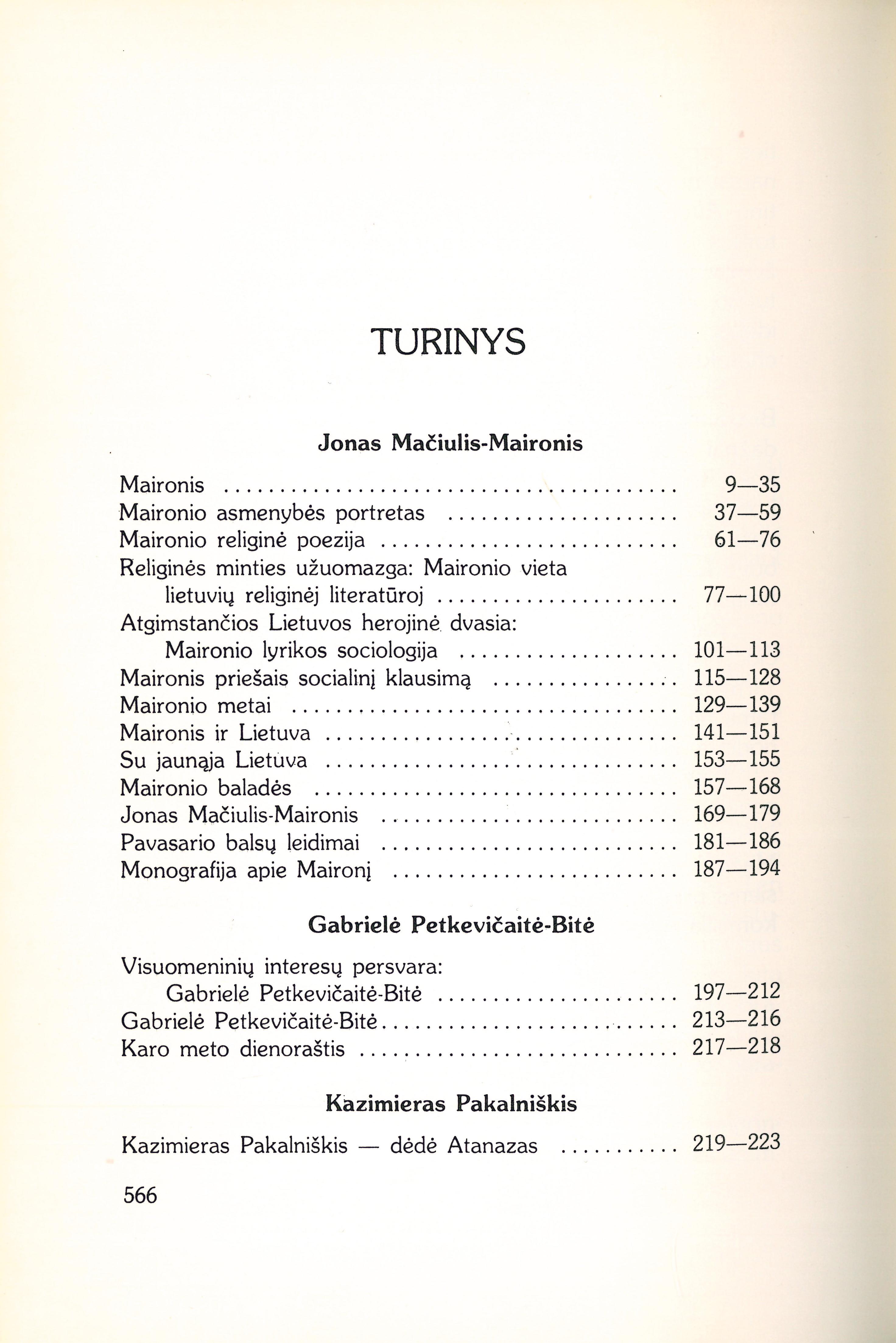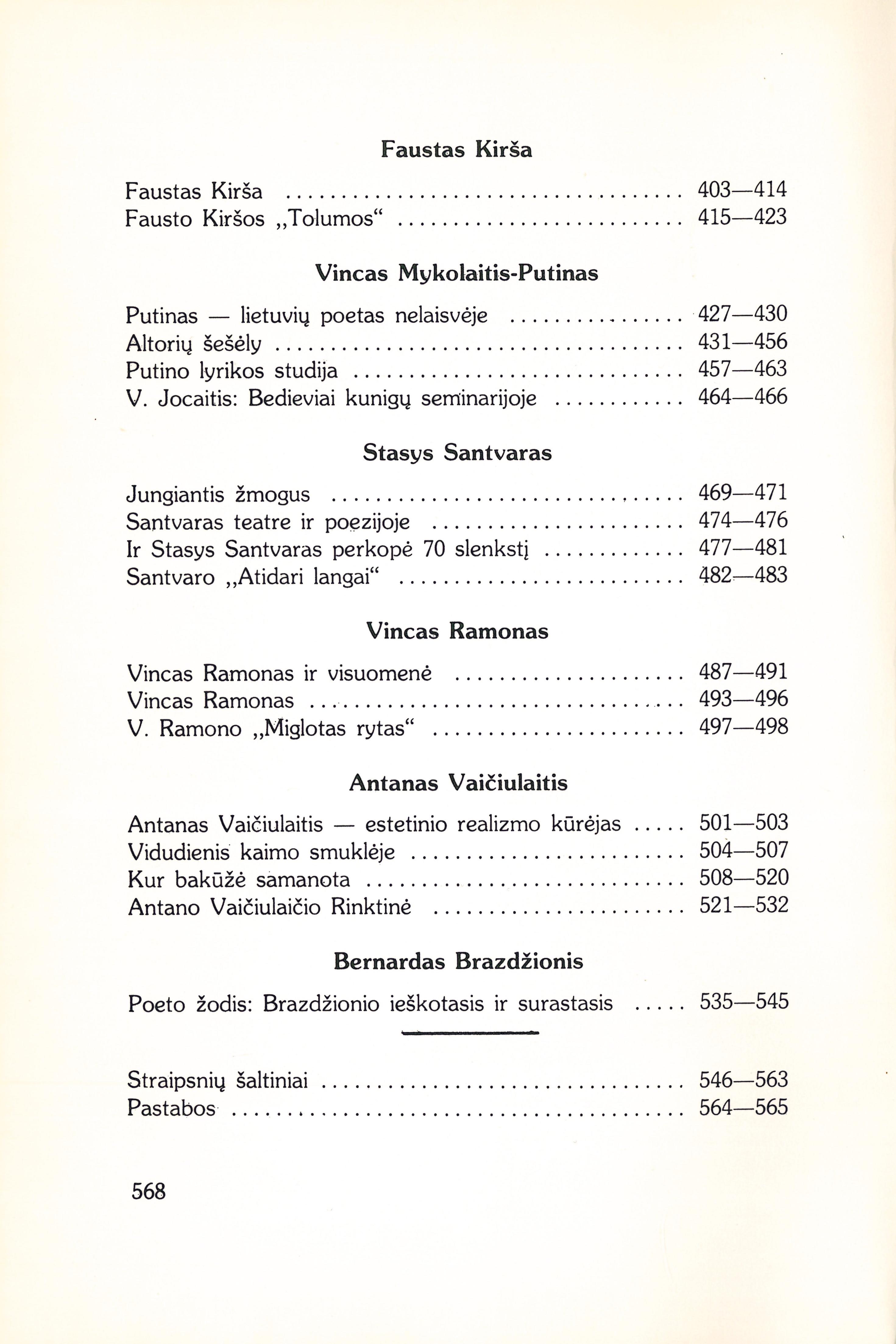 | Jonas Mačiulis-Maironis; Maironio asmenybės portretas (1943); Maironio religinė poezija (1932); Religinės minties užuomazga: Maironio vieta lietuvių religinėj literatūroj (1933); Atgimstančios Lietuvos herojinė dvasia: Maironio lyrikos sociologija (1932); Maironis priešais socialinį klausimą (1938); Maironio metai (1941); Maironis ir Lietuva (1957); Su jaunąja Lietuva (1952); Maironio baladės (1966); Jonas Mačiulis-Maironis (1959); Pavasario balsų leidimai (1940); Monografija apie Maironį [Vandos Zaborskaitės veikalo „Maironis“ recenzija) (1969); Visuomeninių interesų persvara: Gabrielė Petkevičaitė-Bitė (1931); Gabrielė Petkevičaitė-Bitė (1960); Kazimieras Pakalniškis — dėdė Atanazas (1960); Rašytojo palūžimas: Lazdynų Pelėdos melodramai (1936); Sofija Pšibiliauskienė (1961); Marija Lastauskienė (1961); Išsivadavimo problema kūryboje: J. Lindė-Dobilas (1934); Publicisto žodis: A. Smetonos stilius (1934); Marijos Pečkauskaitės raštų prasmė šiandien (1961); Kompozicijos problema beletristikoj: Š. Raganos „Irkos tragedija“ (1931); Marija Pečkauskaitė-Šatrijos Ragana (1930); Marija Pečkauskaitė (1960); Šatrijos Raganos „Sename dvare“ (1928); Šatrijos Raganos „Raštai“ III (1928); Šatrijos Raganas „Raštai“ IV (1929); Rašytojo išsivadavimas: Biliūnas laiškuose (1937); Krėvės padavimai (1948); Animizmas V. Krėvės „Likimo keliuose“ (1929); V. Krėvės „Raštai“ VIII (1930); Jurgis Savickis (1953); Faustas Kirša (1940); Fausto Kiršos „Tolumos“ (1948); Putinas - lietuvių poetas nelaisvėje (1956); Altorių šešėly (1933); Putino lyrikos studija (1932); V. Jocaitis: Bedieviai kunigų seminarijoje (1936); Jungiantis žmogus. Stasiui Santvarui 50 metų (1952); Santvaras teatre ir poezijoje (1962); Ir Stasys Santvaras perkopė 70 slenkstį (1972); Santvaro „Atidari langai“ (1959); Vincas Ramonas ir visuomenė (1965); Vincas Ramonas (1965); V. Ramono „Miglotas rytas“ (1960); Antanas Vaičiulaitis - estetinio realizmo kūrėjas (1947); „Vidudienis kaimo smuklėje“ [rec.] (1933); „Kur bakūžė samanota“ [rec.] (1948); Antano Vaičiulaičio Rinktinė (1955); Poeto žodis: Brazdžionio ieškotasis ir surastasis (1938) [lt] | |