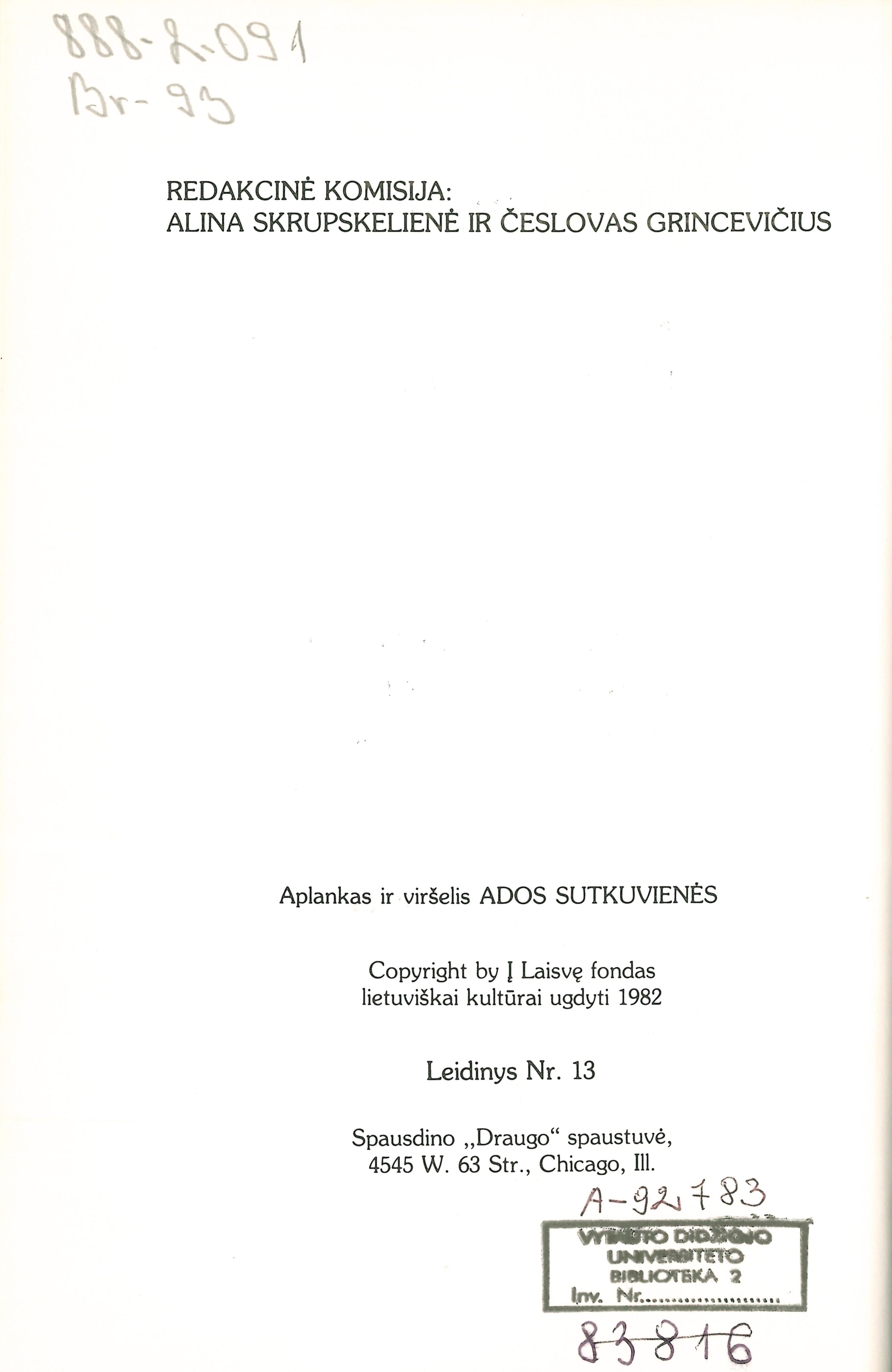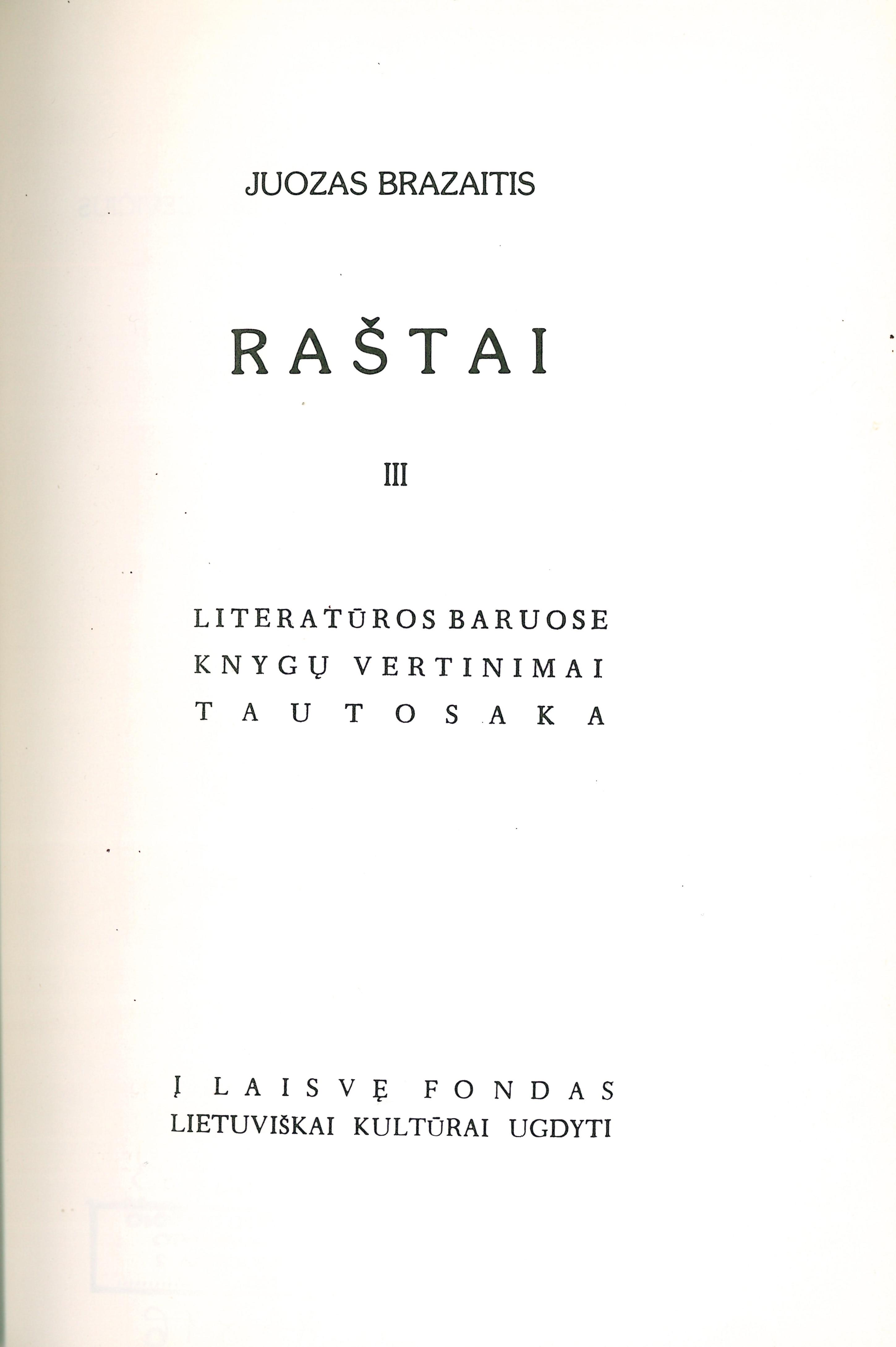 Antraštė Raštai. T. 3: Literatūros baruose; Knygų vertinimai; Tautosaka / Juozas Brazaitis. – Chicago: Į laisvę fondas lietuviškai kultūrai ugdyti, 1982. – 568 p. [lt]