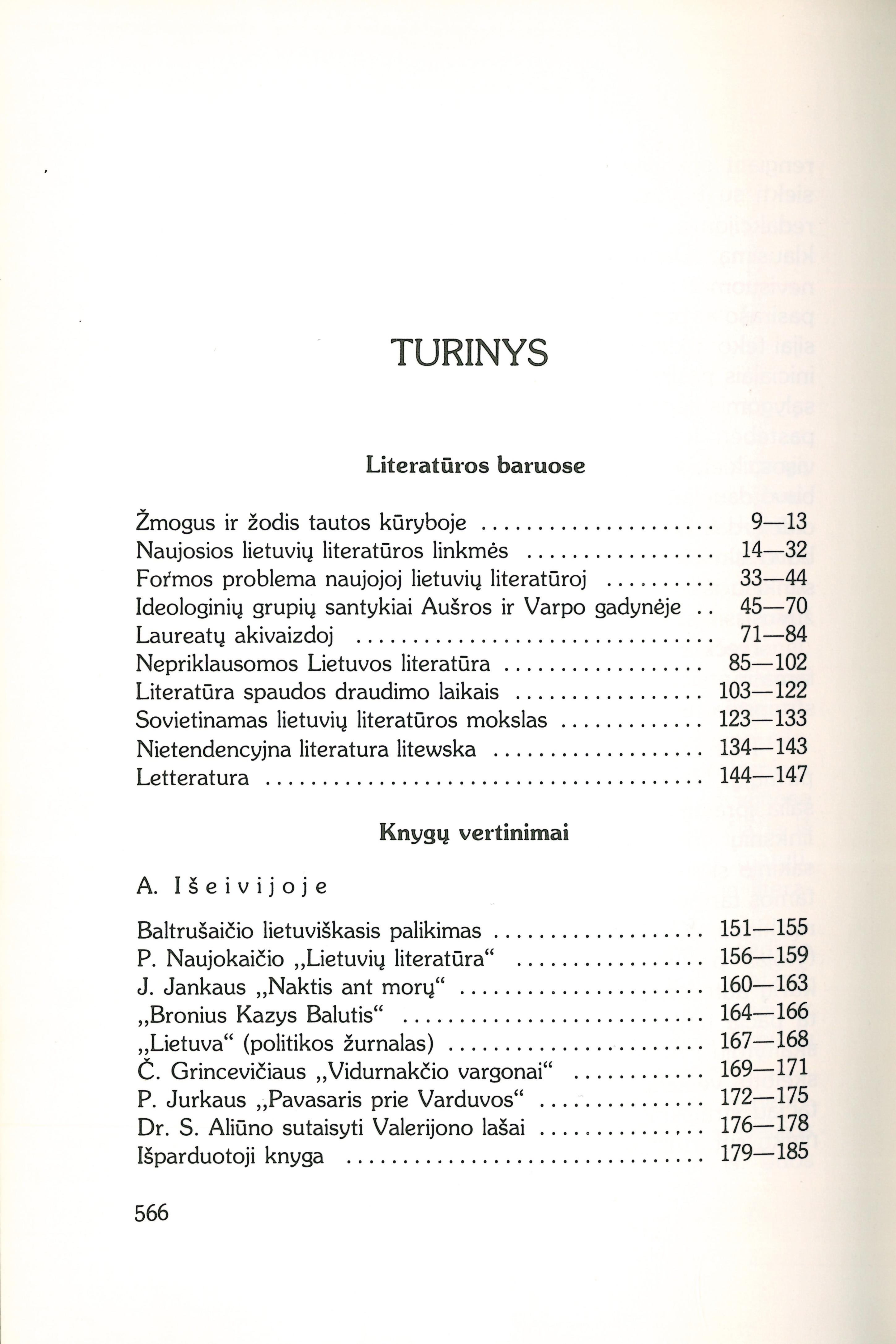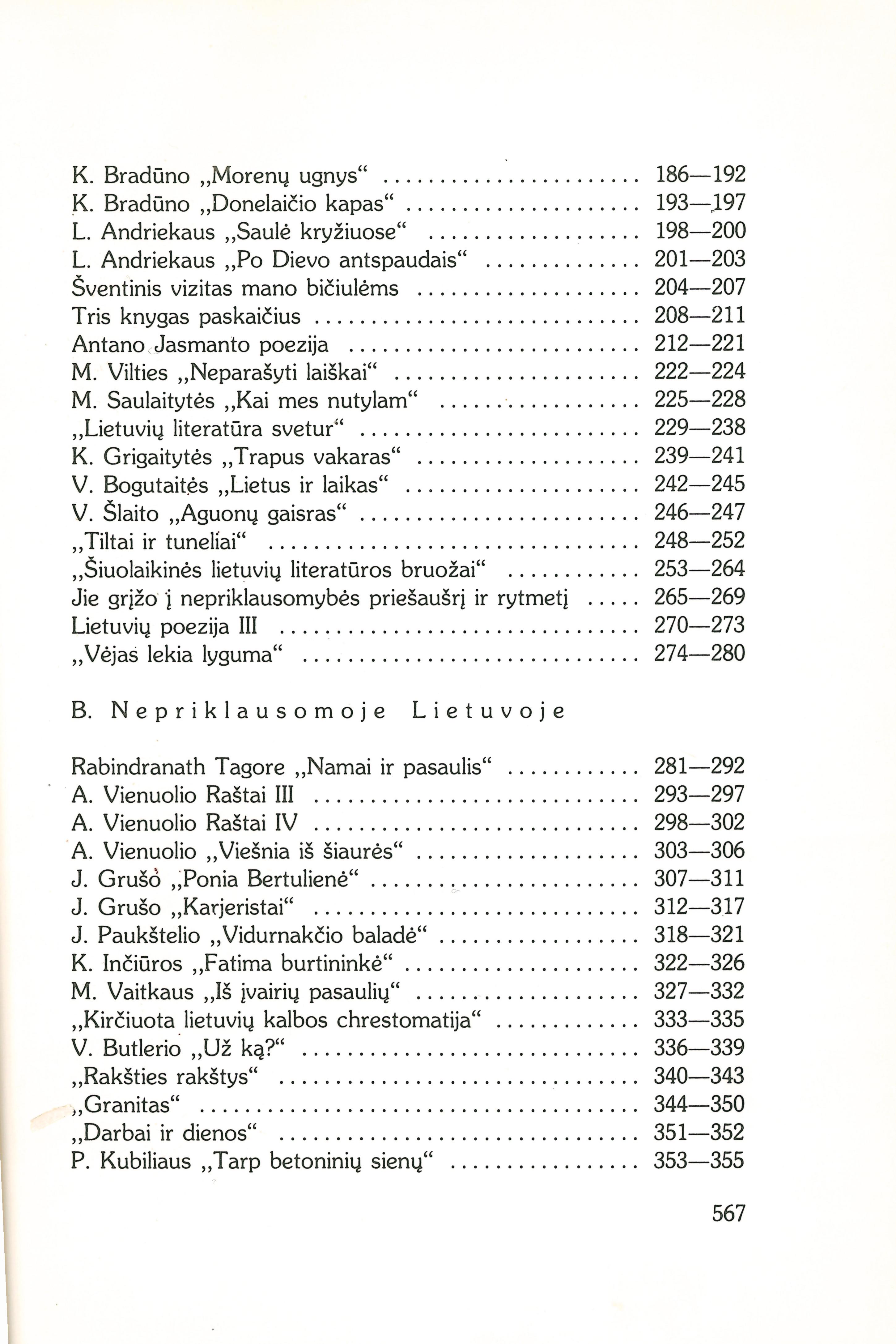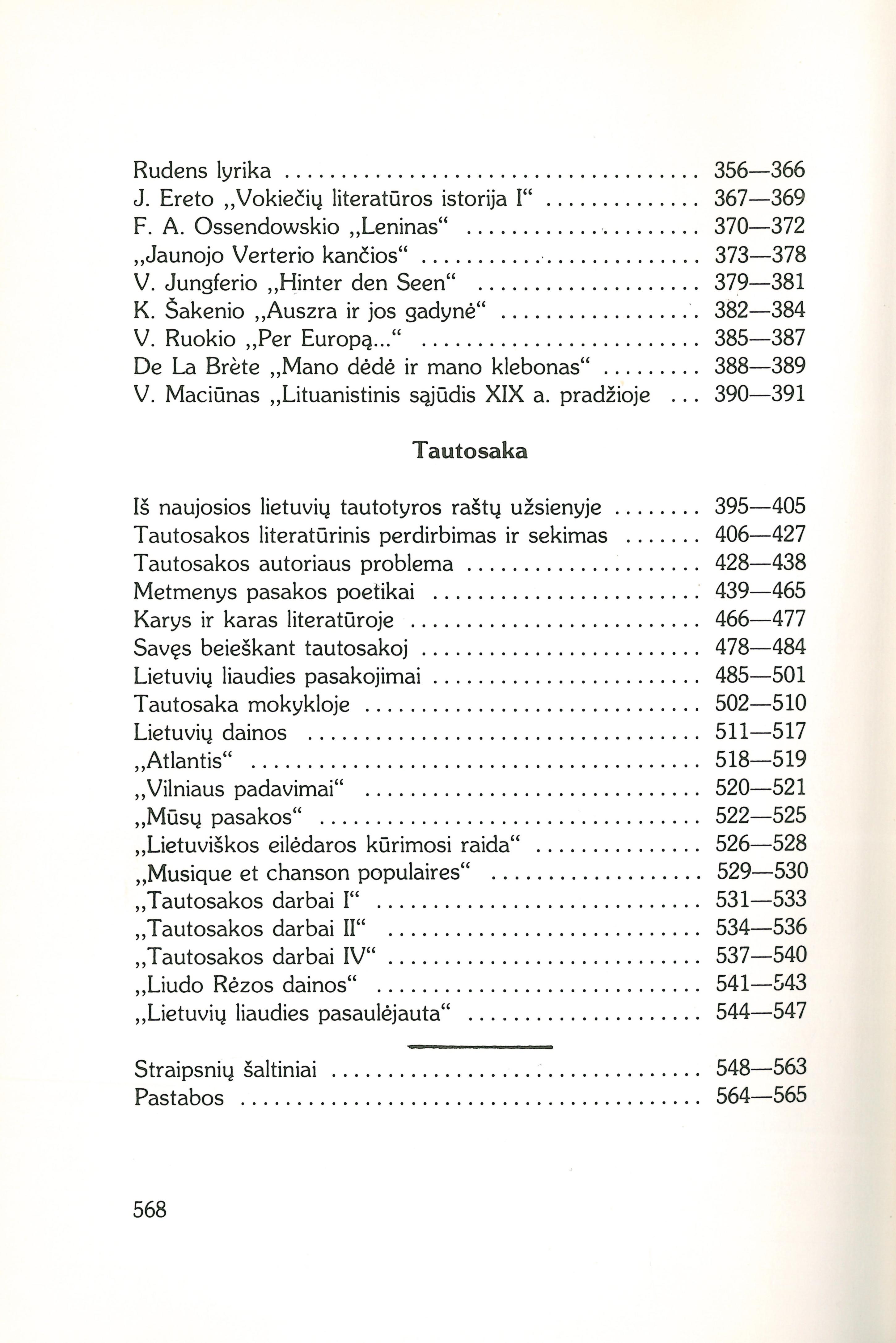 Žmogus ir žodis tautos kūryboje (1938); Naujosios lietuvių literatūros linkmės (1936); Formos problema naujojoj lietuvių literatūroj (1936); Ideologinių grupių santykiai Aušros ir Varpo gadynėje (1939); Laureatų akivaizdoj (1948); Nepriklausomos Lietuvos literatūra (1968); Literatūra spaudos draudimo laikais (1968); Sovietinamas lietuvių literatūros mokslas (1957); Nietendencyjna literatūra litewska (1934); Letteratura (1951); Knygų vertinimai: Baltrušaičio lietuviškasis palikimas (1948); P. Naujokaičio „Lietuvių literatūra“ (1949); J. Jankaus „Naktis ant morų“ (1949); „Bronius Kazys Balutis“ (1952); „Lietuva“ (politikos žurnalas) (1952); Č. Grincevičiaus „Vidurnakčio vargonai“; P. Jurkaus „Pavasaris prie Varduvos“ (1954); Dr. S. Aliūno sutaisyti Valerijono lašai (1954); Išparduotoji knyga [Raštikio atsiminimai] (1956); K. Bradūno „Morenų ugnys“ (1958); K. Bradūno „Donelaičio kapas“ (1971); L. Andriekaus „Saulė kryžiuose“ (1960); L. Andriekaus „Po Dievo antspaudais“ (1969); Šventinis vizitas mano bičiulėms (1961); Tris knygas paskaičius (1963); Antano Jasmanto poezija (1965); M. Vilties „Neparašyti laiškai“; M. Saulaitytės „Kai mes nutylam“ (1968); „Lietuvių literatūra svetur“ (1969); K. Grigaitytės „Trapus vakaras“ (1969); V. Bogutaitės „Lietus ir laikas“ (1969); V. Šlaito „Aguonų gaisras“ (1969); „Tiltai ir tuneliai“ (1969); „Šiuolaikinės lietuvių literatūros bruožai“ (1969); Jie grįžo į nepriklausomybės priešaušrį ir rytmetį (1971); Lietuvių poezija III (1971); „Vėjas lekia lyguma“ (1971); Rabindranath Tagore „Namai ir pasaulis“ (1925); A. Vienuolio „Raštai“ III (1926); A. Vienuolio „Raštai“ IV (1928); A. Vienuolio „Viešnia iš šiaurės“ (1933); J. Grušo „Ponia Bertulienė“ (1928); J. Grušo „Karjeristai“ (1935); J. Paukštelio „Vidurnakčio baladė“ (1929); K. Inčiūros „Fatima burtininkė“ (1929); M. Vaitkaus „Iš įvairių pasaulių“ (1929); „Kirčiuota lietuvių kalbos chrestomatija“ (1929); V. Butlerio „Už ką?“ (1930); „Rakšties rakštys“ (1930); „Granitas“ (1930); „Darbui ir dienos“ (1930); P. Kubiliaus „Tarp betoninių sienų“ (1930); Rudens lyrika (1931); J. Ereto „Vokiečių literatūros istorija I“ (1931); F. A. Ossendowskio „Leninas“ (1932); „Jaunojo Verterio kančios“ (1932); V. Jungferio „Hinter den Seen“ (1932); K. Šakenio „Auszra ir jos gadynė“ (1933); V. Ruokio „Per Europą...“ (1933); De La Brėte „Mano dėdė ir mano klebonas“ (1934); V. Maciūnas „Lituanistinis sąjūdis XIX a. pradžioje (1939); Tautosaka: Iš naujosios lietuvių tautotyros raštų užsienyje (1932); Tautosakos literatūrinis perdirbimas ir sekimas (1933); Tautosakos autoriaus problema (1934); Metmenys pasakos poetikai (1934); Karys ir karas literatūroje (1935); Savęs beieškant tautosakoj (1935); Lietuvių liaudies pasakojimai (1937); Tautosaka mokykloje (1940); Lietuvių dainos; „Atlantis“ (1925); „Vilniaus padavimai“ (1931); „Mūsų pasakos“ (1934); „Lietuviškos eilėdaros kūrimosi raida“ (1934); „Musique et chanson populaires“ (1935); „Tautosakos darbai I“ (1936); „Tautosakos darbai II“ (1937); „Tautosakos darbai IV“ (1938); „Liudo Rėzos dainos“ (1938); J. Balio „Lietuvių liaudies pasaulėjauta“ (1967) [lt]