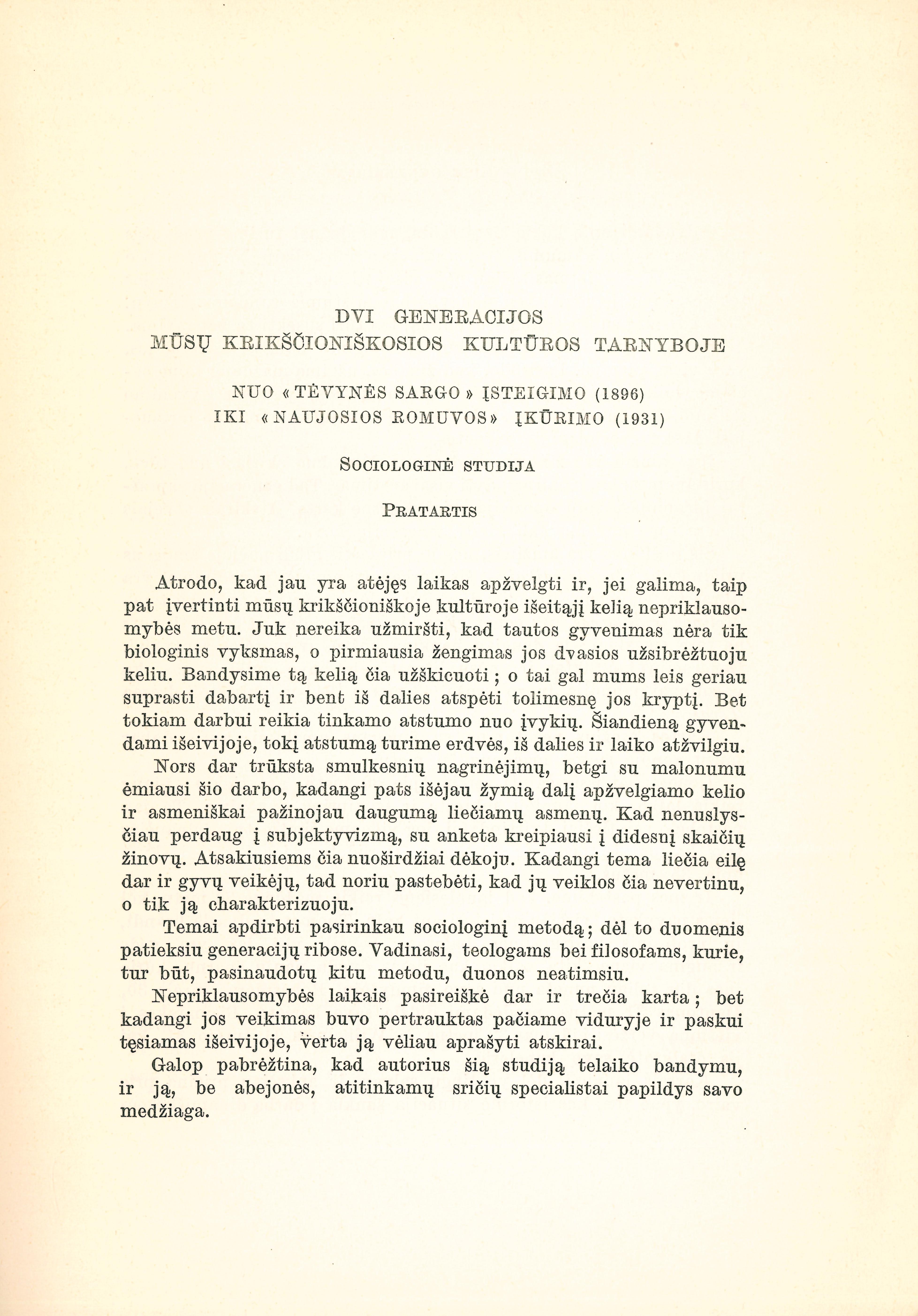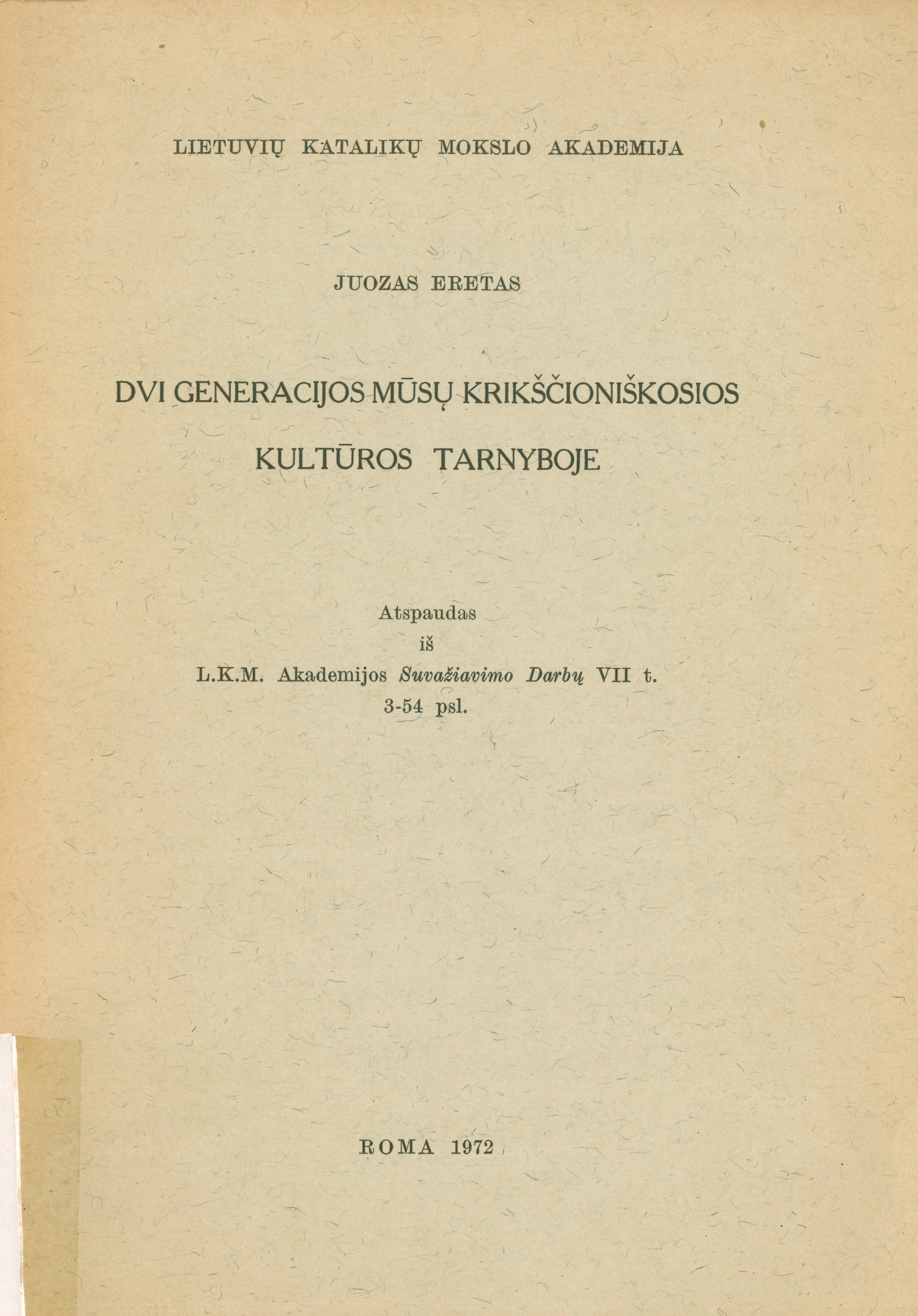 Dvi generacijos mūsų krikščioniškosios kultūros tarnyboje : Nuo „Tėvynės sargo“ įsteigimo (1896) iki „Naujosios Romuvos“ įkūrimo (1931) / Juozas Eretas ; Lietuvių Katalikų MA. – Roma : Lietuvių katalikų mokslo akademija, 1972. – P. 3-54 p. – Santrauka vokiečių kalba. – Atspaudas iš : L. K. M. Akademijos suvažiavimo darbai, t. 7, p. 3-54.