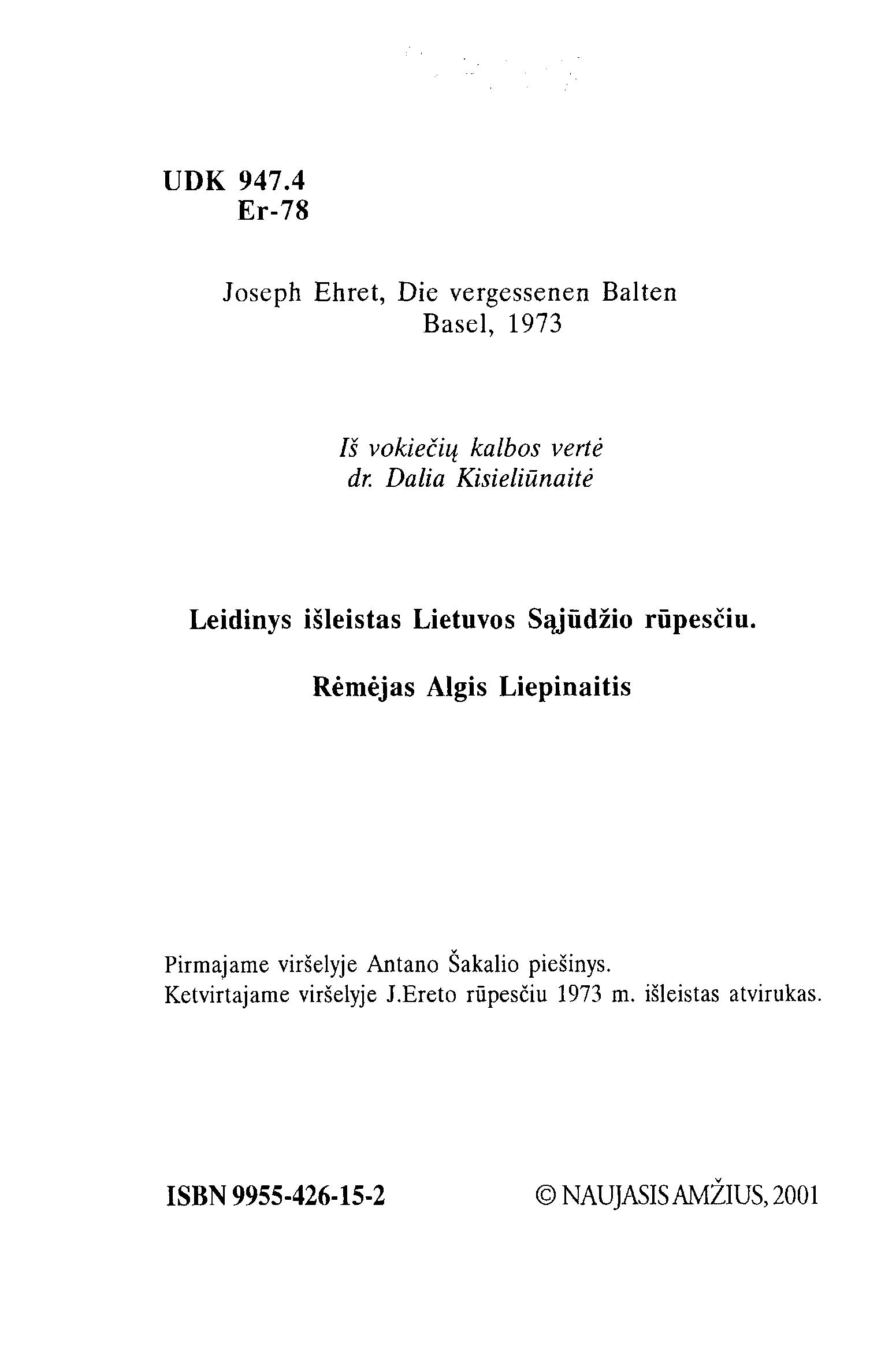 | Antraštė | Užmirštieji baltai / Juozas Eretas. – Kaunas: Naujasis amžius, 2001. – 22 p. [lt] |