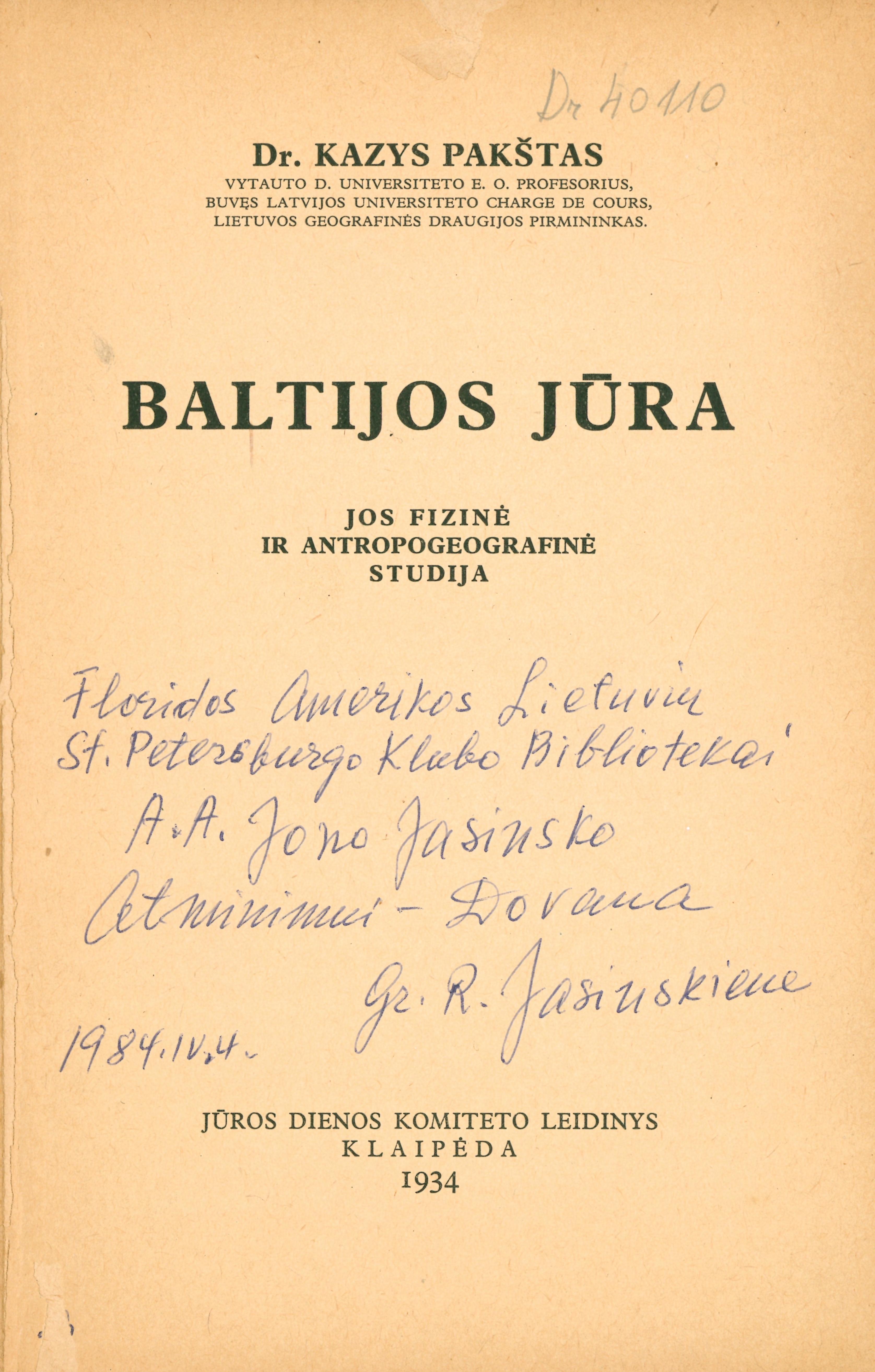 | Antraštė | Baltijos jūra: jos fizinė ir antropogeografinė studija / Kazys Pakštas. – Klaipėda: Jūros dienos komitetas, 1934. – 83, [2] p. [lt] |