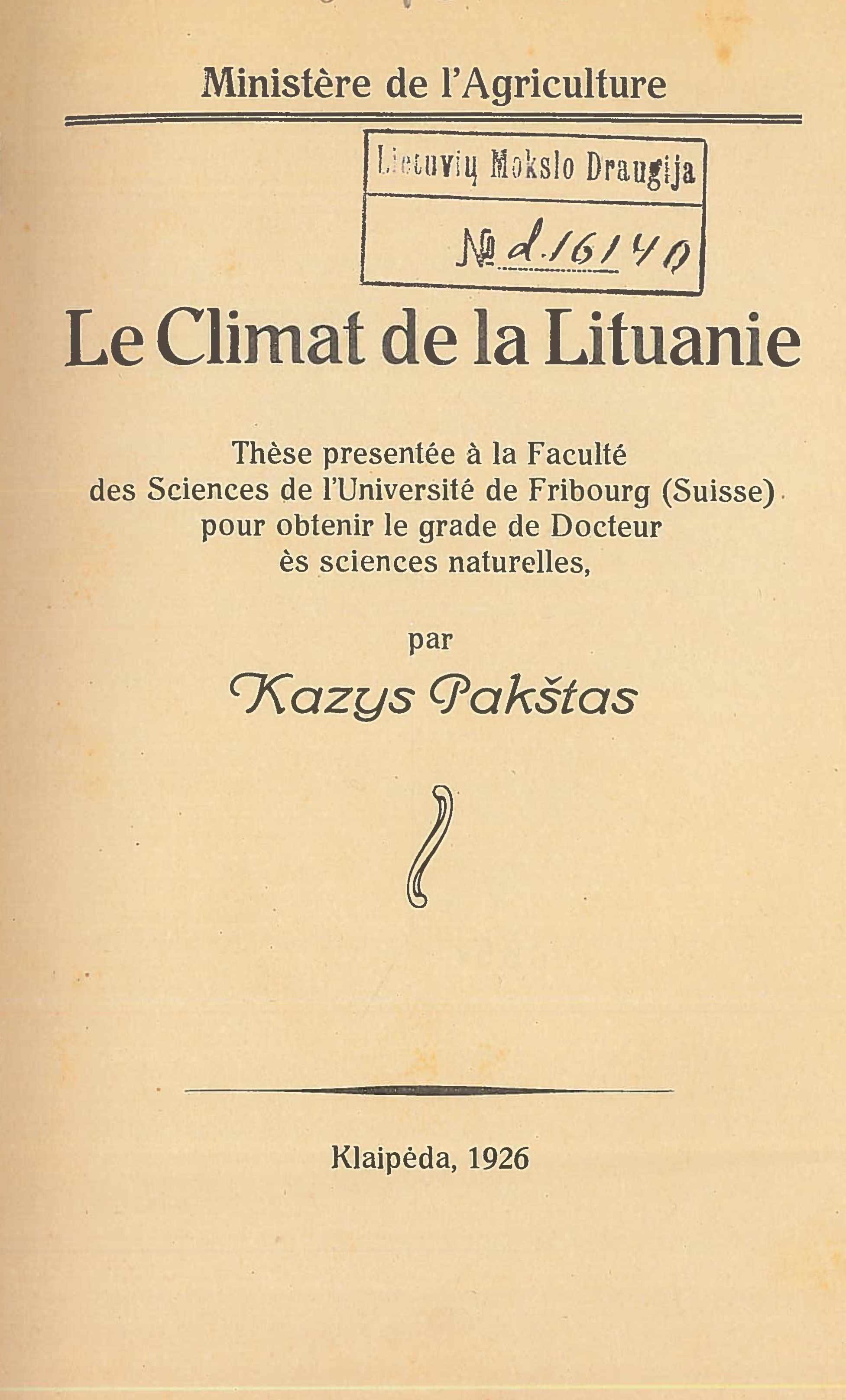 | Le climat de la Lituanie: thèse presentée à la Faculté des sciences de l'Université de Fribourg (Suisse) pour obtenir le grade de docteur des sciences naturelles / Kazys Pakštas. – [Kaunas]: [Žemės ūkio departamentas], 1926. – 137, [1] p. [lt] | |