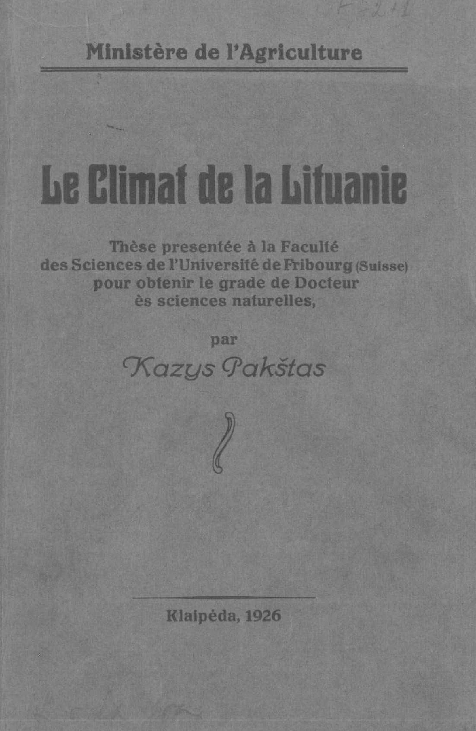| Antraštė | Le climat de la Lituanie: thèse presentée à la Faculté des sciences de l'Université de Fribourg (Suisse) pour obtenir le grade de docteur des sciences naturelles / Kazys Pakštas. – [Kaunas]: [Žemės ūkio departamentas], 1926. – 137, [1] p. [lt] |