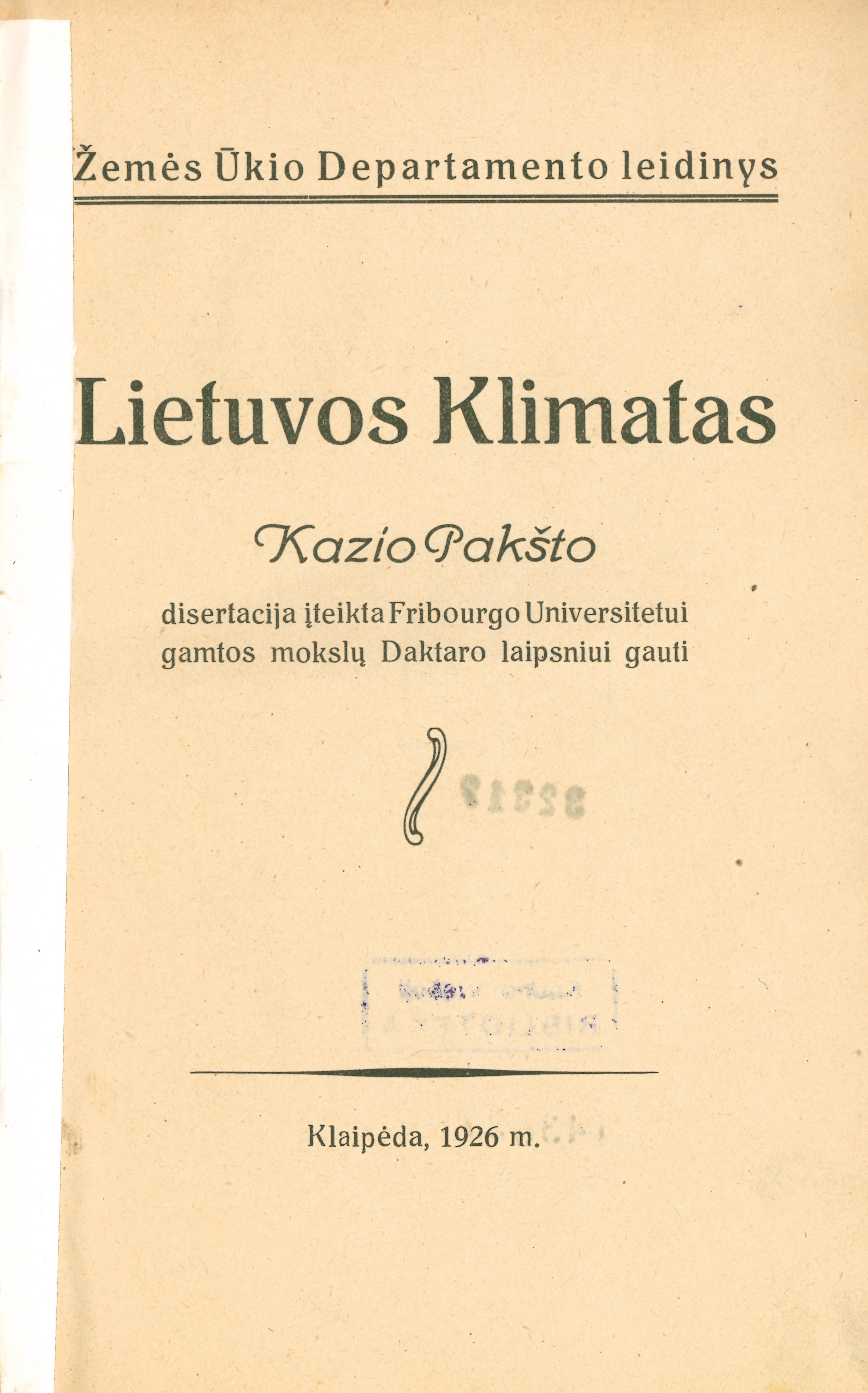 | Antraštė | Lietuvos klimatas: Kazio Pakšto disertacija įteikta Fribourgo universitetui gamtos mokslų daktaro laipsniui gauti. – [Kaunas] : Žemės ūkio departamento leidinys, 1926. – 124 p., 1 žml. lap. [lt] |