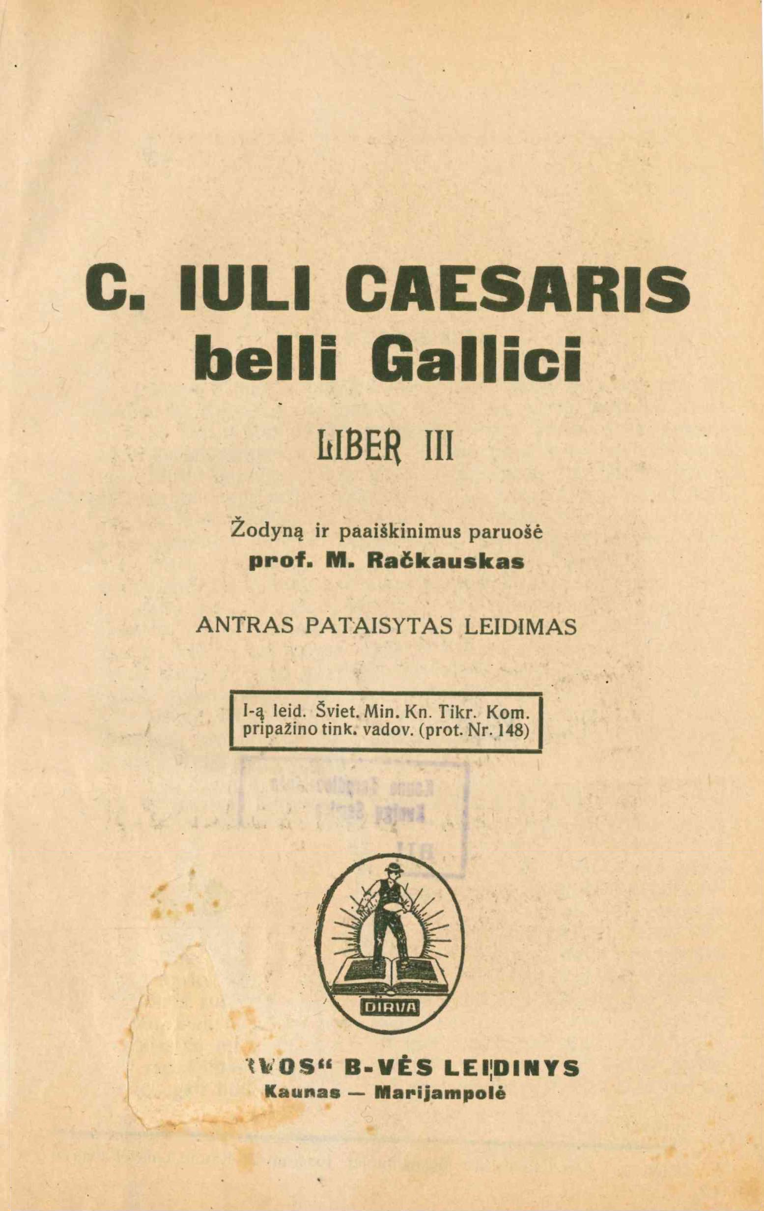 | C. Iuli Caesaris belli Gallici. Liber III / žodyną ir paaiškinimus paruošė M. Račkauskas. – 2–asis patais. leidimas – Kaunas; Marijampolė: Dirva, 1930. – 108, [1], [1] p. [lt] | |