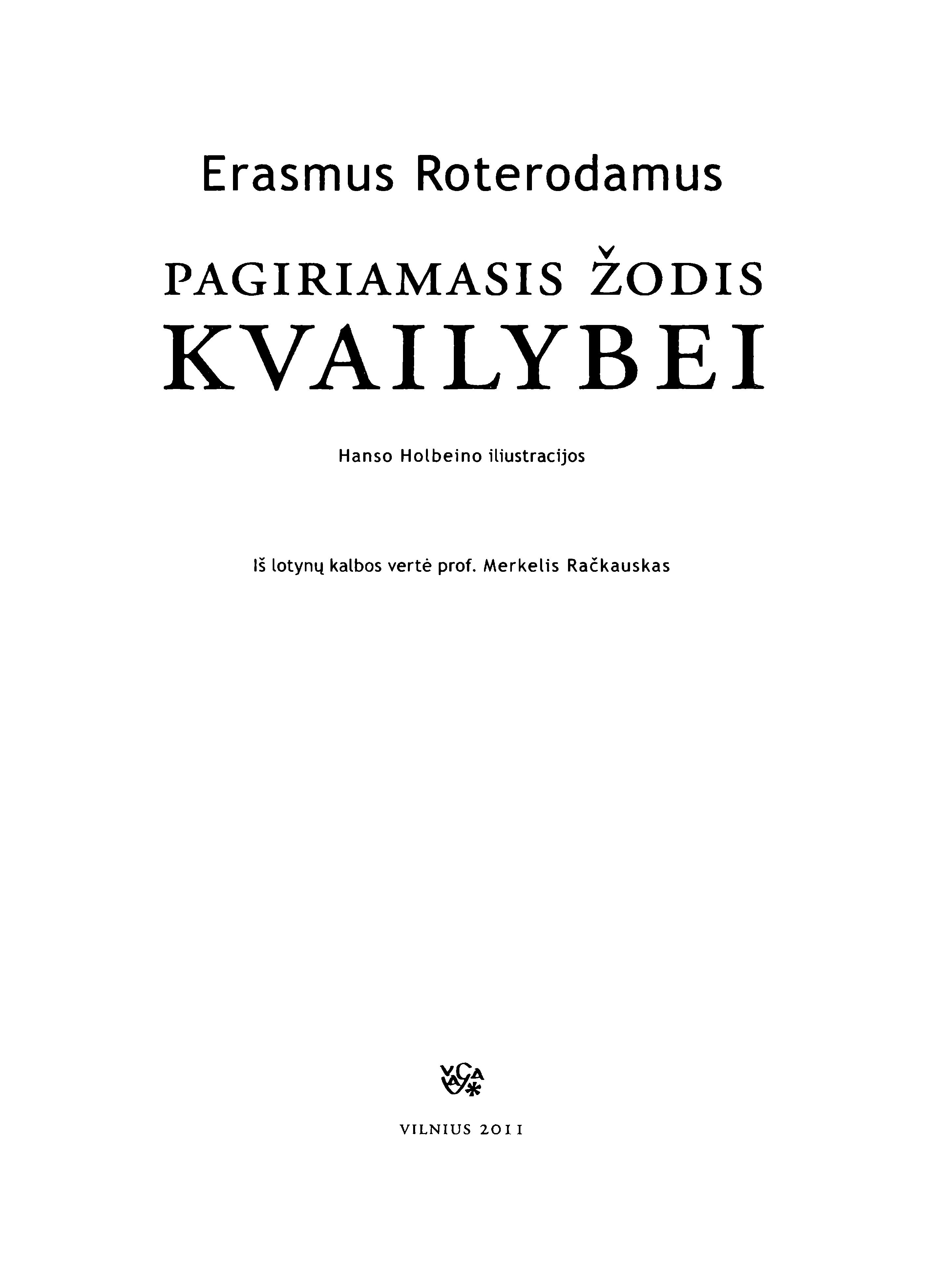 | Erazmas Roterdamietis. Pagiriamasis žodis kvailybei / iš lotynų kalbos vertė M. Račkauskas. – [4–as leidimas]. – Vilnius: Vaga, 2011. – 218, [3] p. [lt] | |