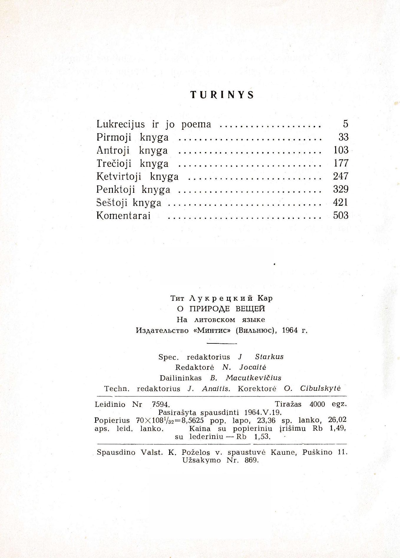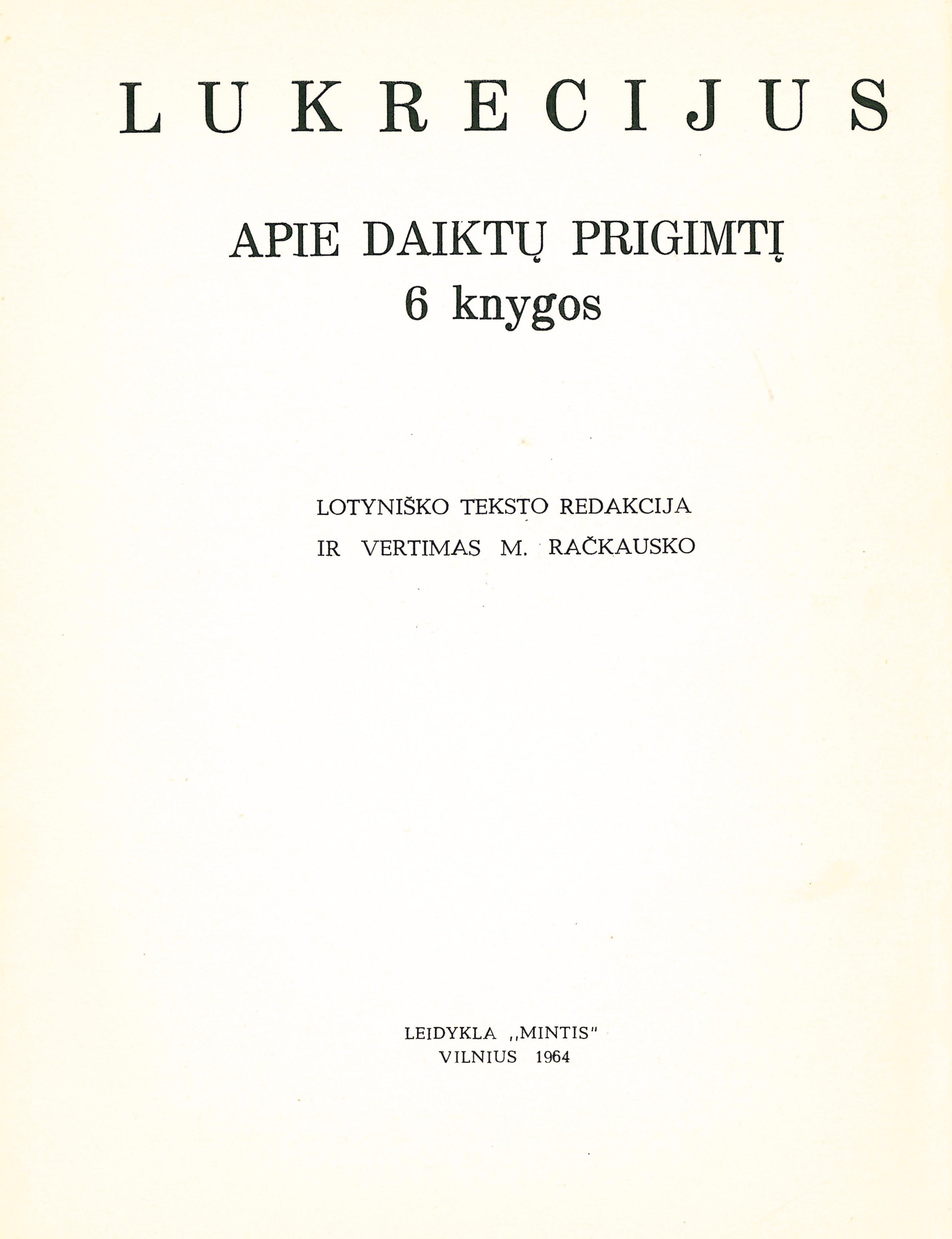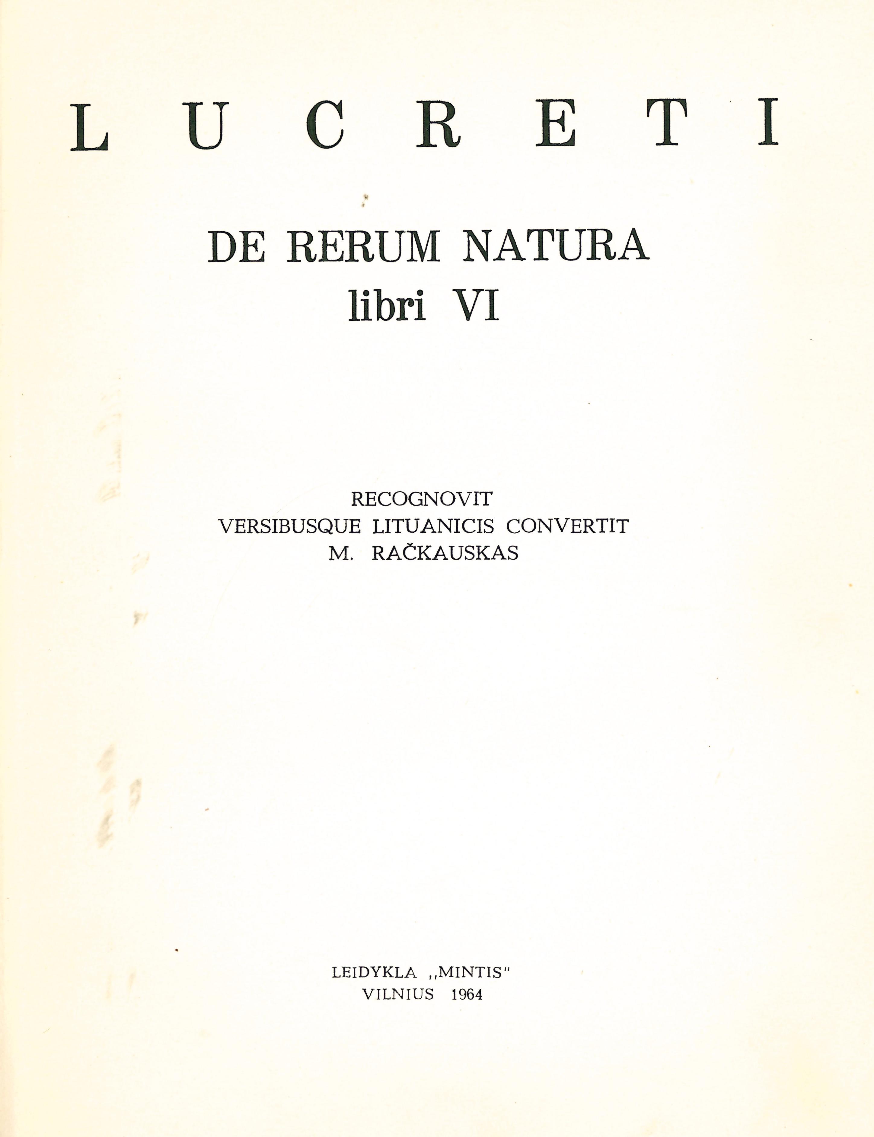 | Antraštė | Apie daiktų prigimtį = De rerum natura : 6 knygos / Lukrecijus ; lotyniško teksto redakcija ir vertimas M. Račkausko; įvadas ir komentarai H. Zabulio. – Vilnius : Mintis, 1964. – 546 p. – Gretut. tekstas liet., lot. [lt] |