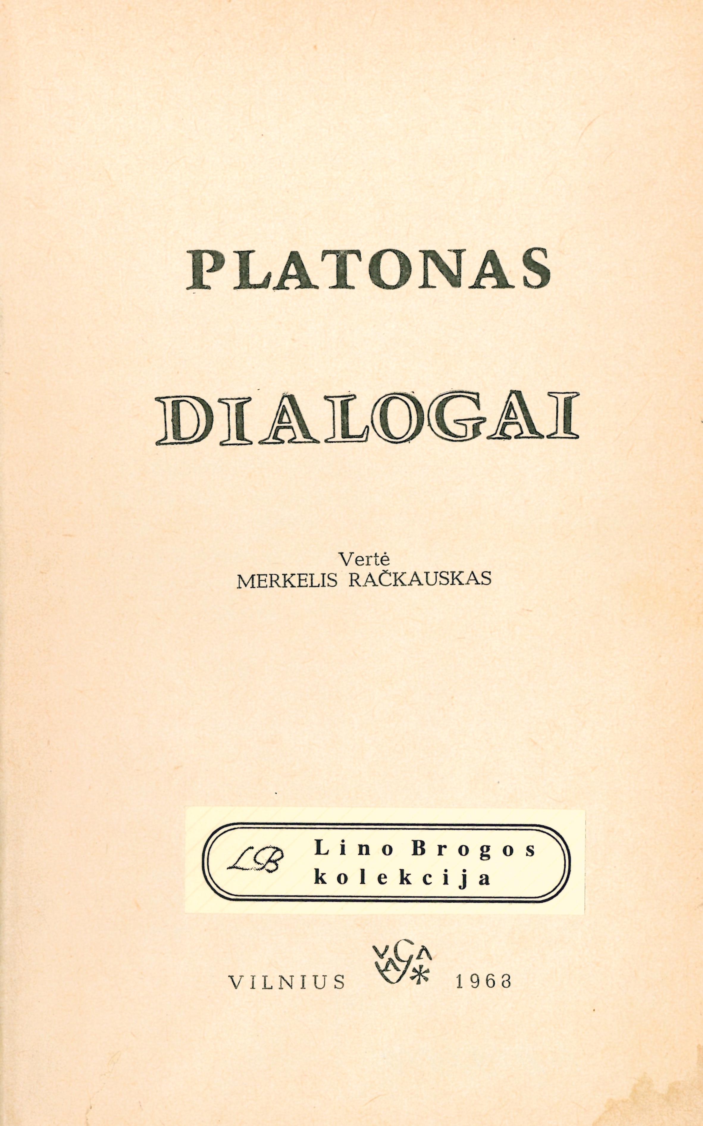 | Antraštė | Dialogai [Sokrato Apologija; Kritonas; Fedonas; Puota] / Platonas; vertė Merkelis Račkauskas. – Vilnius: Vaga, 1968. – 274, [2] p. [lt] |