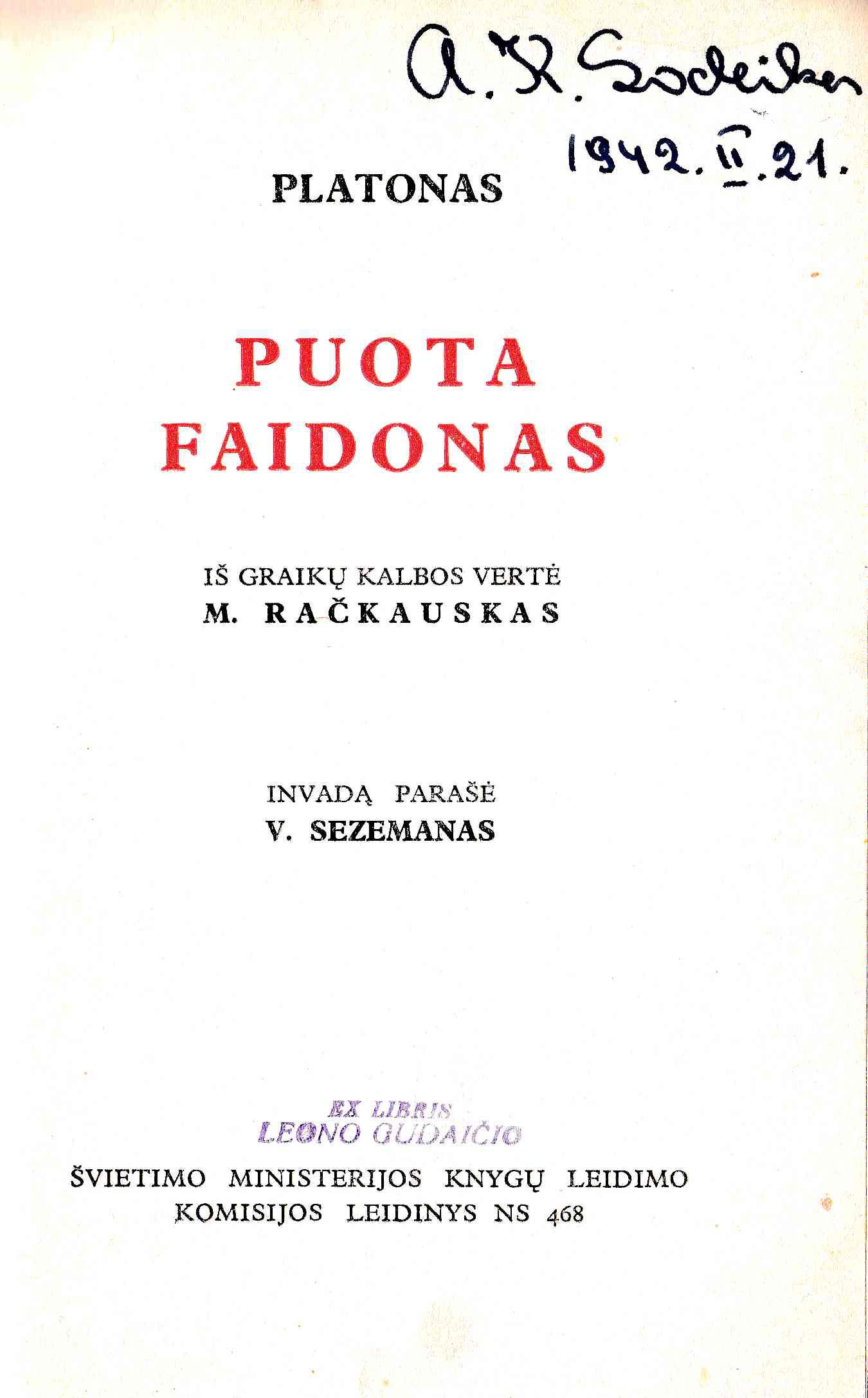 | Antraštė | Puota; Faidonas / Platonas; iš graikų kalbos vertė M. Račkauskas; įvadą parašė V. Sezemanas. – Klaipėda: Švietimo ministerijos Knygų leidimo komisija, 1935. – XXXIX, 256 p. [lt] |