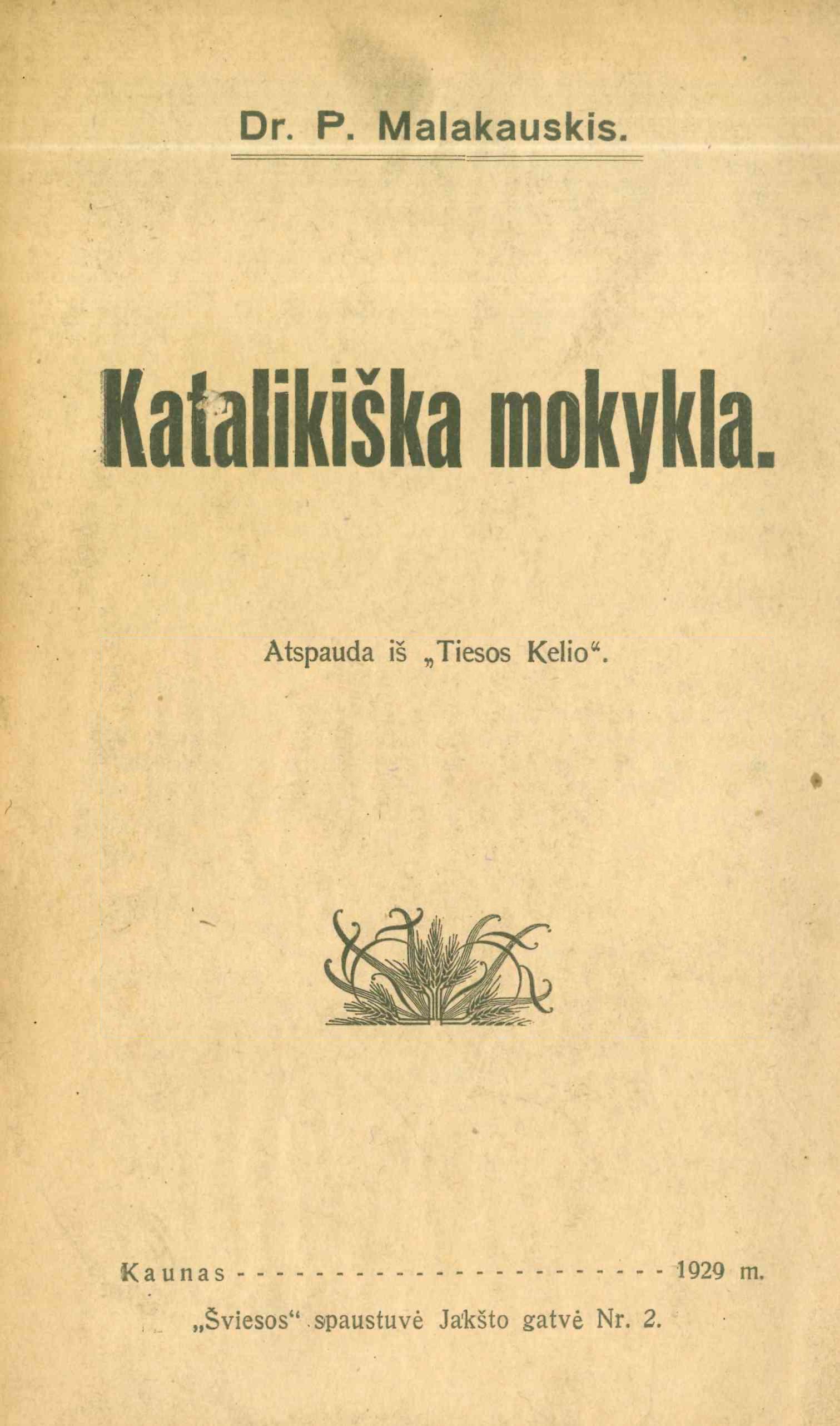 | Antraštė | Katalikiška mokykla / Petras Malakauskis. – Kaunas: [s.n.], 1929. – 46 p. [lt] |