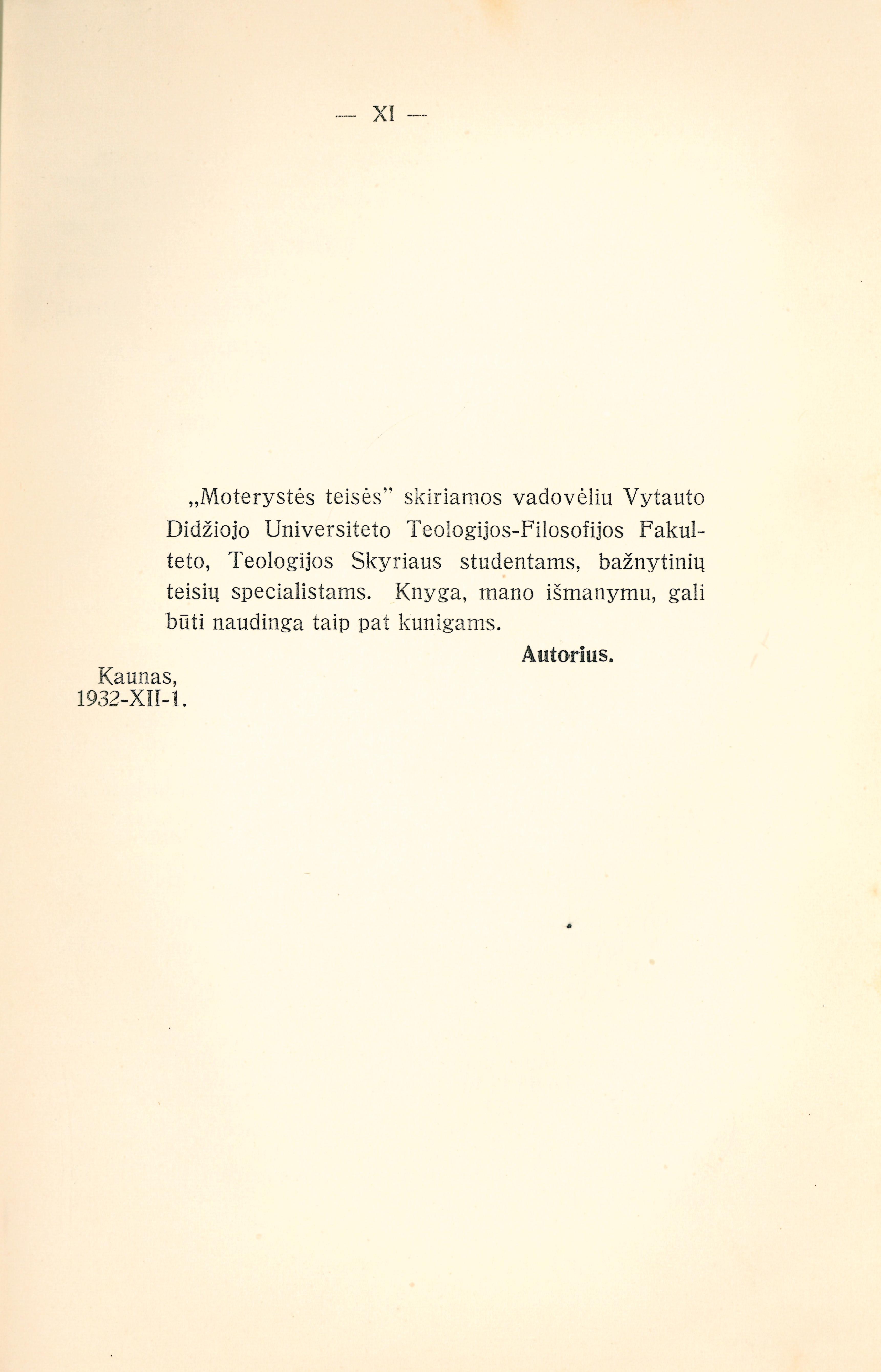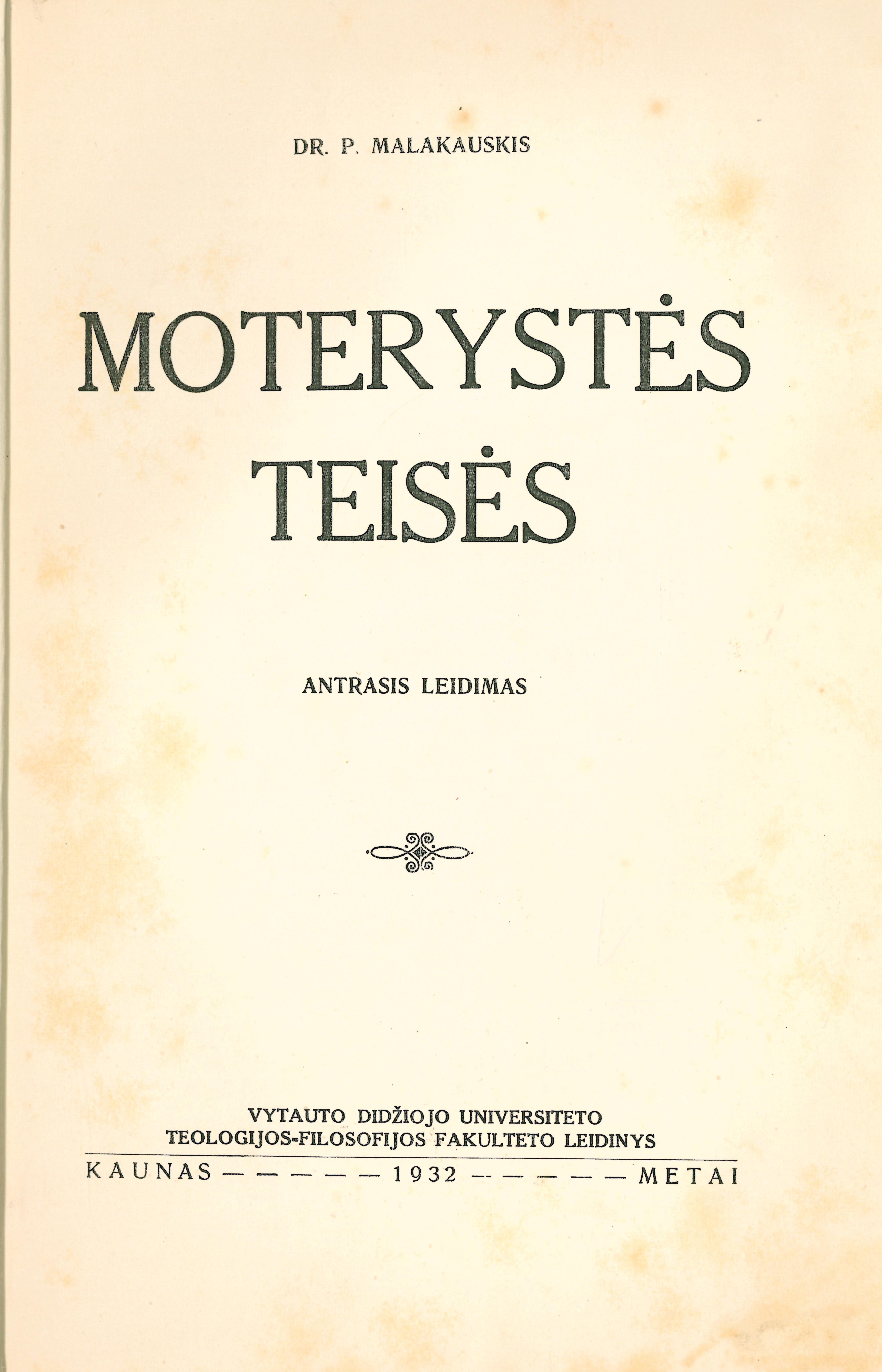 Moterystės teisės / P. Malakauskis. – 2-asis leid. – Kaunas : Vytauto Didžiojo Universiteto Teologijos-Filosofijos fakultetas, 1932. – XV, 511 p.