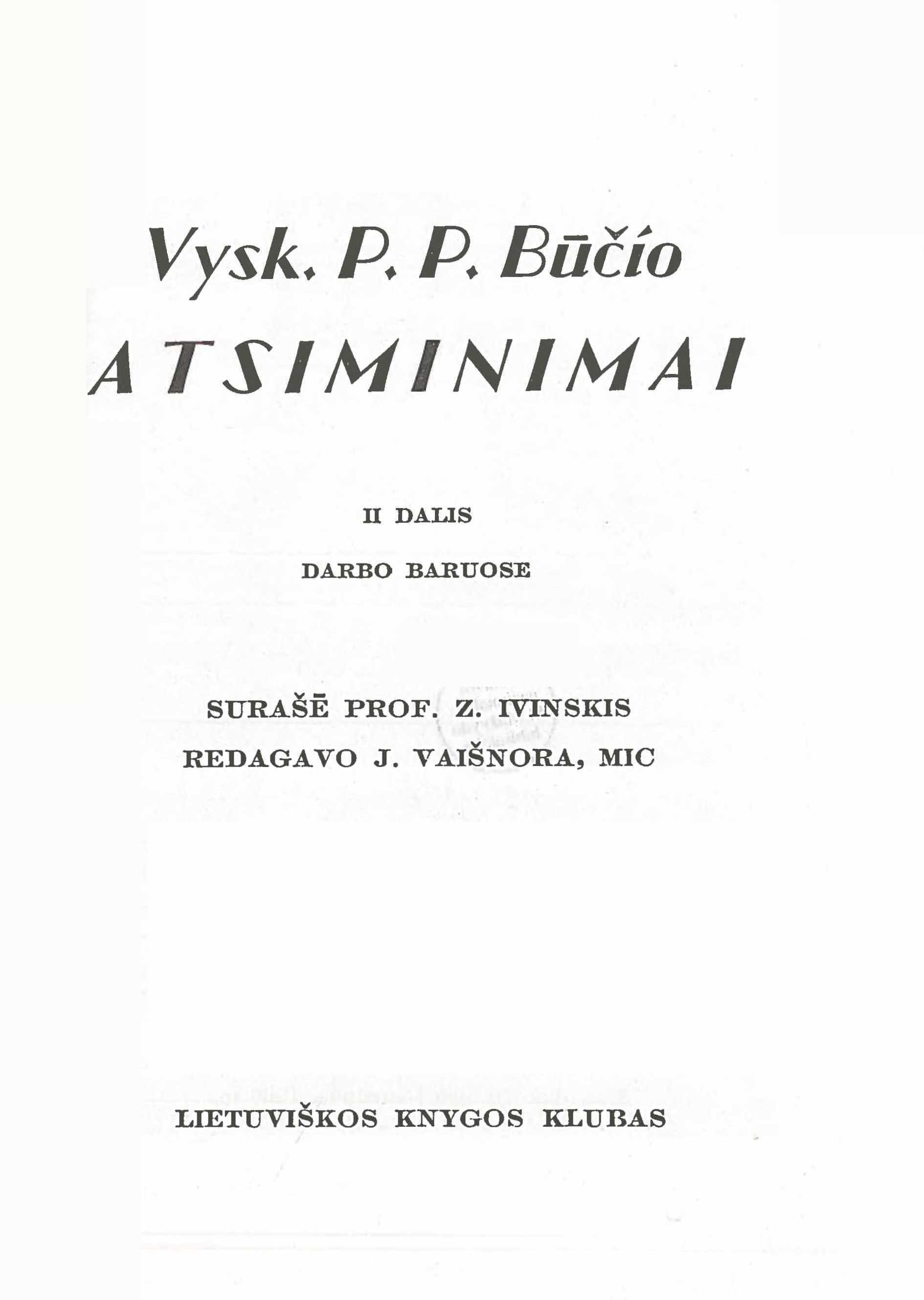 | Antraštė | Vysk. P. P. Būčio atsiminimai. D. 2: Darbo baruose / surašė Z. Ivinskis, redagavo J. Vaišnora. – Chicago: Lietuviškos knygos klubas, 1966. – 284 p. [lt] |