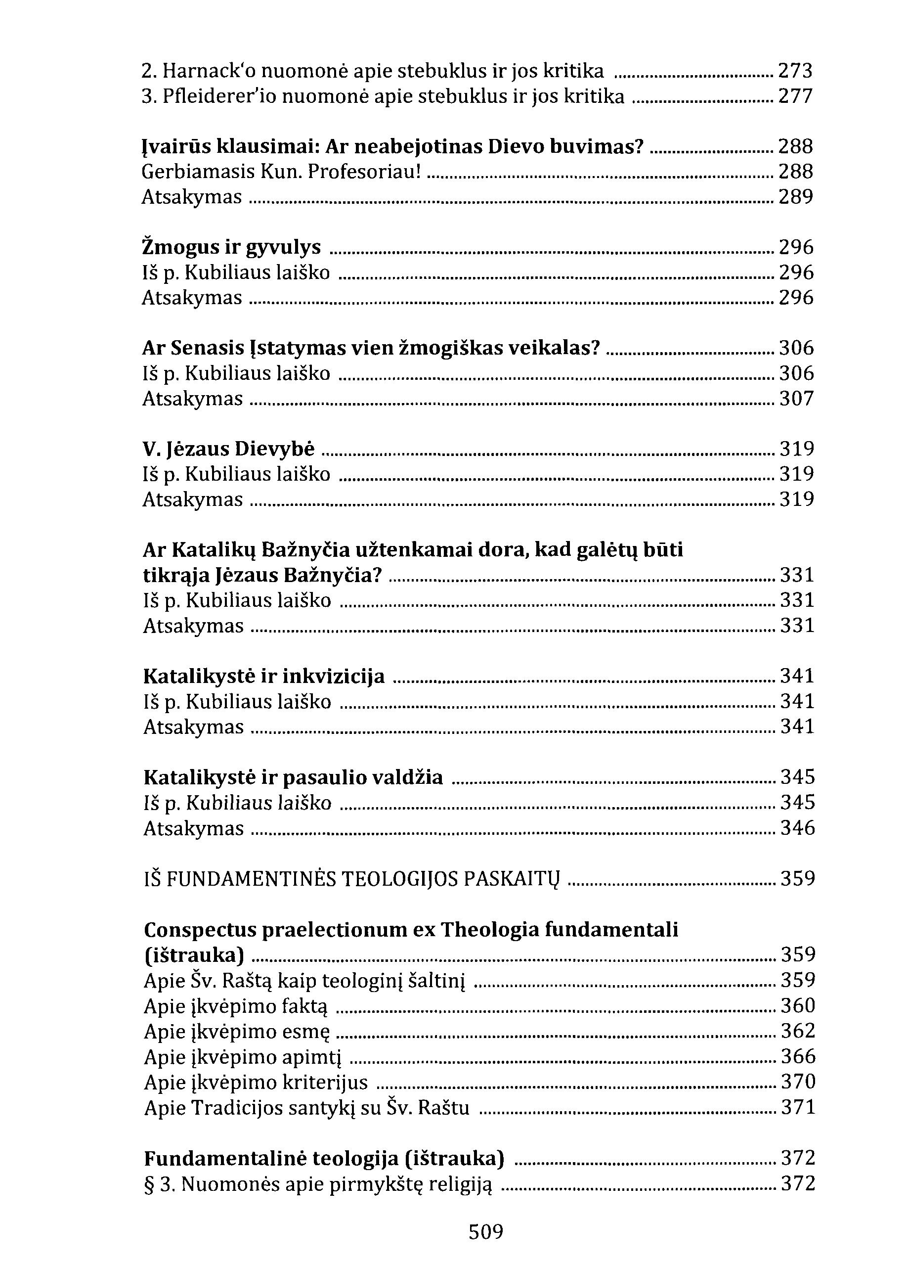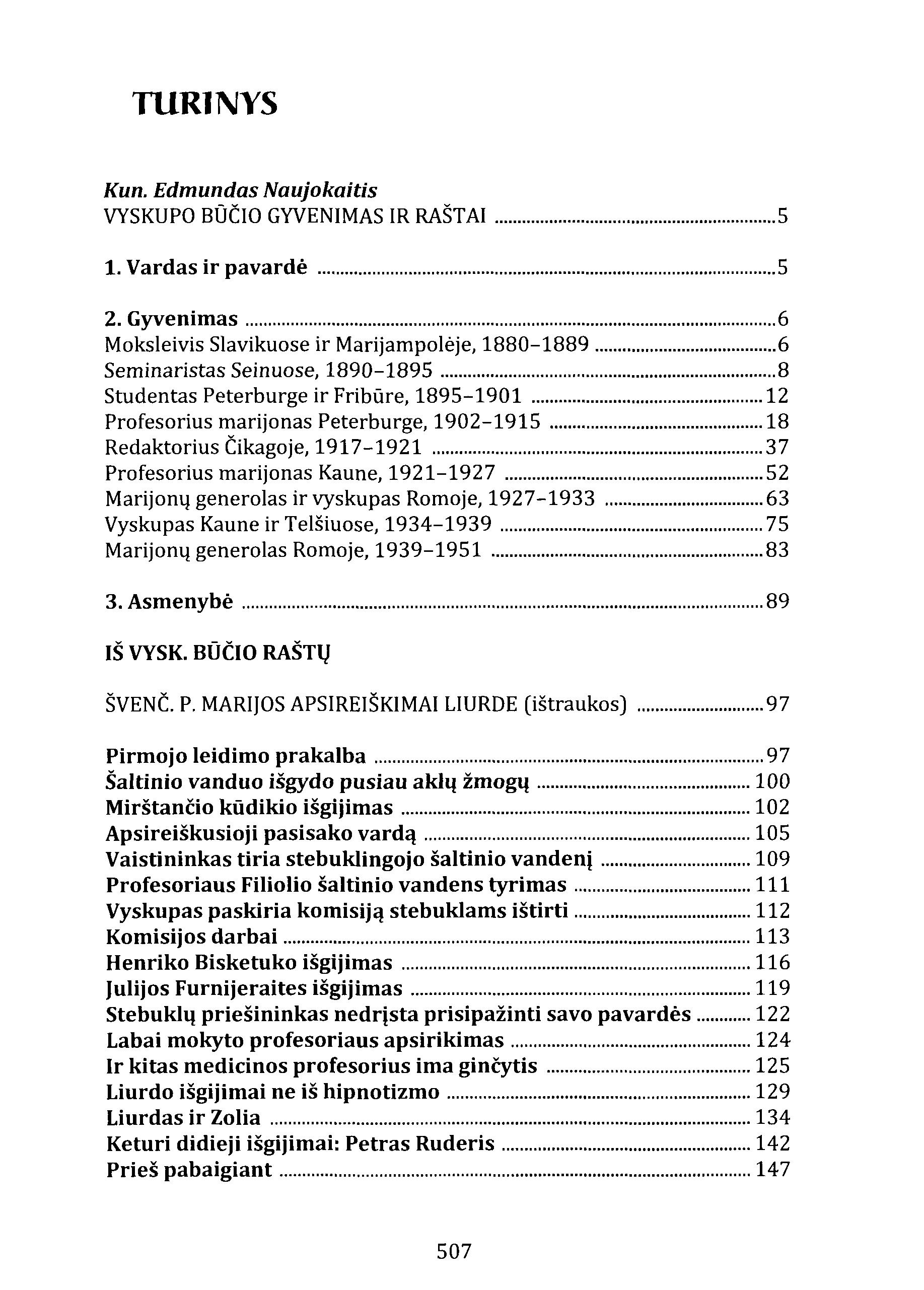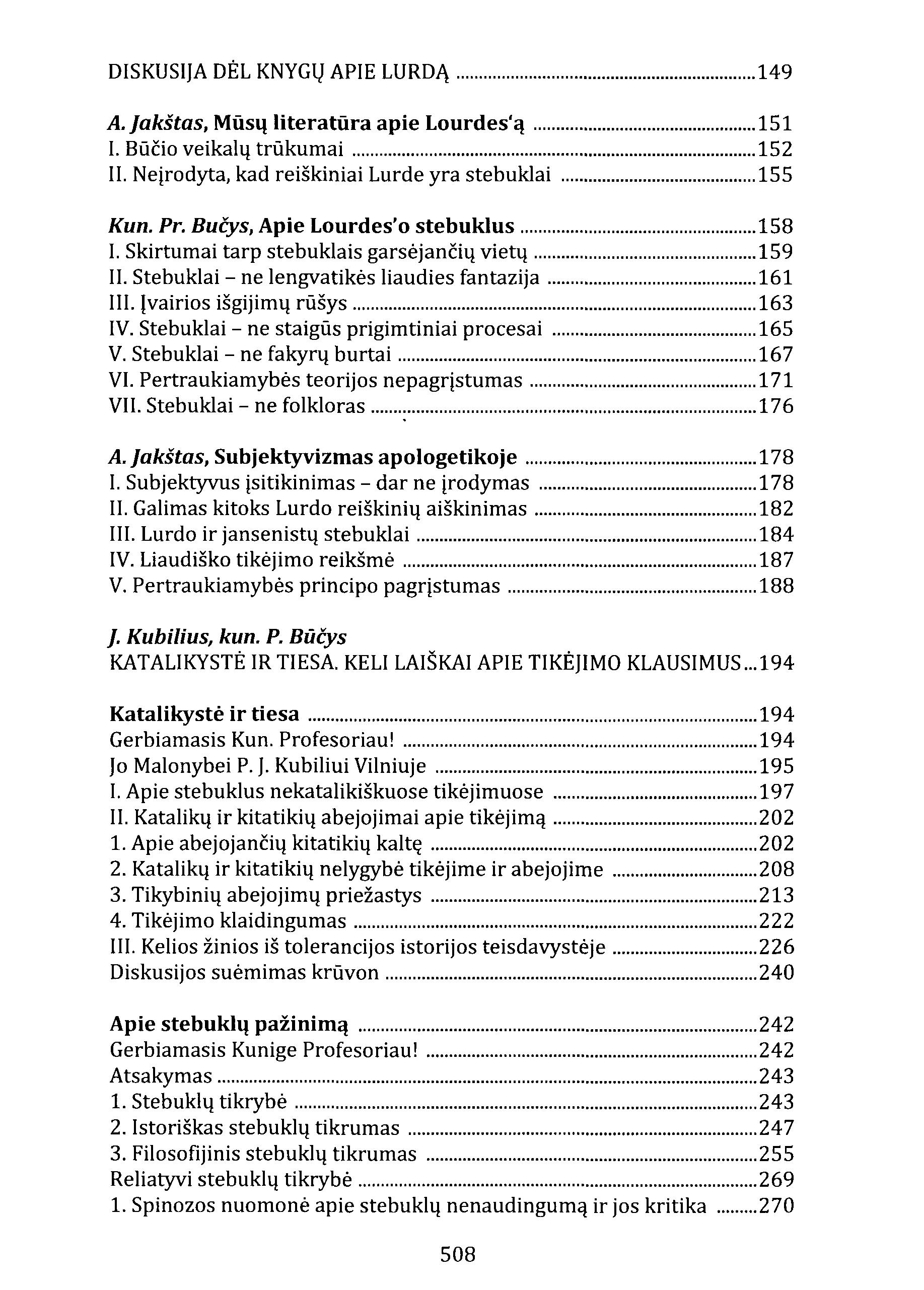 | Turinys: Švenčiausiosios Panelės apsireiškimai Liurde – ištraukos (1909); Adomo Jakšto ir Prano Būčio diskusija dl knygų apie Lurdą(1910-1911); Pokalbiai laiškais su Jonu Kubiliumi (1911-1913); Conspectus praelectionum ex Theologia fundamentali – ištrauka (1911); Fundamentalinė teologija – ištrauka (1928); Religijos kilmė (1928); Katalikybė ir tautų pažanga (1927); Naujokaitis Edmundas. Vyskupo Būčio gyvenimas ir raštai (p. 5-96); P.P. Būčio bibliografija (443-506). [lt] | |