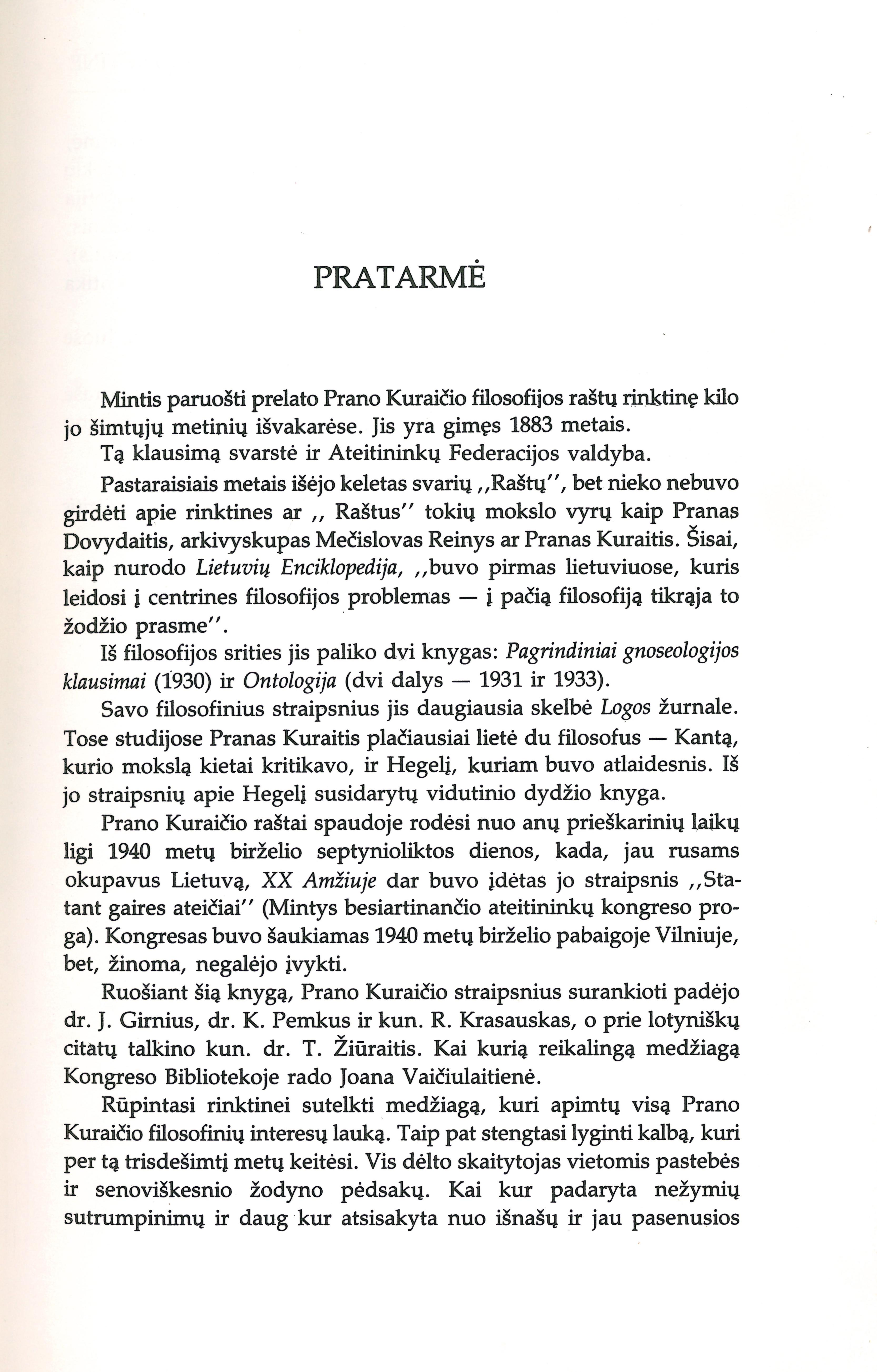 Filosofijos raštų rinktinė / Pranas Kuraitis ; spaudai paruošė A. Vaičiulaitis. – Oak Lawn (Ill.) : Ateitis, 1990. – VI, 382 p.