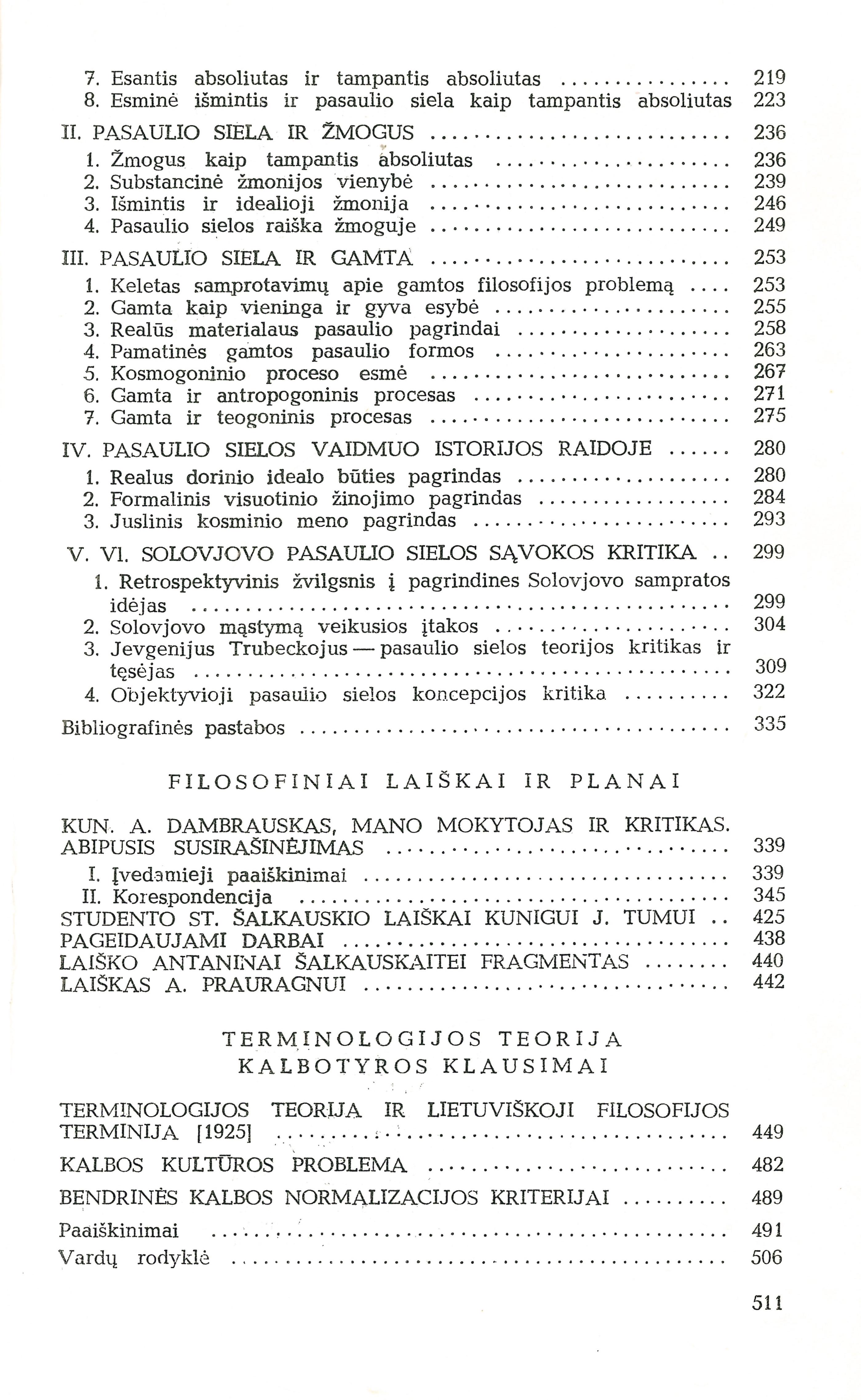 | Filosofiškoji Dievo sąvoka (1913); Bažnyčia bei kultūra (1913); Tikėjimas ir scholastinė filosofija (1917); Vladimiro Solovjovo mistiniai regėjimai (1918); Pasaulio siela Vladimiro Solovjovo filosofijoje (1920); Kun. A. Dambrauskas – mano mokytojas ir kritikas. Abipusis susirašinėjimas (1938); Laiškai kunigui J. Tumui (1922); Terminologijos teorija ir lietuviškoji filosofijos terminija (1925); Kalbos kultūros problema (1937). | |