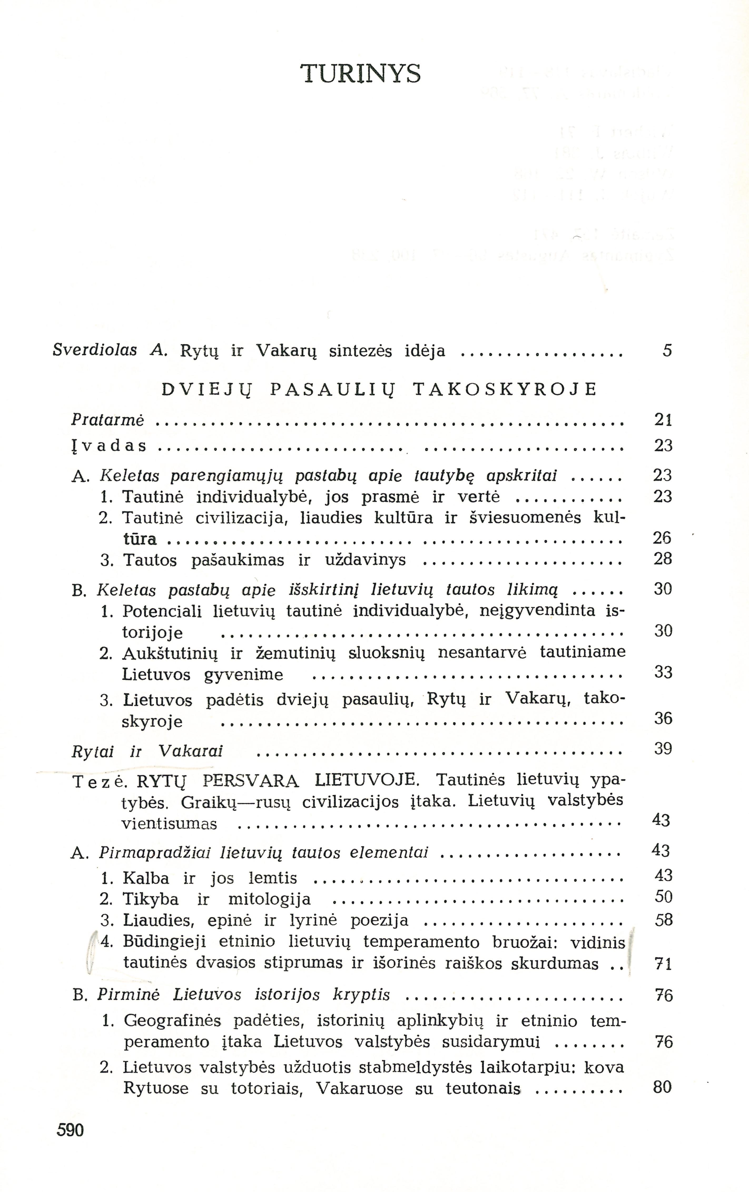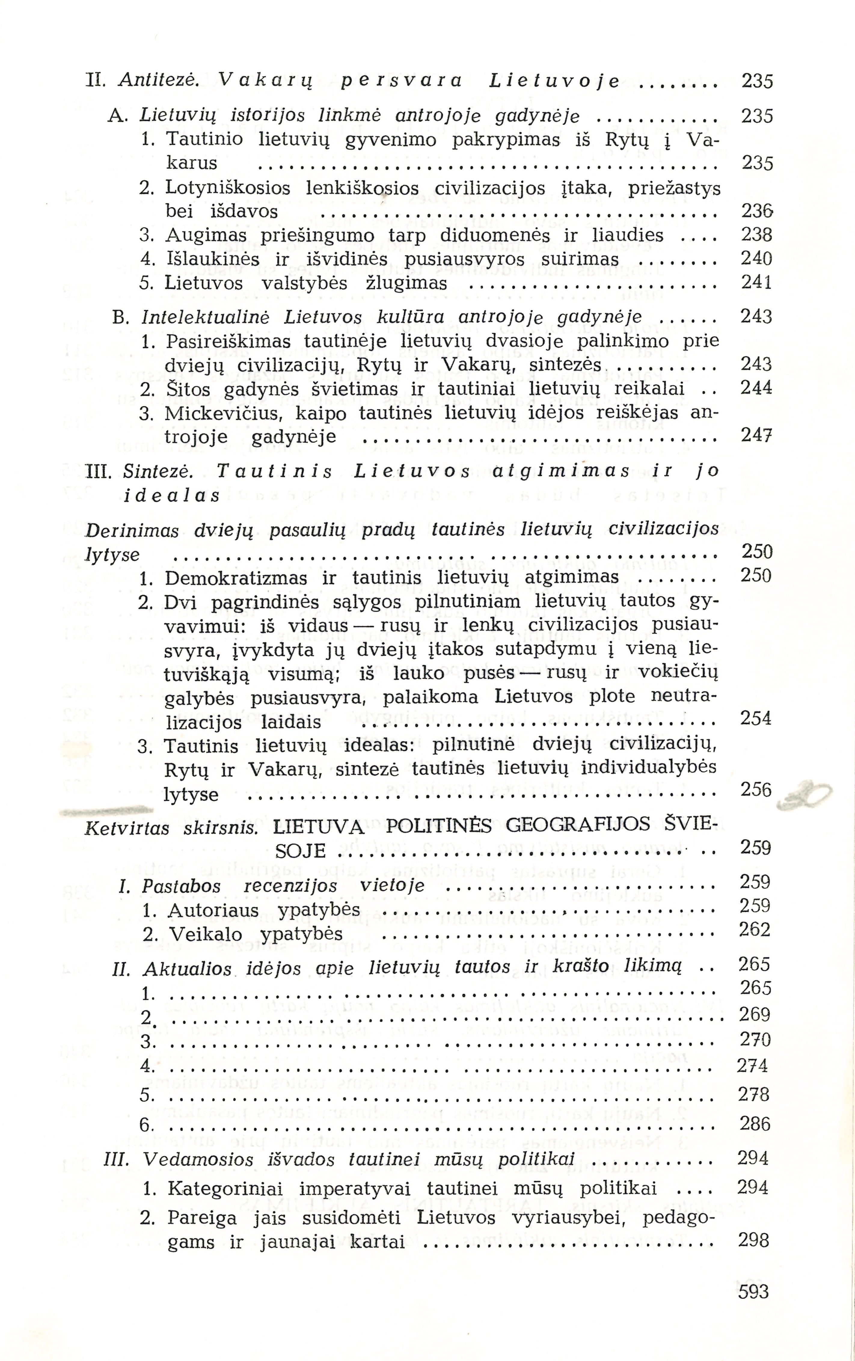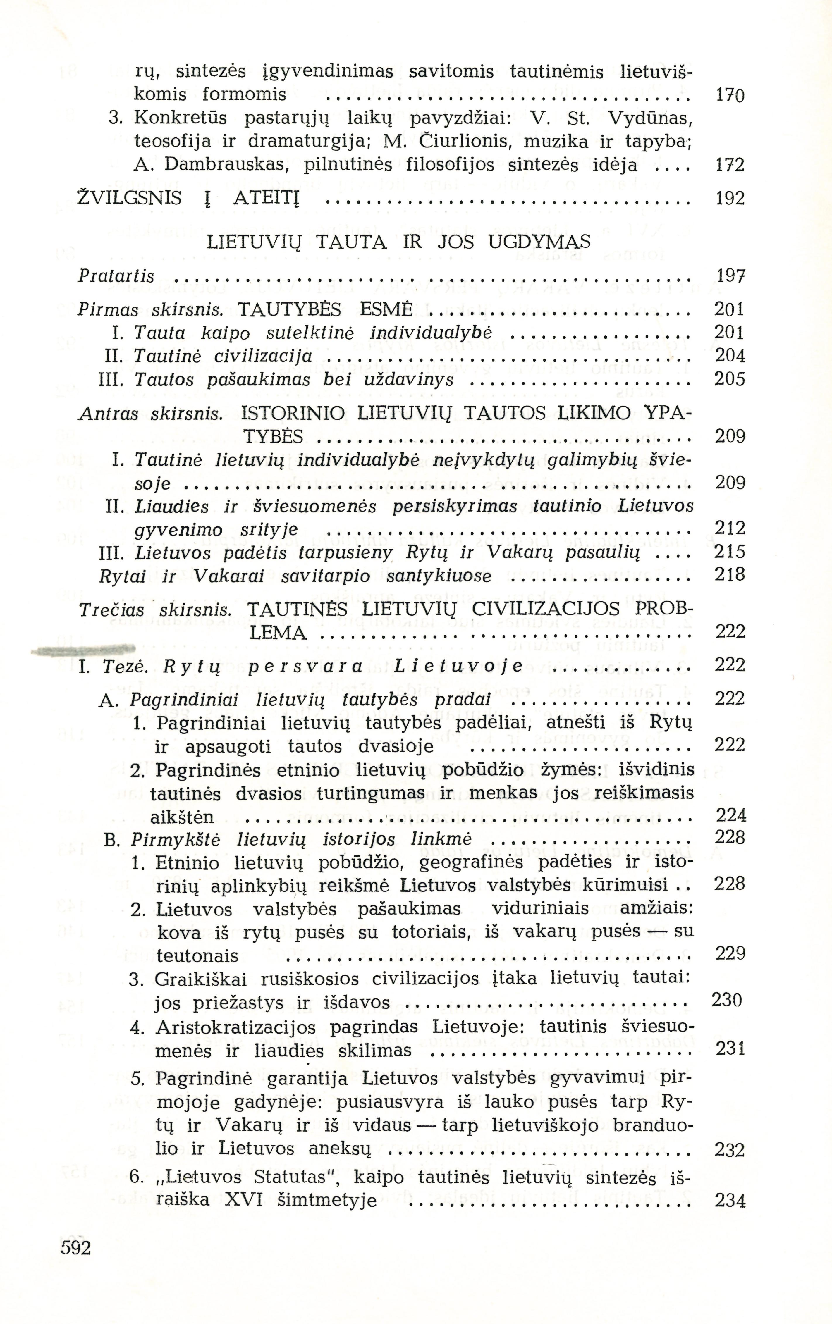 | Dviejų pasaulių takoskyroje: sintetinis esė apie Lietuvos tautinės civilizacijos problemą (1917-1919); Lietuvių tauta ir jos ugdymas (1933); Lietuvių tautos fizionomija (1917); Geopolitinė Lietuvos padėtis ir lietuvių kultūros problema (1938); Lietuviai, istorinių paradoksų tauta (1937); Kultūrinio lietuvių tautos apsiginklavimo problema ir katolicizmas (1939); Lietuvių tauta ir jos ateitis (1939); Inteligentijos koncepcija (1939); Universiteto koncepcija (1939); Universitetas ir tautos gyvenimas (1940). | |