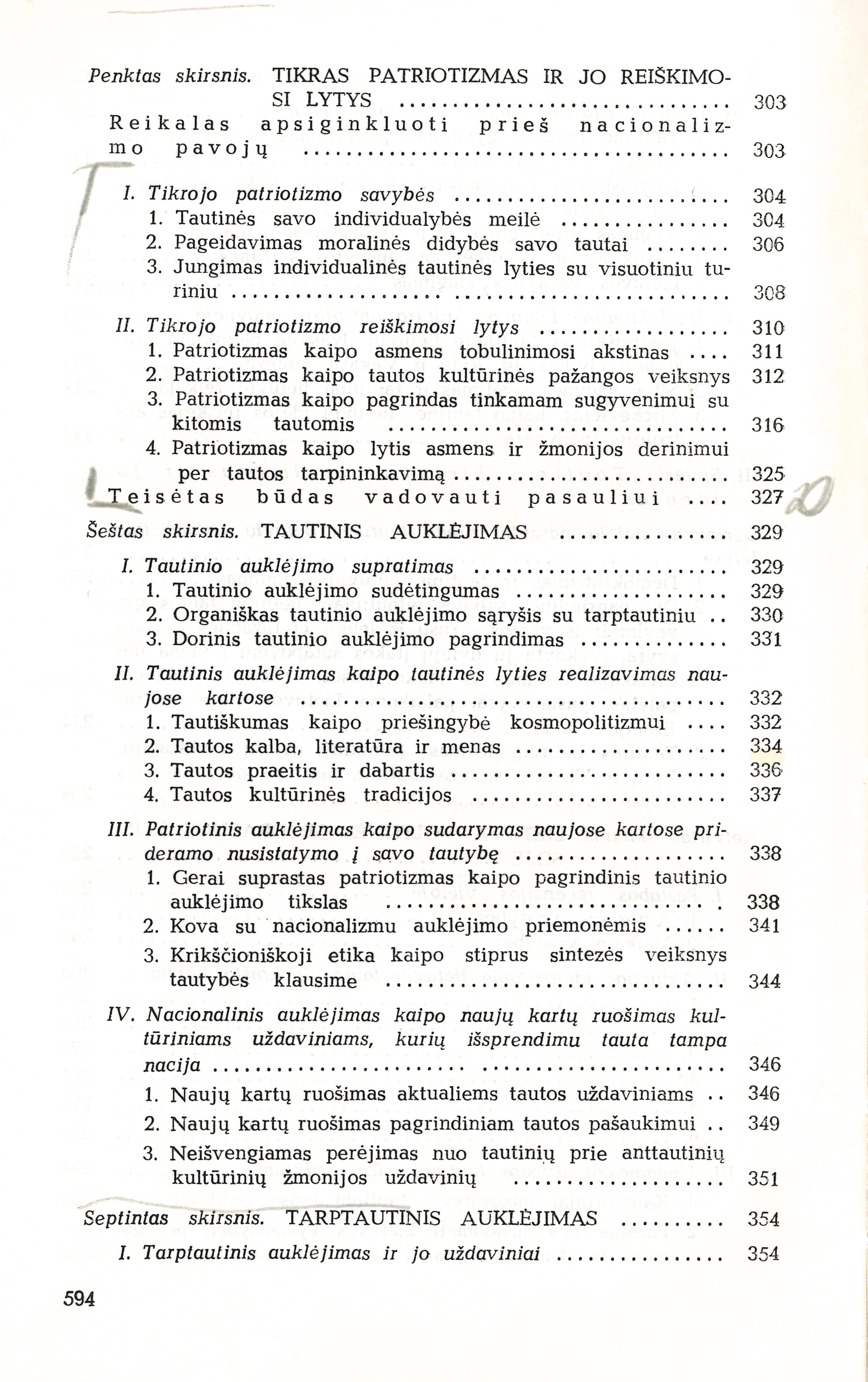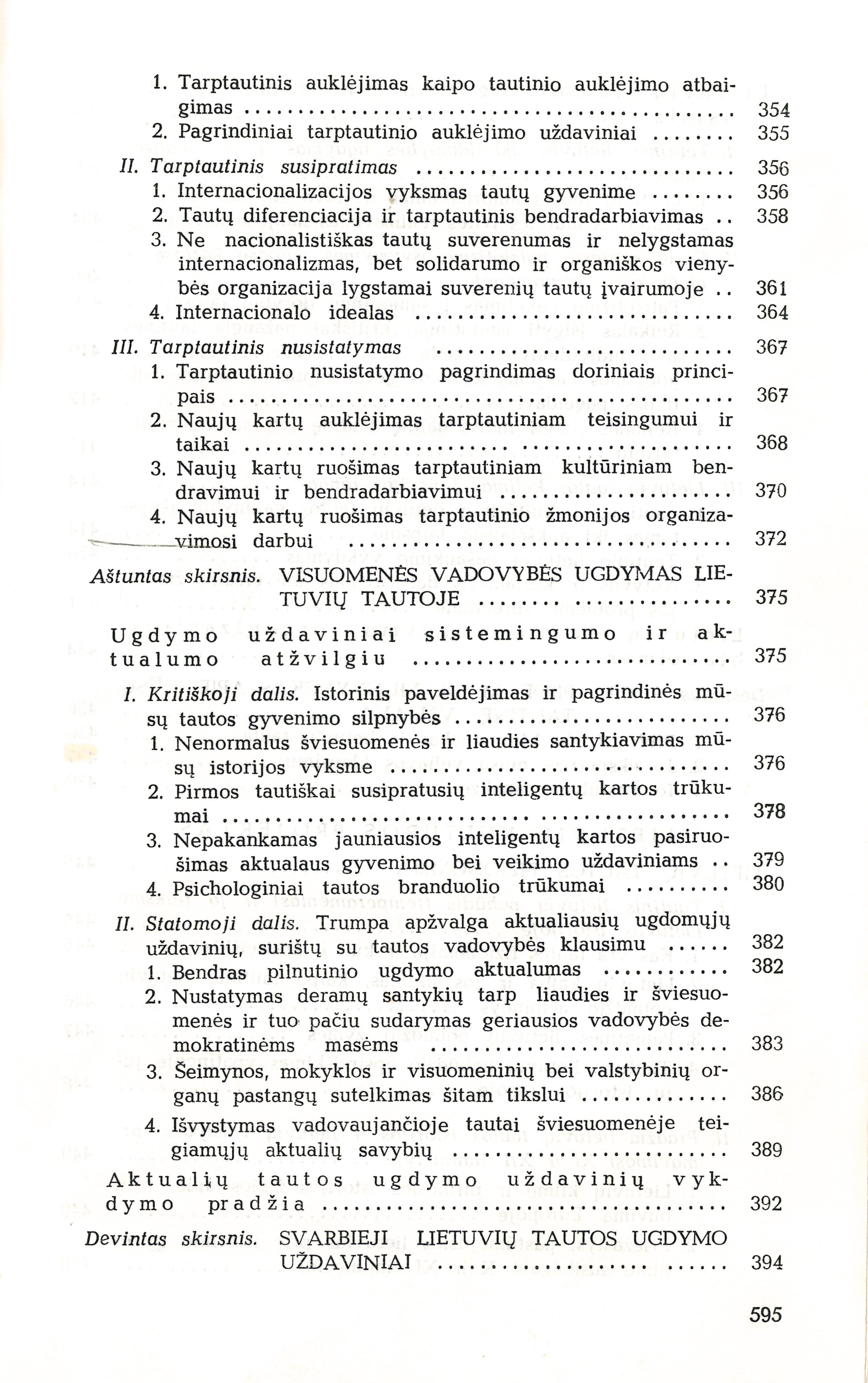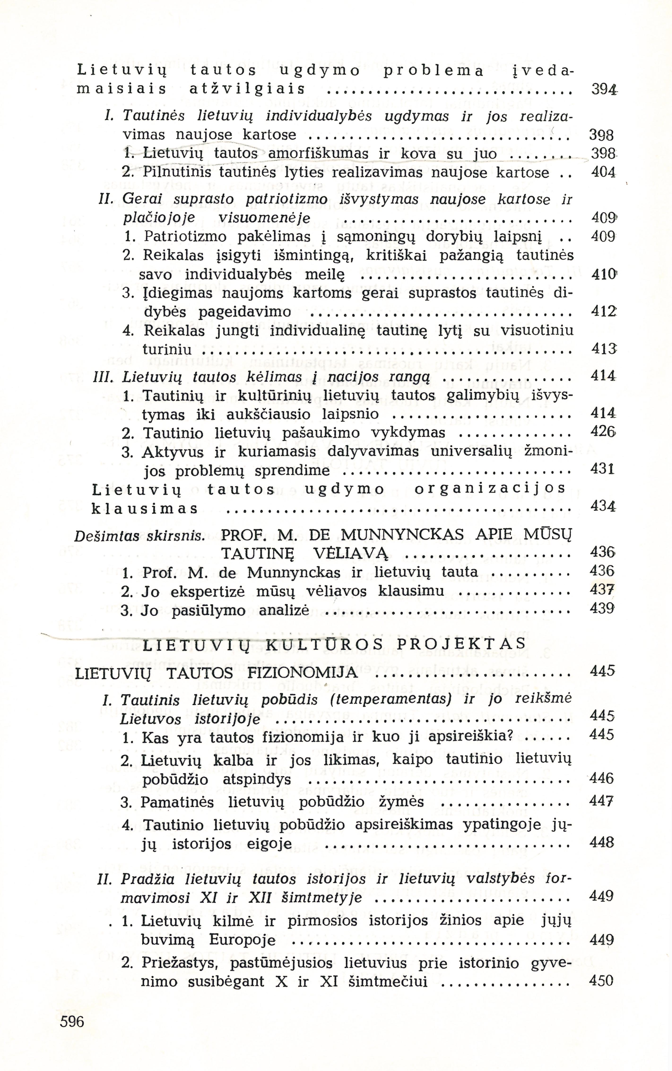 | Dviejų pasaulių takoskyroje: sintetinis esė apie Lietuvos tautinės civilizacijos problemą (1917-1919); Lietuvių tauta ir jos ugdymas (1933); Lietuvių tautos fizionomija (1917); Geopolitinė Lietuvos padėtis ir lietuvių kultūros problema (1938); Lietuviai, istorinių paradoksų tauta (1937); Kultūrinio lietuvių tautos apsiginklavimo problema ir katolicizmas (1939); Lietuvių tauta ir jos ateitis (1939); Inteligentijos koncepcija (1939); Universiteto koncepcija (1939); Universitetas ir tautos gyvenimas (1940). | |