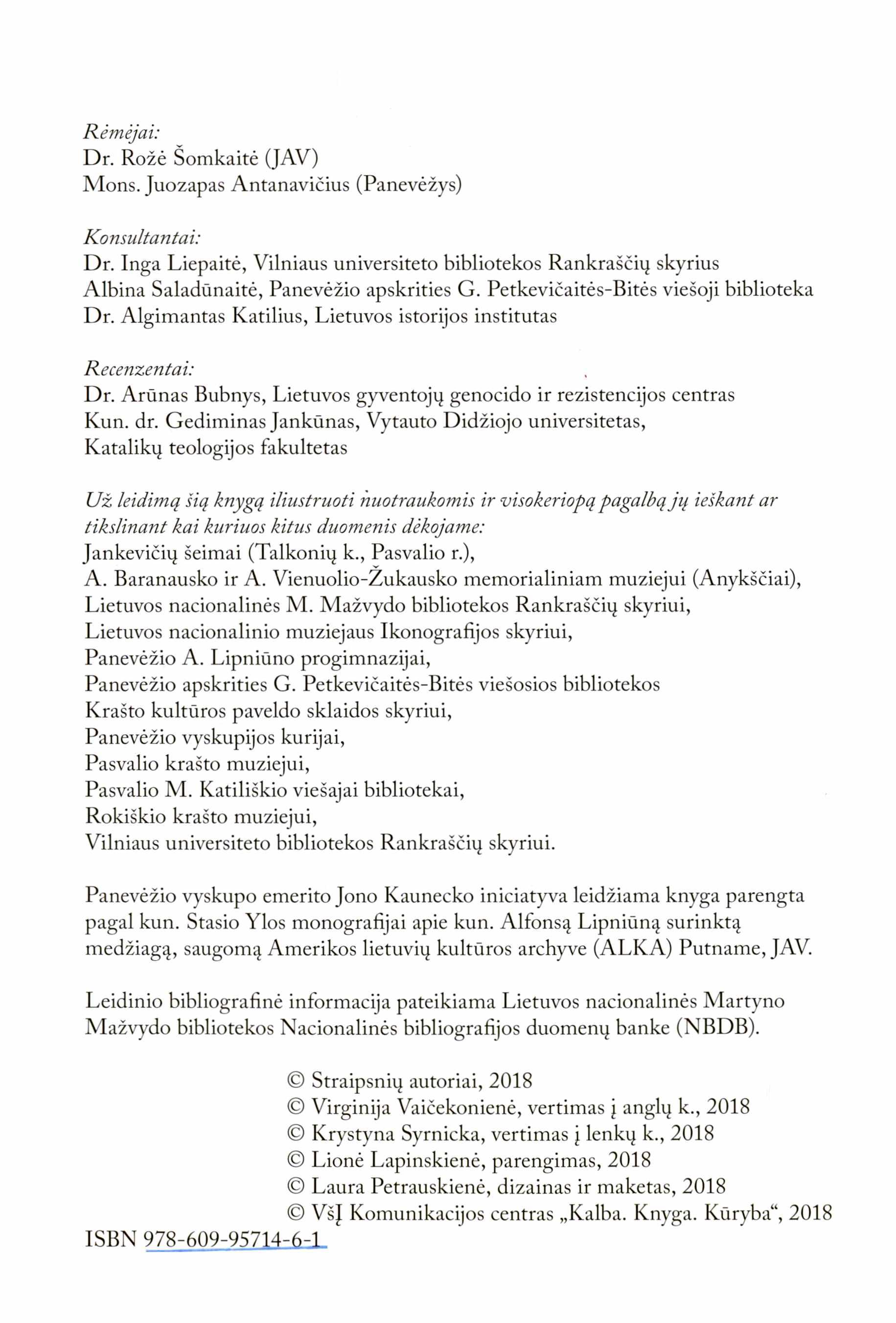 | Antraštė | Kunigas Alfonsas Lipniūnas: monografijos apmatai / Stasys Yla. – Panevėžys: Komunikacijos centras "Kalba. Knyga. Kūryba", 2018. – 214 p. [lt] |