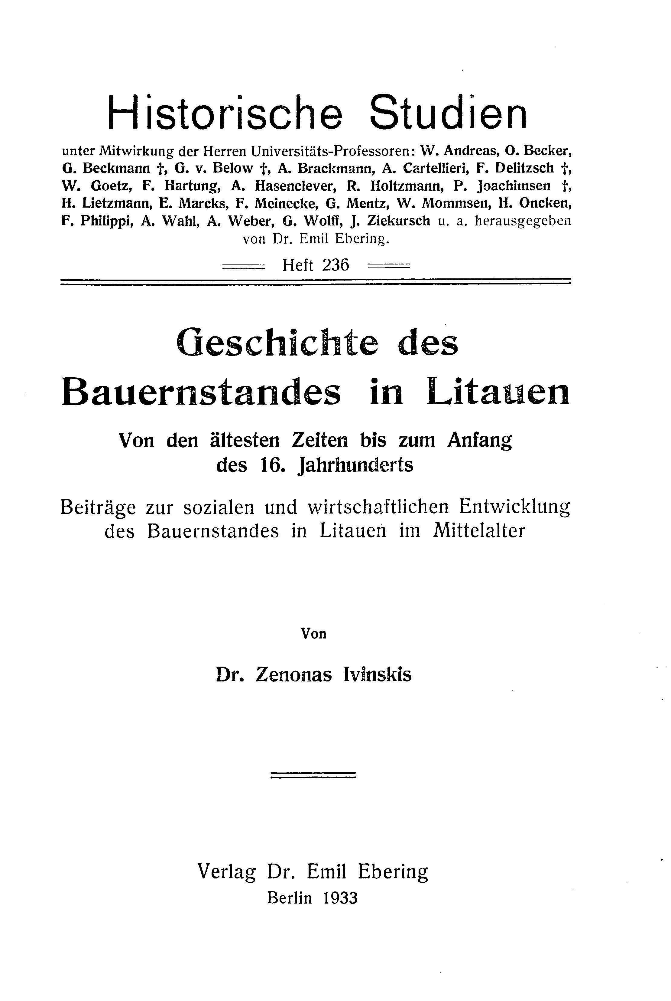 | Antraštė | Geschichte des Bauernstandes in Litauen: von den ältesten Zeiten bis zum Anfang des 16. Jahrhunderts. Beiträge zur sozialen und wirtschaftlichen Entwicklung des Bauenstandes in Litauen im Mittelalter / Zenonas Ivinskis. – Berlin: E. Ebering, 1933. – 264 p. [de] |