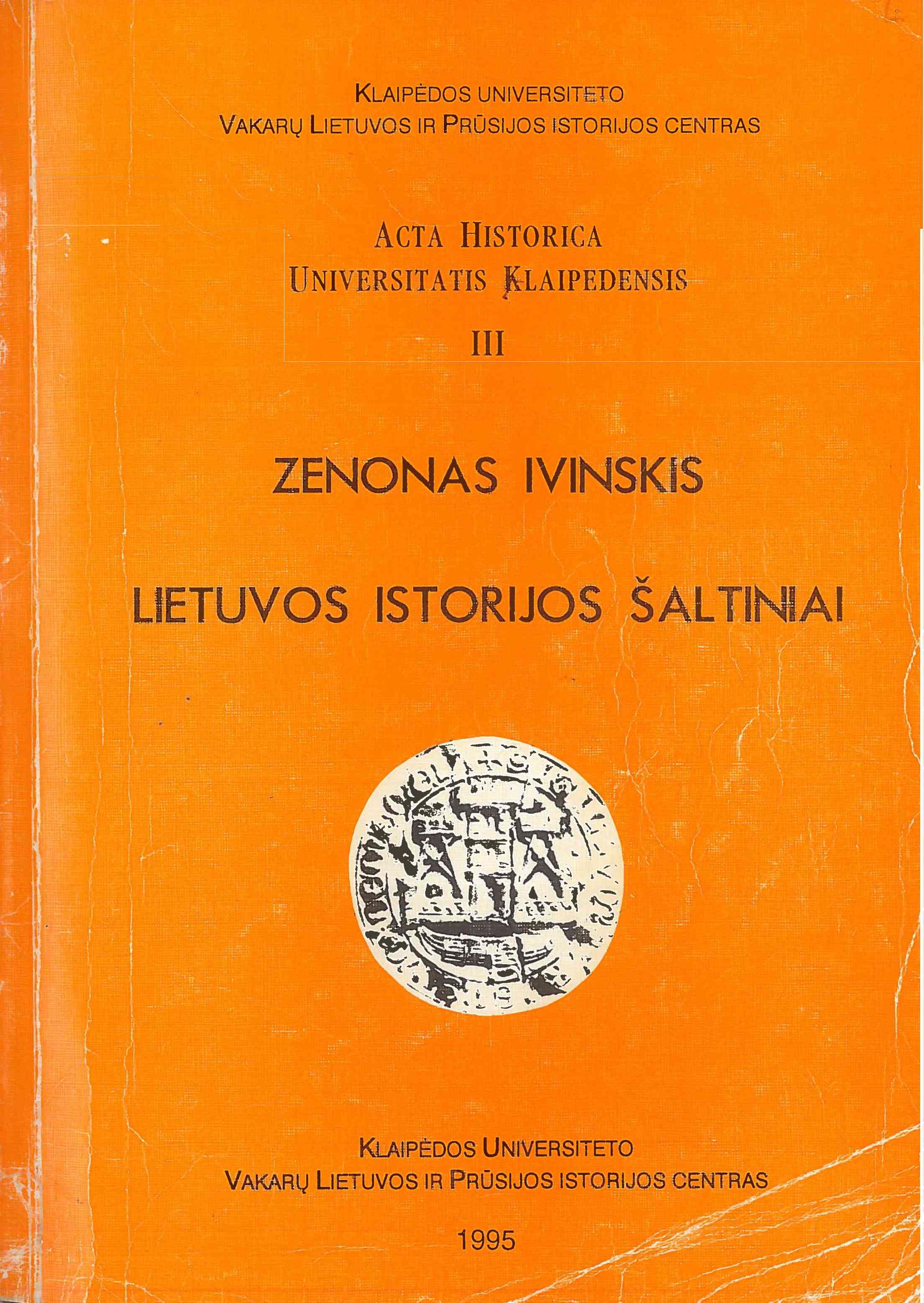 | Antraštė | Lietuvos istorijos šaltiniai / Zenonas Ivinskis. – Klaipėda: KU Vakarų Lietuvos ir Prūsijos istorijos centras, 1995. – 115 p. (Acta historica Universitatis Klaipedensis, t. 3) [Parengta 1941] [lt] |