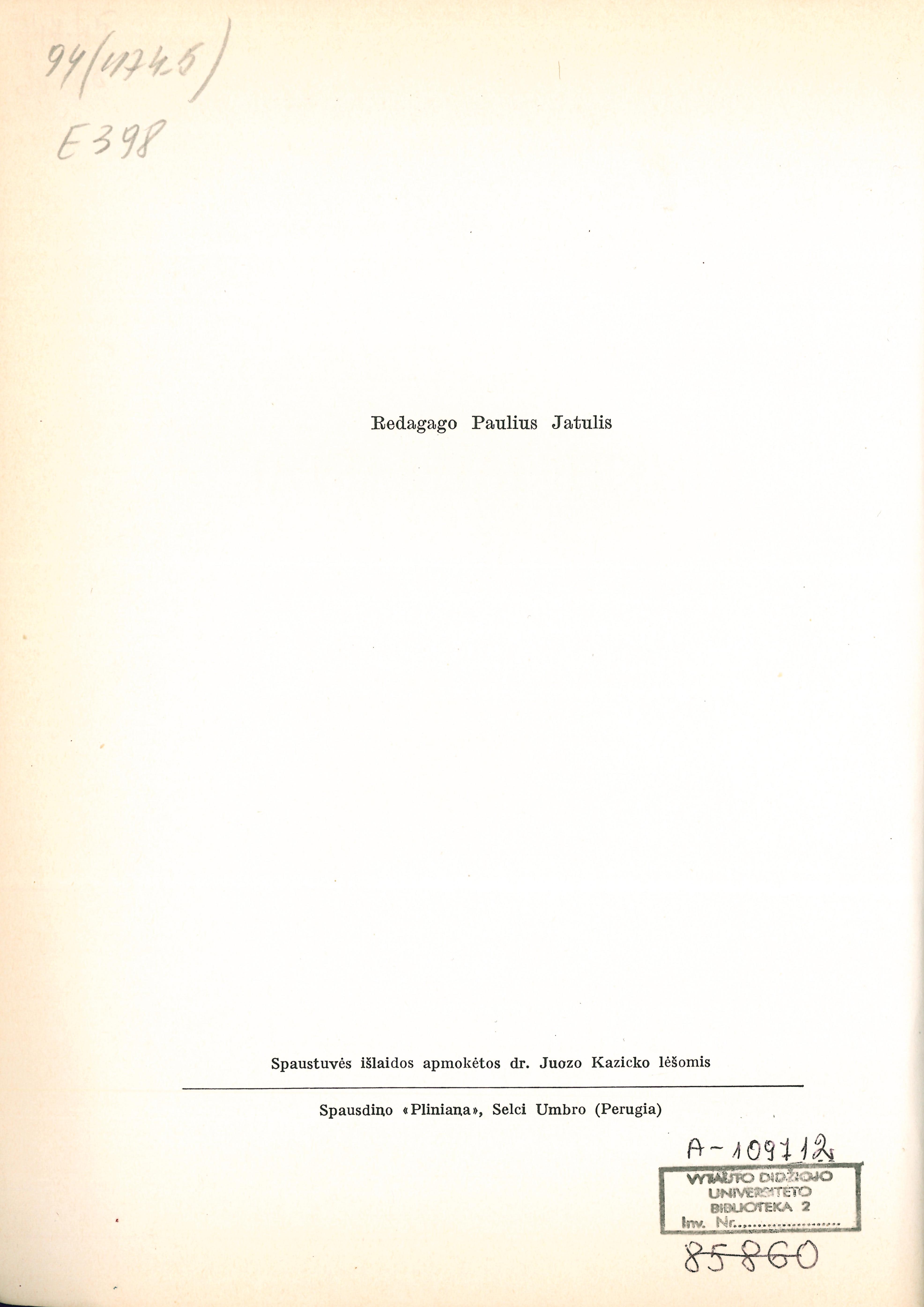 | Published | Roma: Lietuvių katalikų mokslo akademija, 1986 |