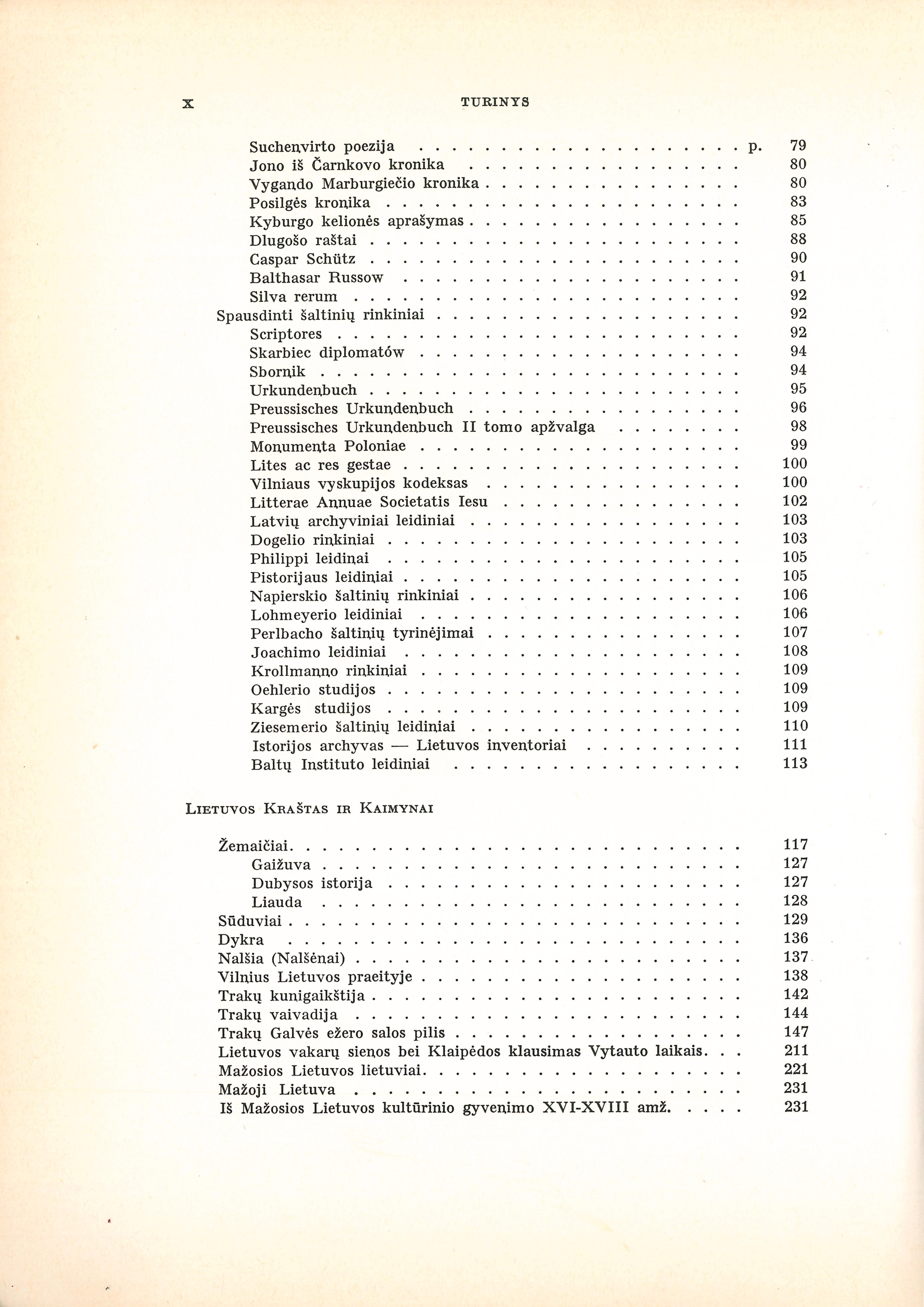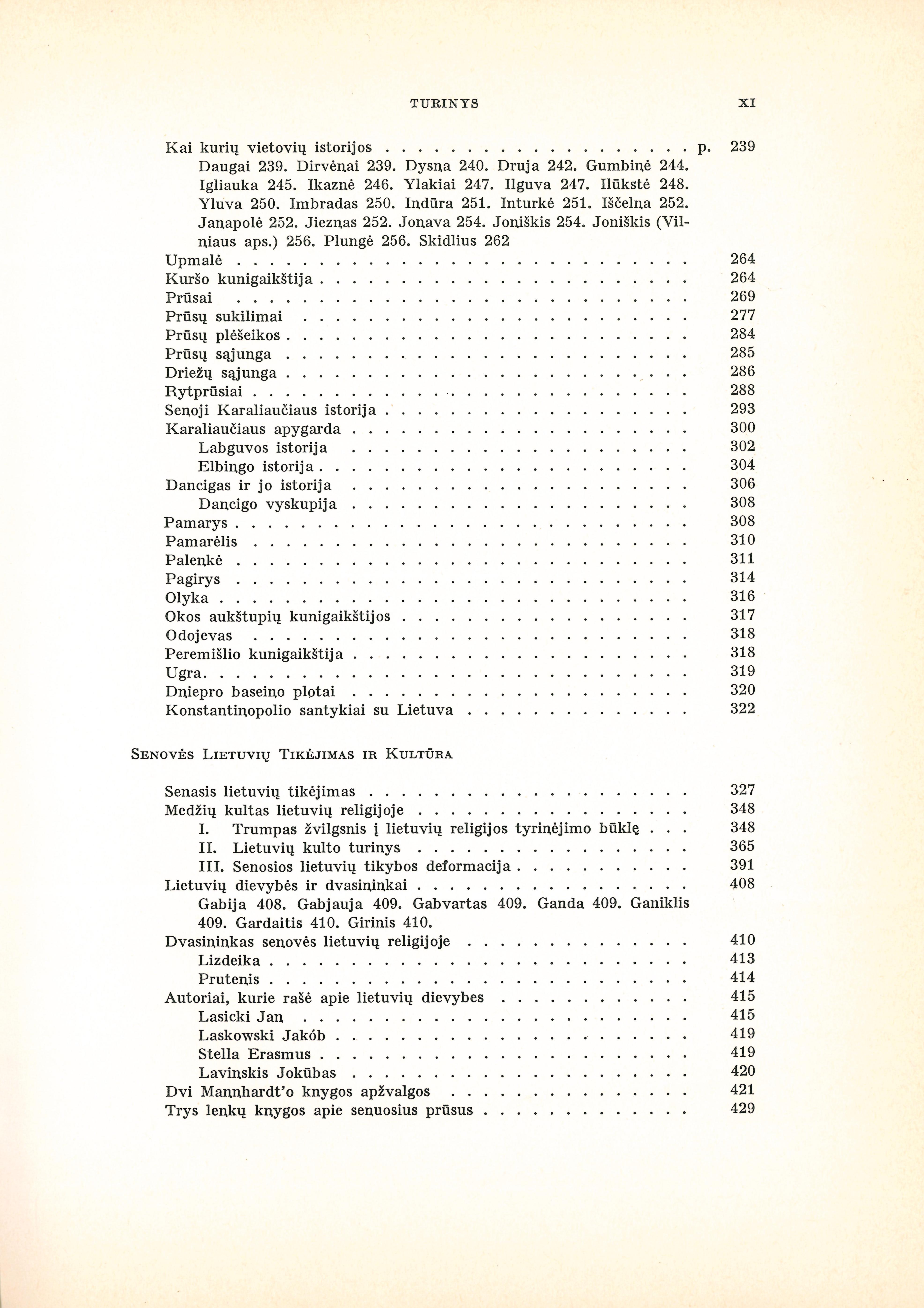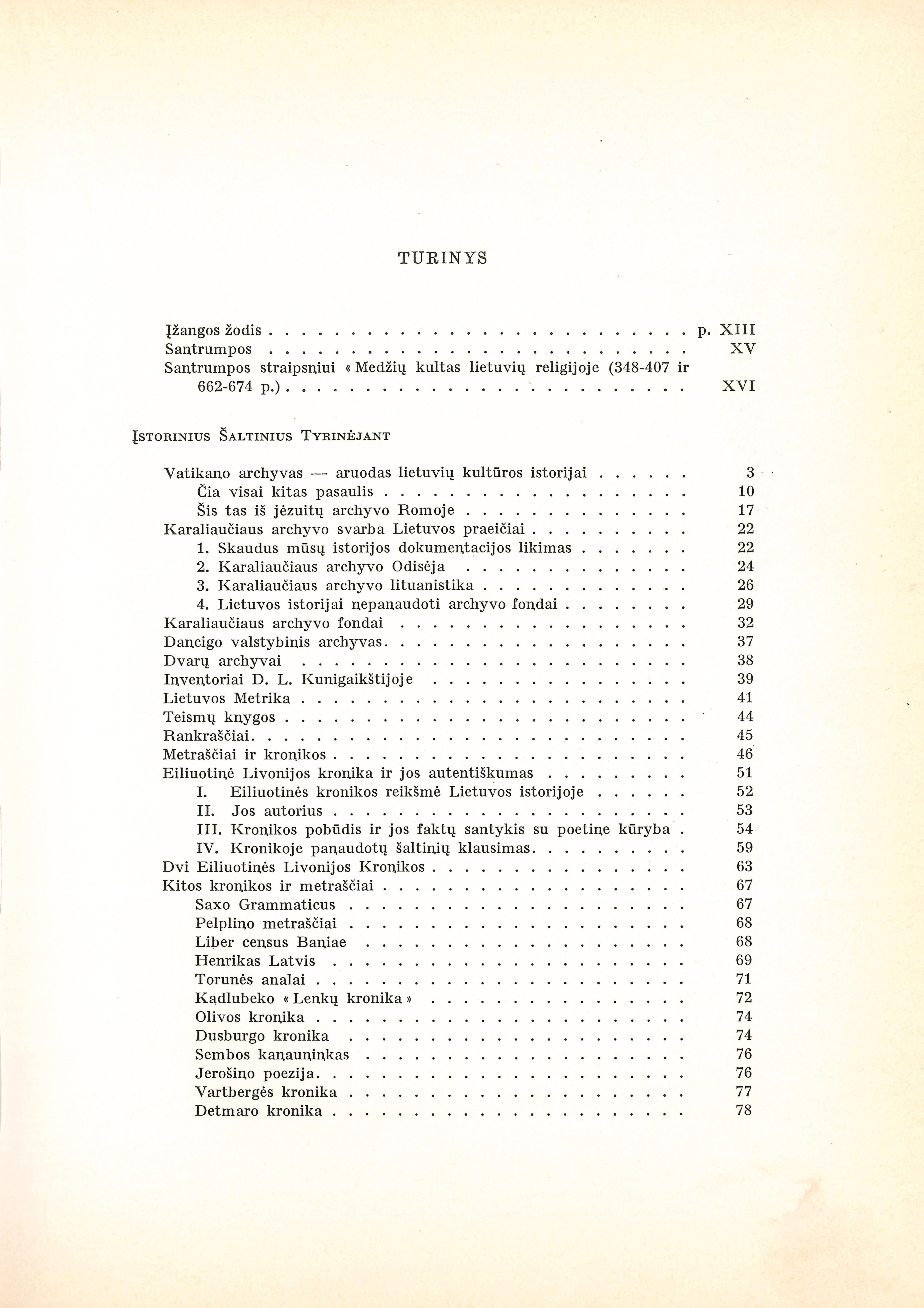 | 1. Istorinius šaltinius tyrinėjant (p. 103–116): Vatikano archyvas – aruodas Lietuvos kultūros istorijai (1950); Karaliaučiaus archyvo svarba Lietuvos praeičiai (1954); Kronikos ir metraščiai (iš Lietuvių enciklopedijos); Spausdinti šaltinių rinkiniai (iš Lietuvių enciklopedijos)2. Lietuvos kraštas ir kaimynai (p. 117–326): Straipsniai apie Didžiosios ir Mažosios Lietuvos vietoves iš Lietuvių enciklopedijos; Trakų Galvės ežero salos pilis (1941); Lietuvos vakarų sienos bei Klaipėdos klausimas Vytauto laikais (1933); Mažosios Lietuvos lietuviai (1953); Iš Mažosios Lietuvos kultūrinio gyvenimo XVI–XVIII amž. (1948). 3. Senovės lietuvių tikėjimas ir kultūra (p. 327–630): Senasis lietuvių tikėjimas (1944); Medžių kultas lietuvių religijoje (1938–39); Lietuvių dievybės ir dvasininkai (straipsnai iš Lietuvių enciklopedijos); Krikščioniškosios Vakarų Europos santykiai su pagoniškąja Lietuva (1933); Senosios Lietuvos vaidmuo Europos istorijoje (1936); Lietuvos reikšmė Europos Vakarams jų kultūros gynyboje (1956); Senosios lietuvių kultūros problemos (1937); Senovės lietuvių religijos bibliografija (1938). | |