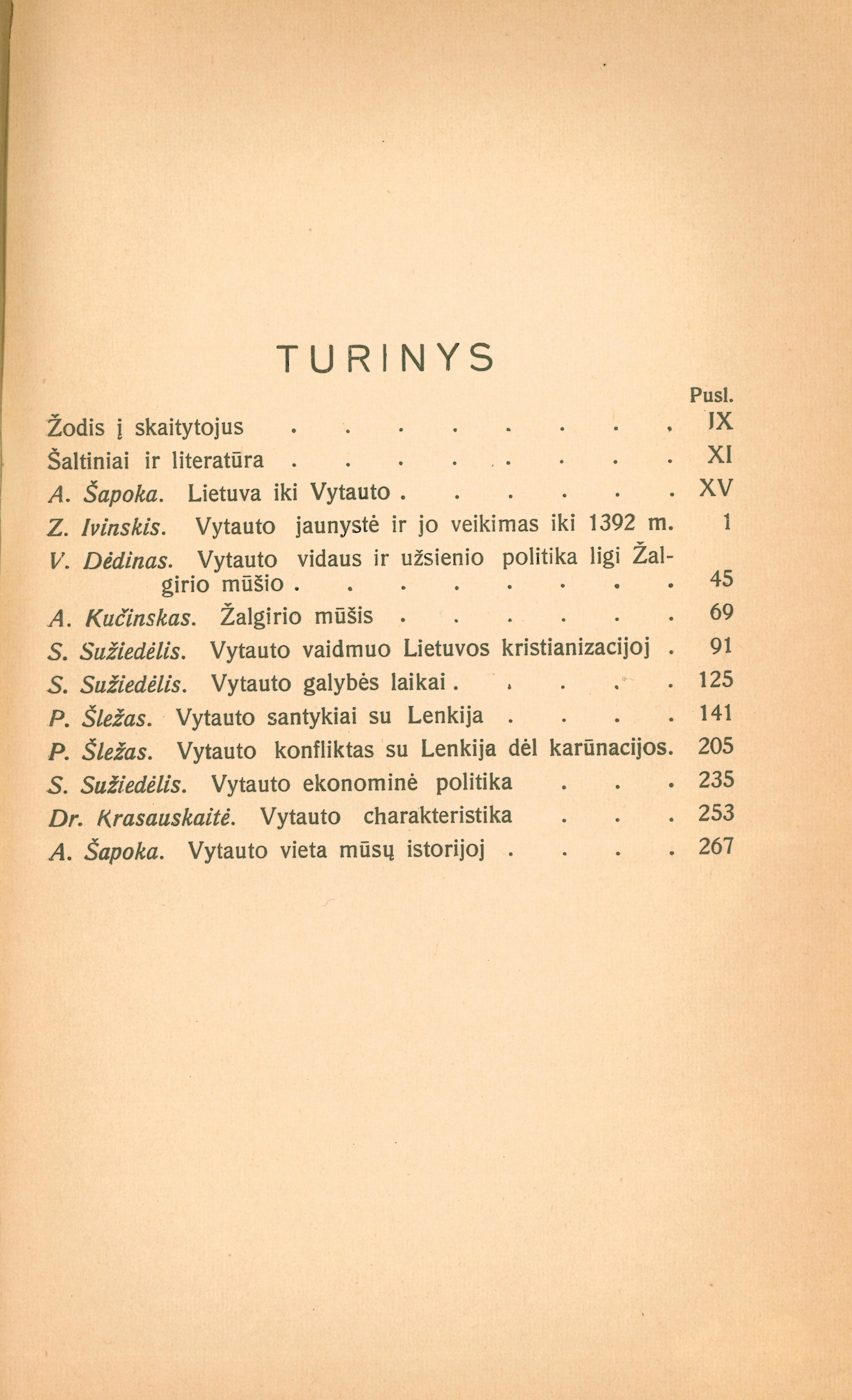| Turinys: Šapoka Adolfas. Lietuva iki Vytauto (p. XV–XXIV); Ivinskis Zenonas. Vytauto jaunystė ir jo veikimas iki 1392 m. (p. 1–44); Dėdinas Valentinas. Vytauto vidaus ir užsienio politika ligi Žalgirio mūšio (p. 45–68); Kučinskas Antanas. Žalgirio mūšis (p. 69–90); Sužiedėlis Simas. Vytauto vaidmuo Lietuvos kristianizacijoj (p. 91–124); Sužiedėlis Simas. Vytauto galybės laikai (p. 125–140); Šležas Paulius. Vytauto santykiai su Lenkija (p. 141–234); Šležas Paulius. Vytauto konfliktas su Lenkija dėl karūnacijos (p. 205234); Sužiedėlis Simas. Vytauto ekonominė politika (p. 235–252); Krasauskaitė Marija. Vytauto charakteristika (p. 253–266); Šapoka Adolfas. Vytauto vieta mūsų istorijoj (p. 267–293). [lt] | |
