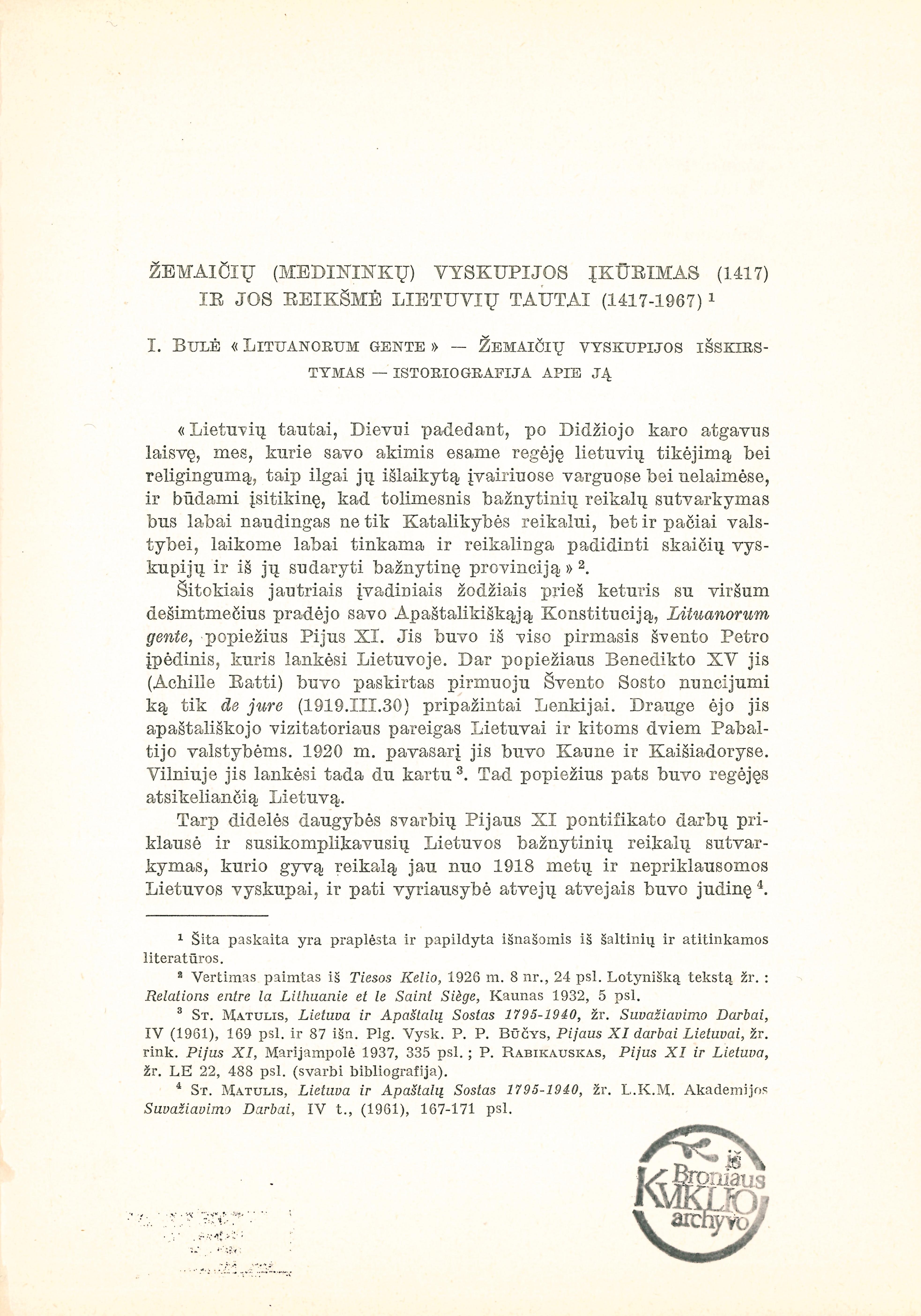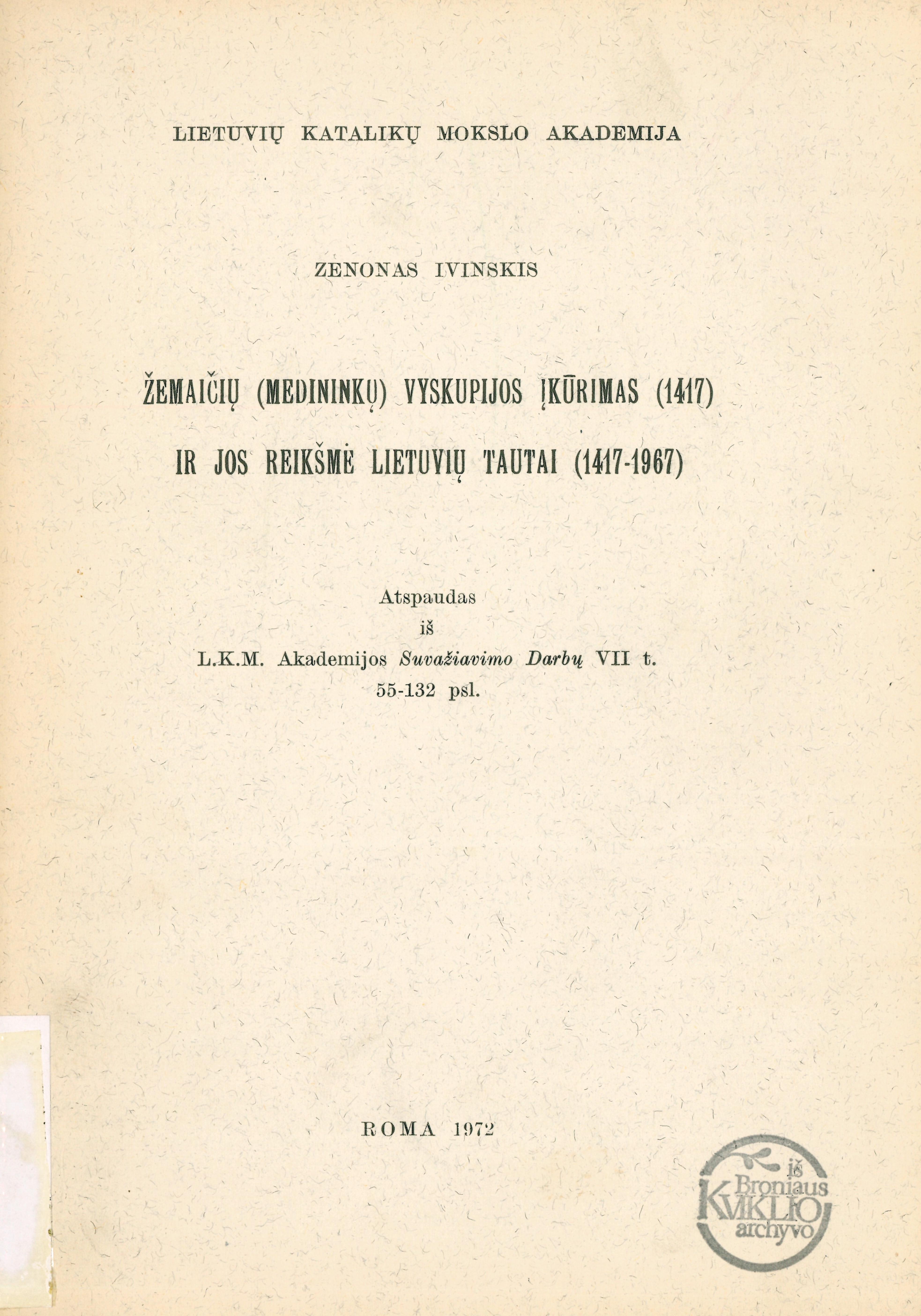 | Antraštė | Žemaičių (Medininkų) vyskupijos įkūrimas (1417) ir jos reikšmė lietuvių tautai (1417–1967) / Zenonas Ivinskis. In: Lietuvių katalikų mokslo akademijos suvažiavimo darbai. T. 7 [1967 m. suvažiavimas] (1972), p. 55-132. [lt] |